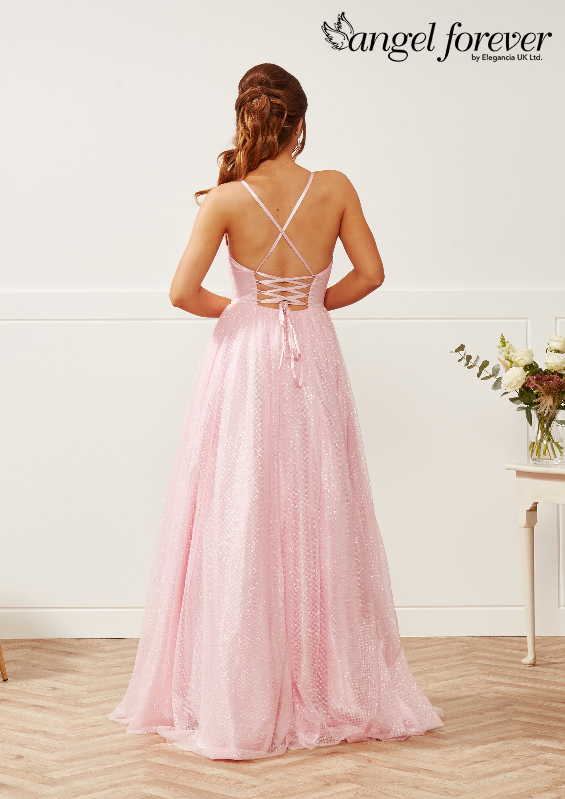 Did someone say sparkles? This beautiful ballgown features a plunge bodice, lace up back and glitter all over.