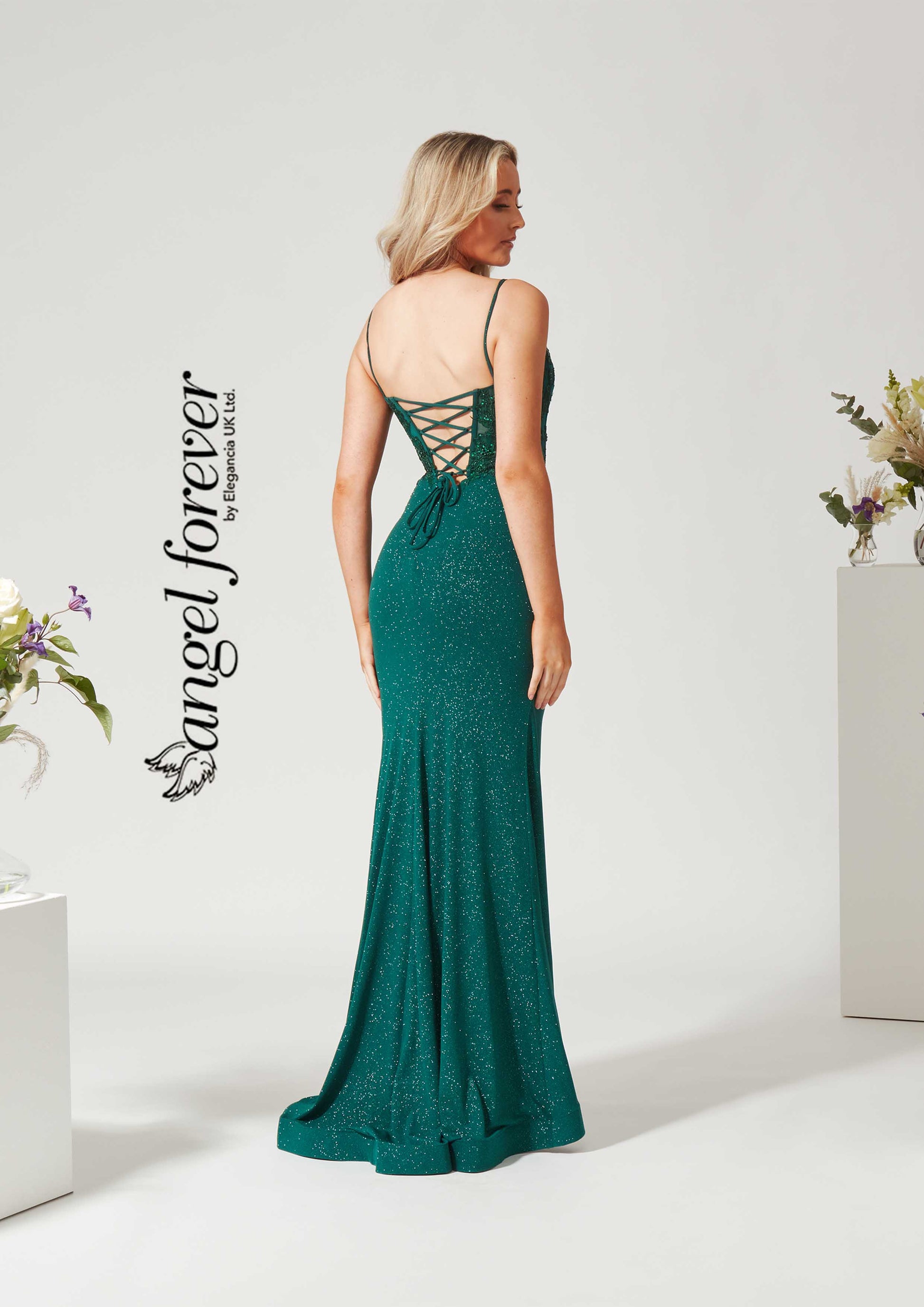 Stunning jersey glitter fitted dress with a corset bodice and lace appliques. Such an elegant style!
