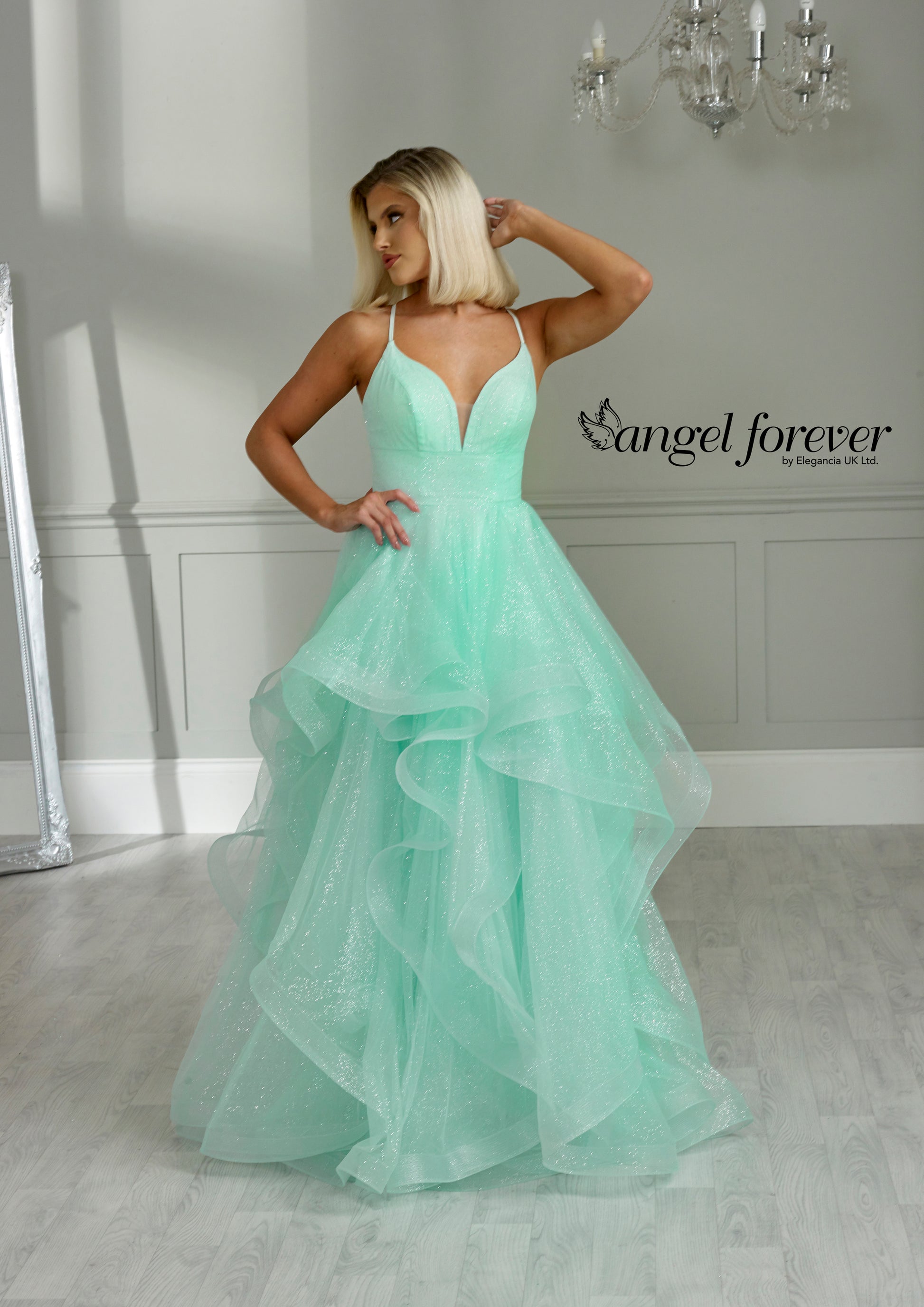 Feel like a princess in this ruffle ballgown! It features a sweetheart plunge with a mesh insert, thin straps and a lace up back.