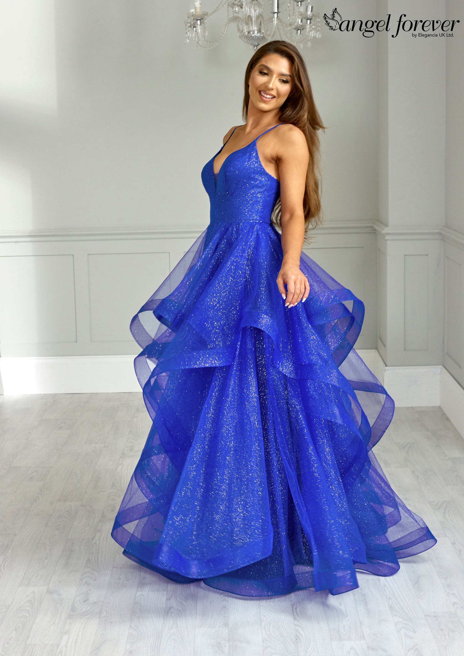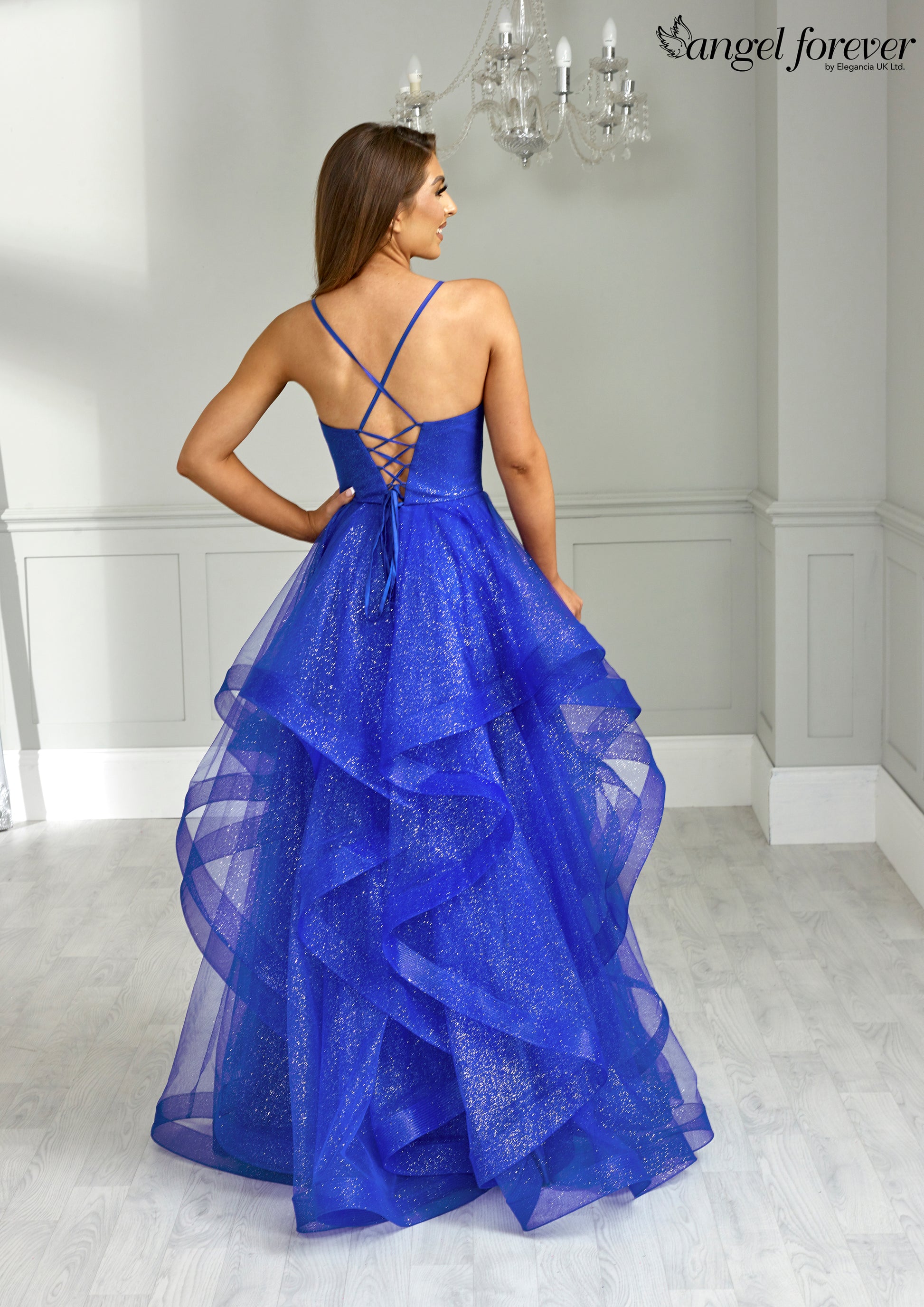 Feel like a princess in this ruffle ballgown! It features a sweetheart plunge with a mesh insert, thin straps and a lace up back.