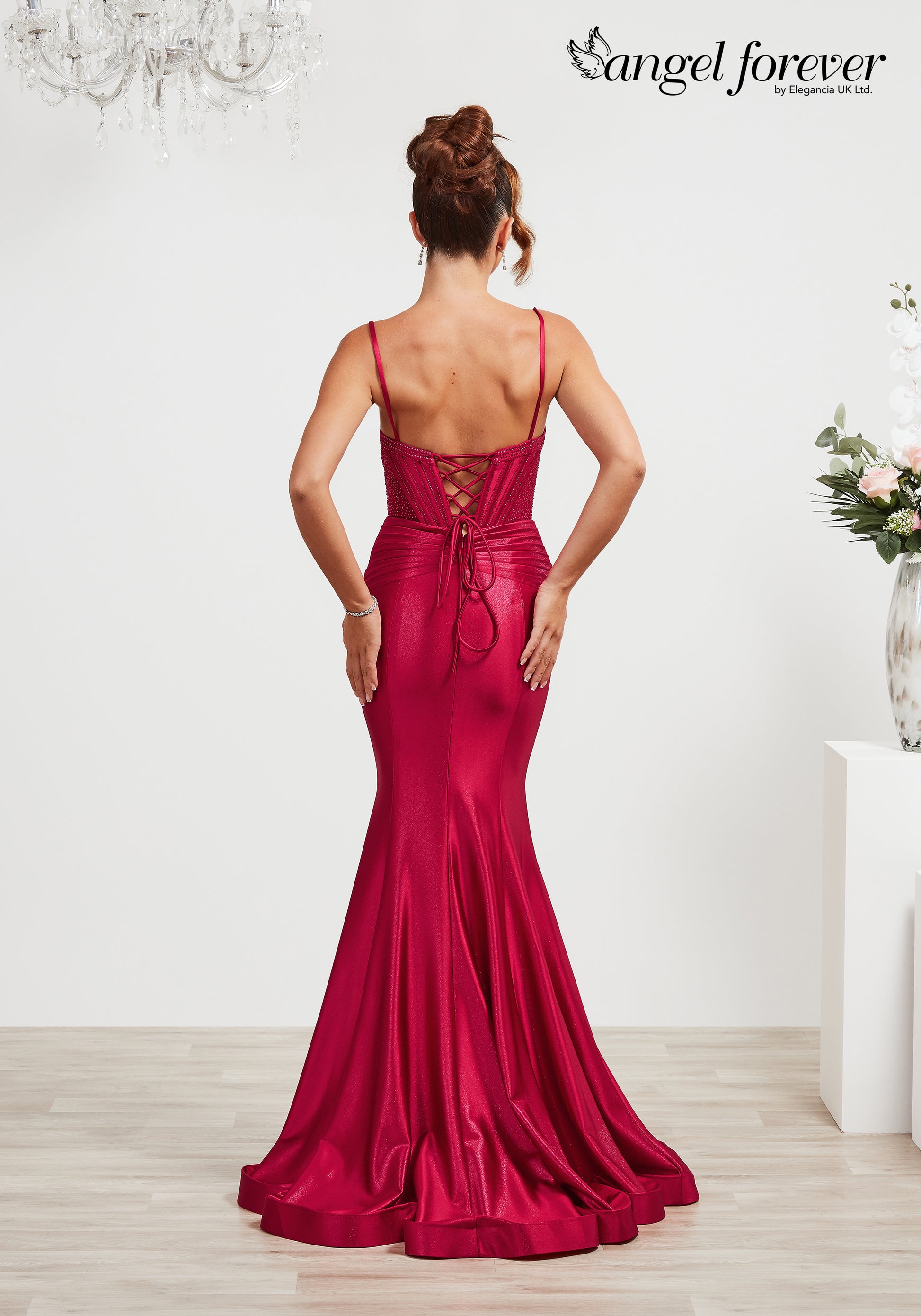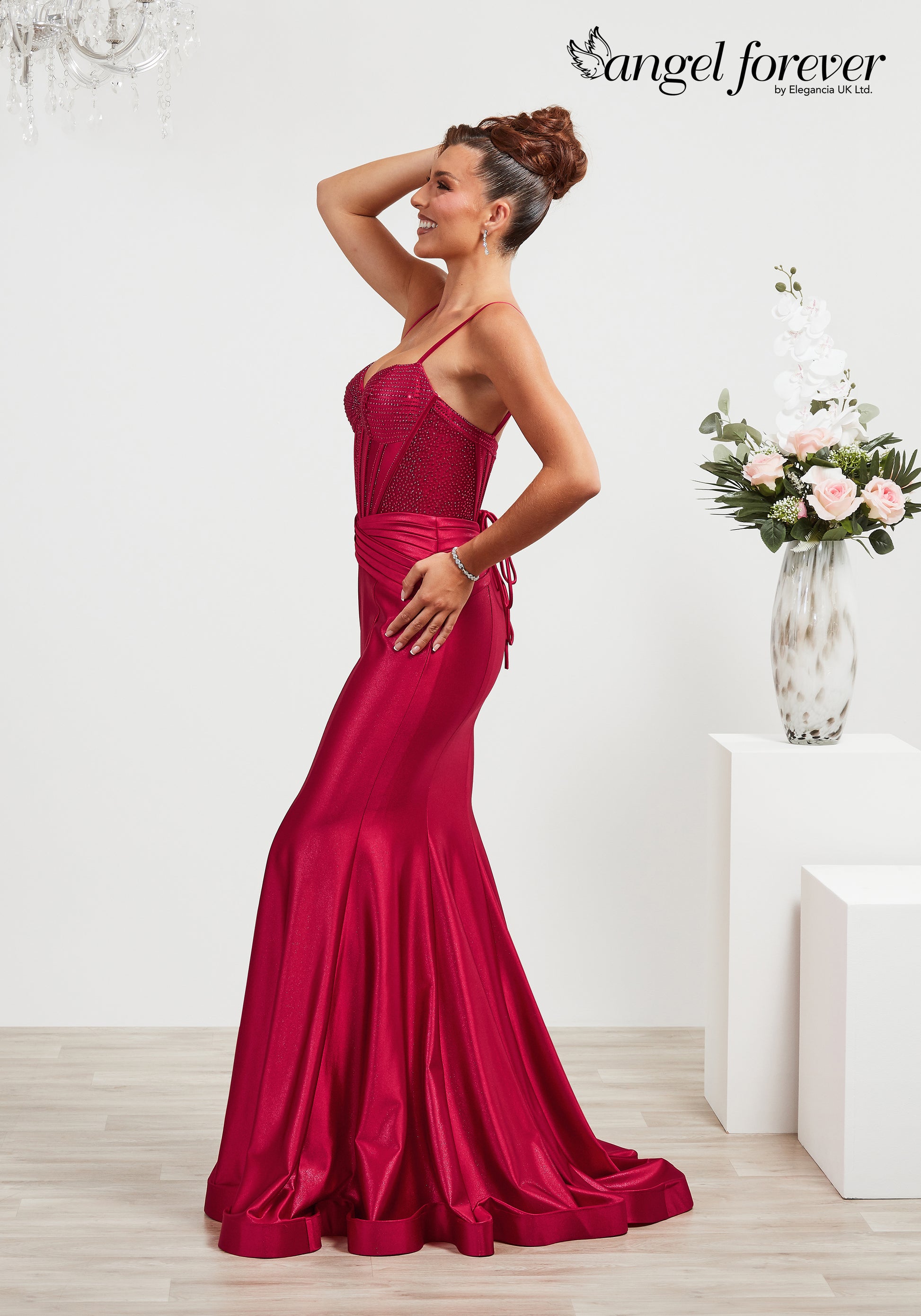 A satin fitted gown with an embellished bodice, waist wrap detail and a lace up back.