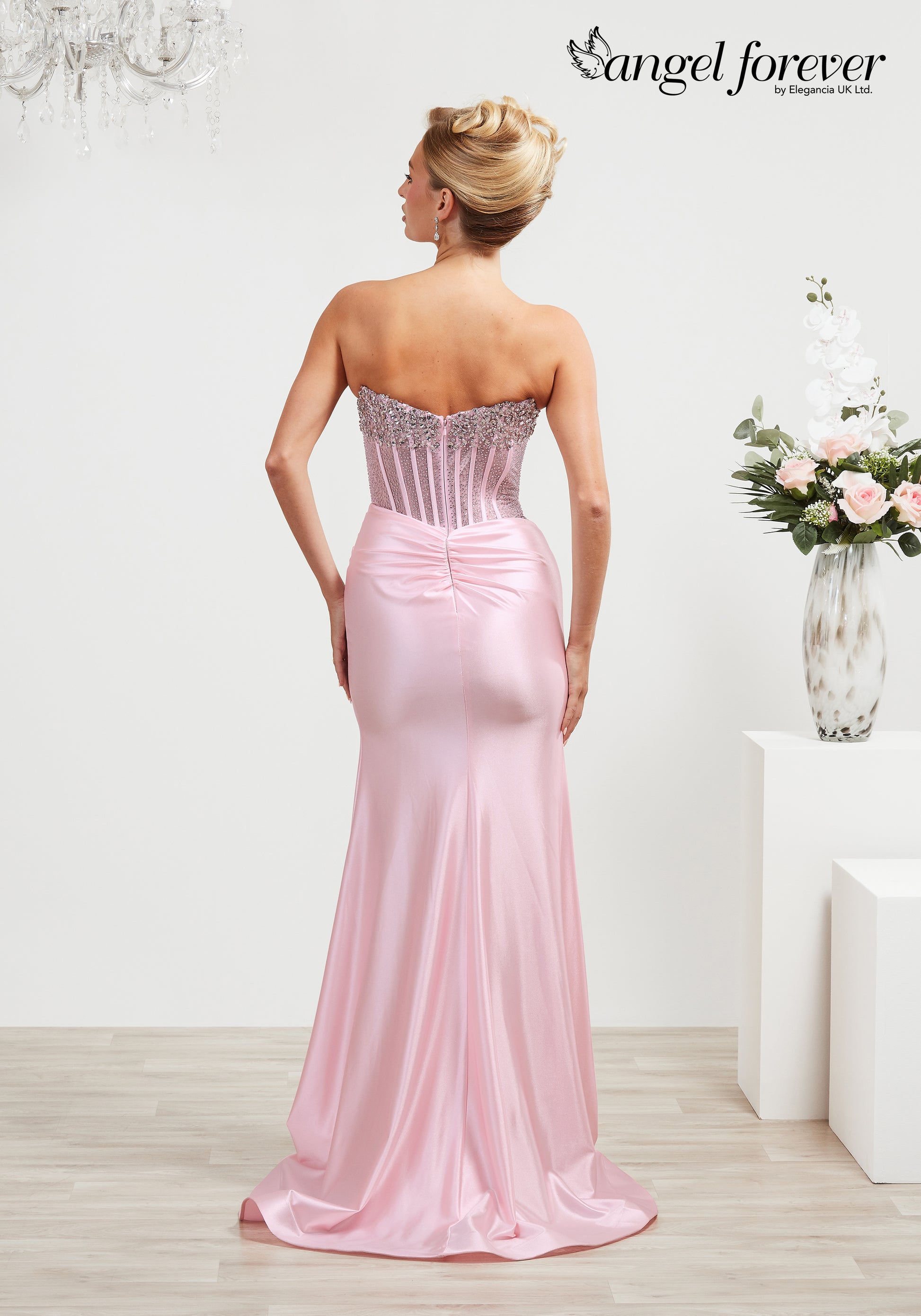 A satin fitted gown with a strapless jewelled bodice, asymmetric waistline and a thigh high slit.