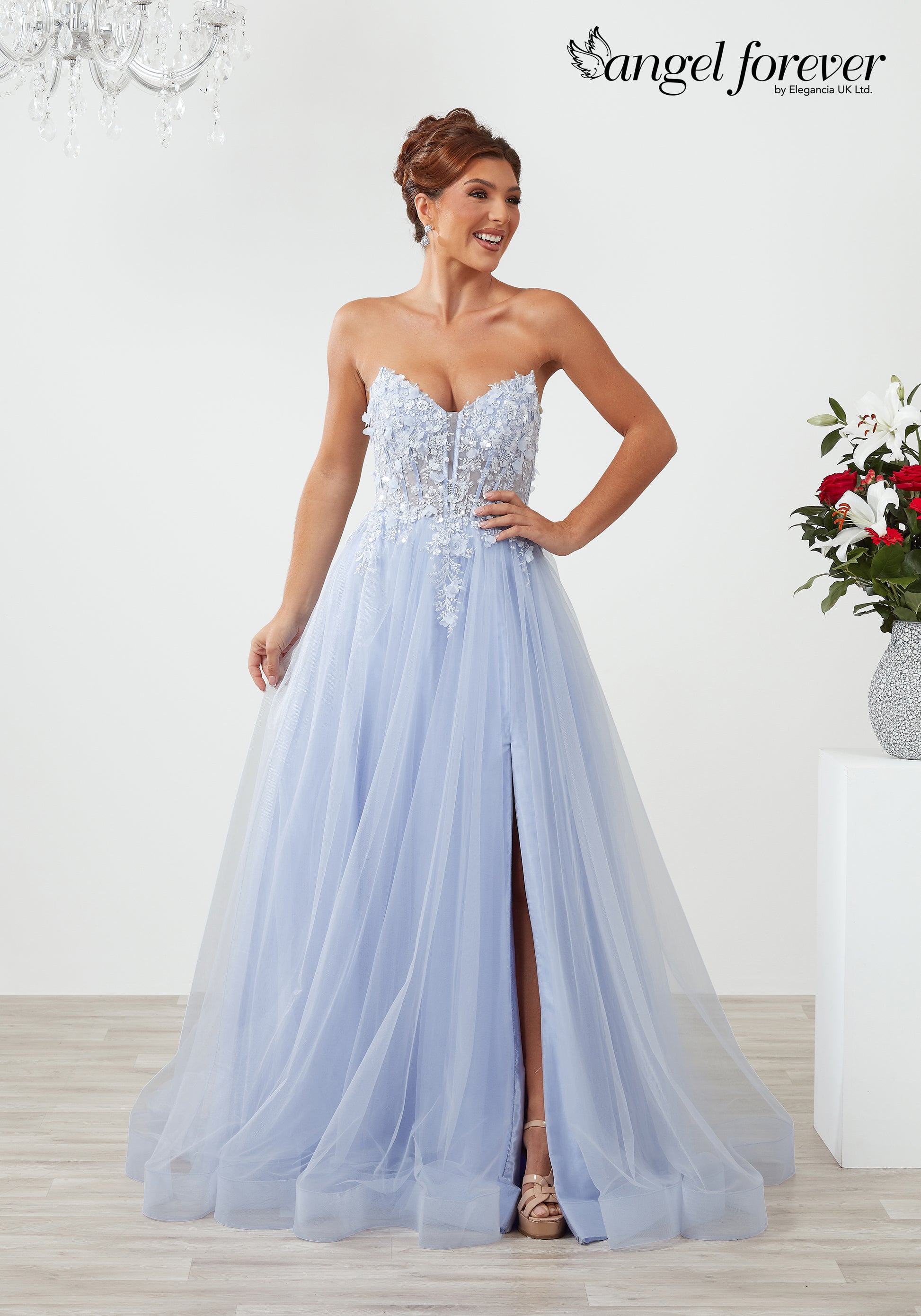 Dreamy A - line gown with embroidered strapless bodice, tulle skirt and a leg split.