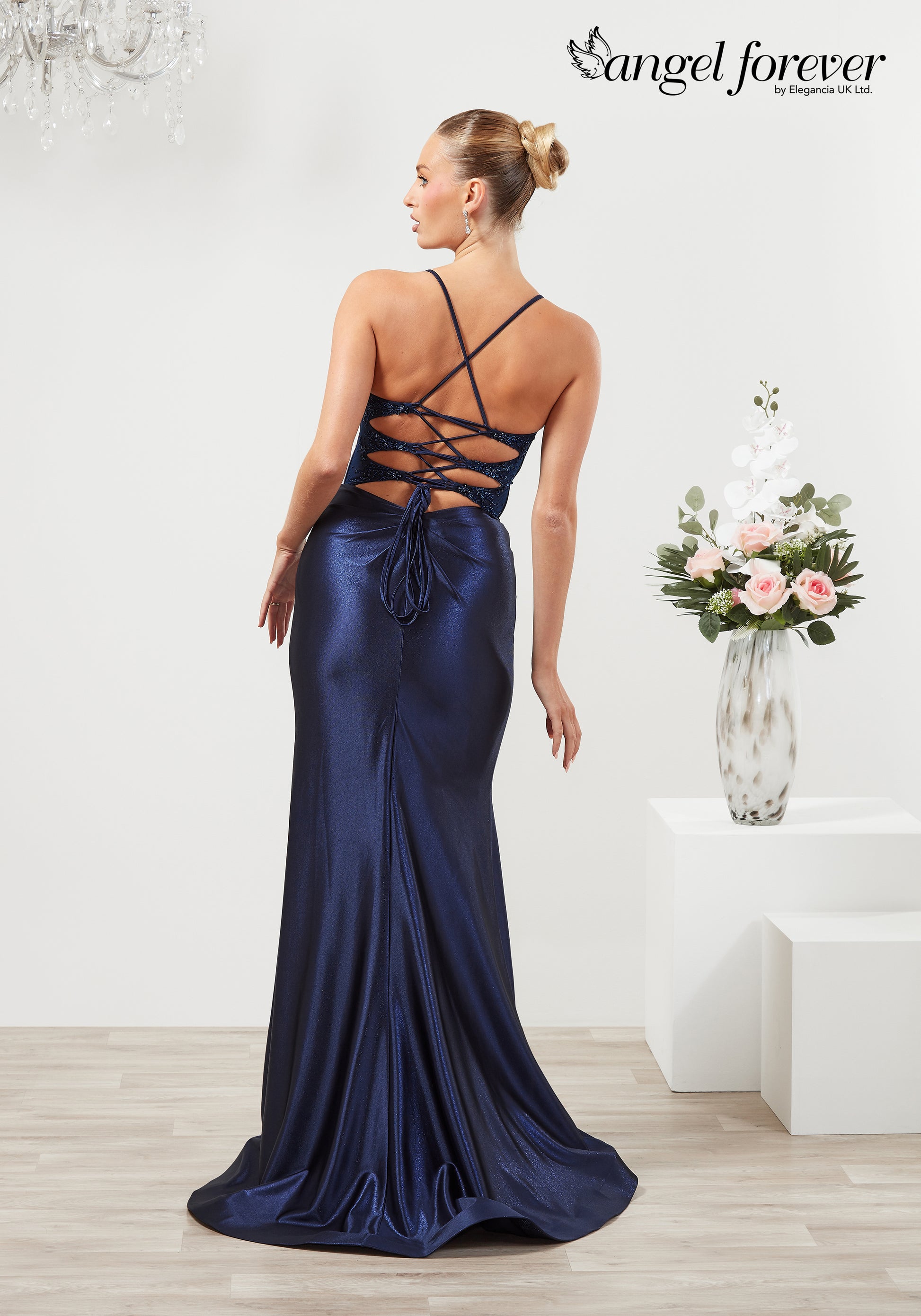 Stunning satin fitted gown with embellished corset bodice, lace up back and thigh high slit.