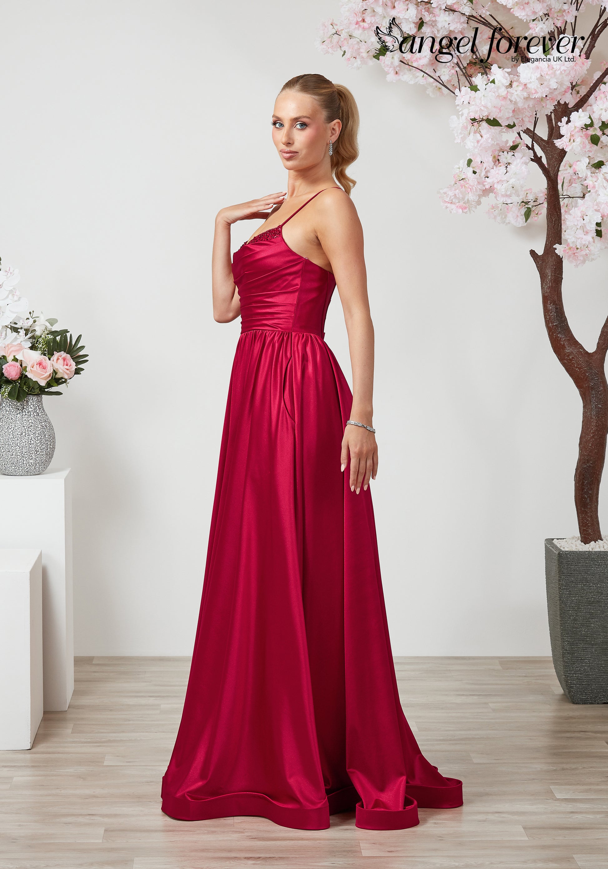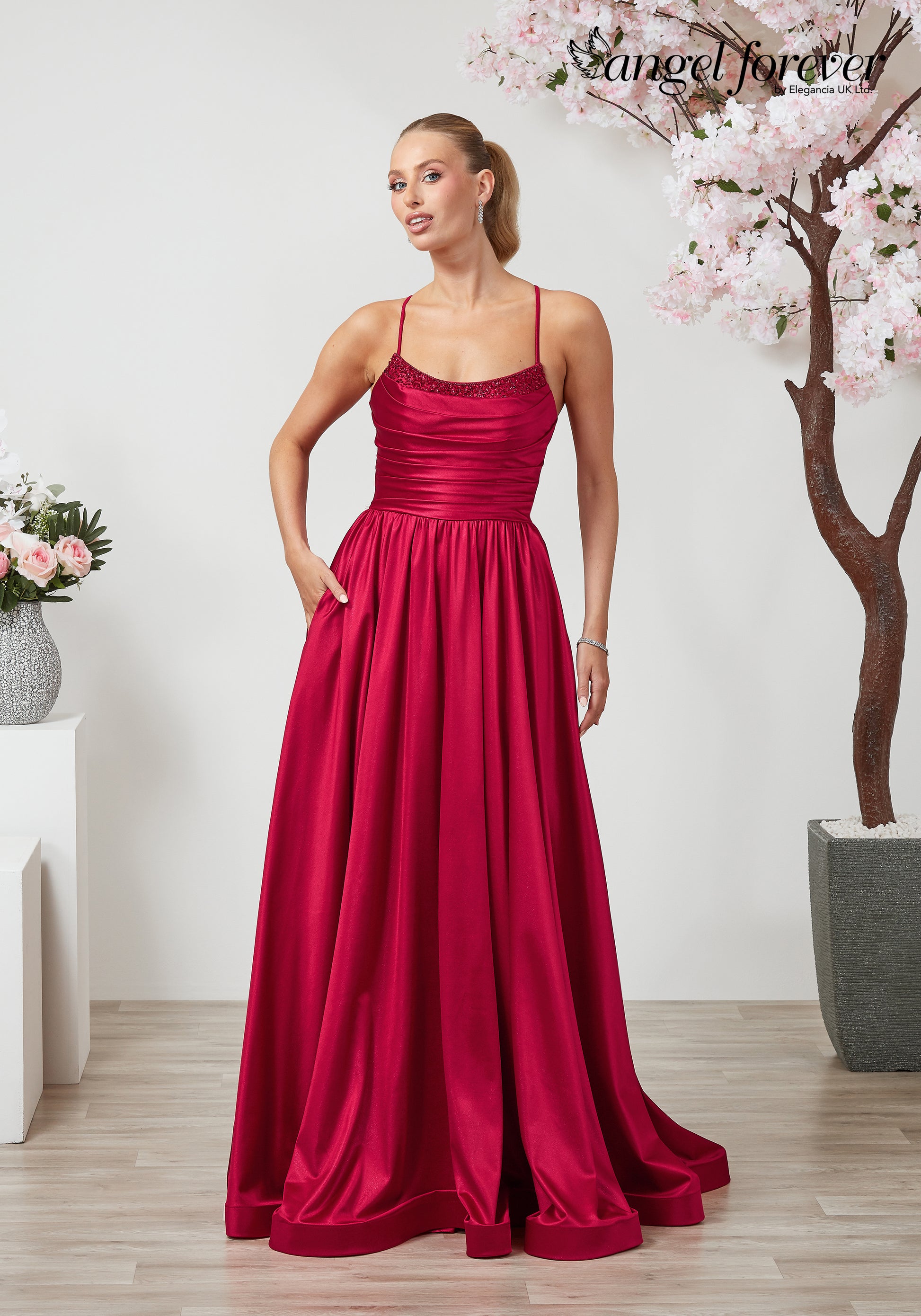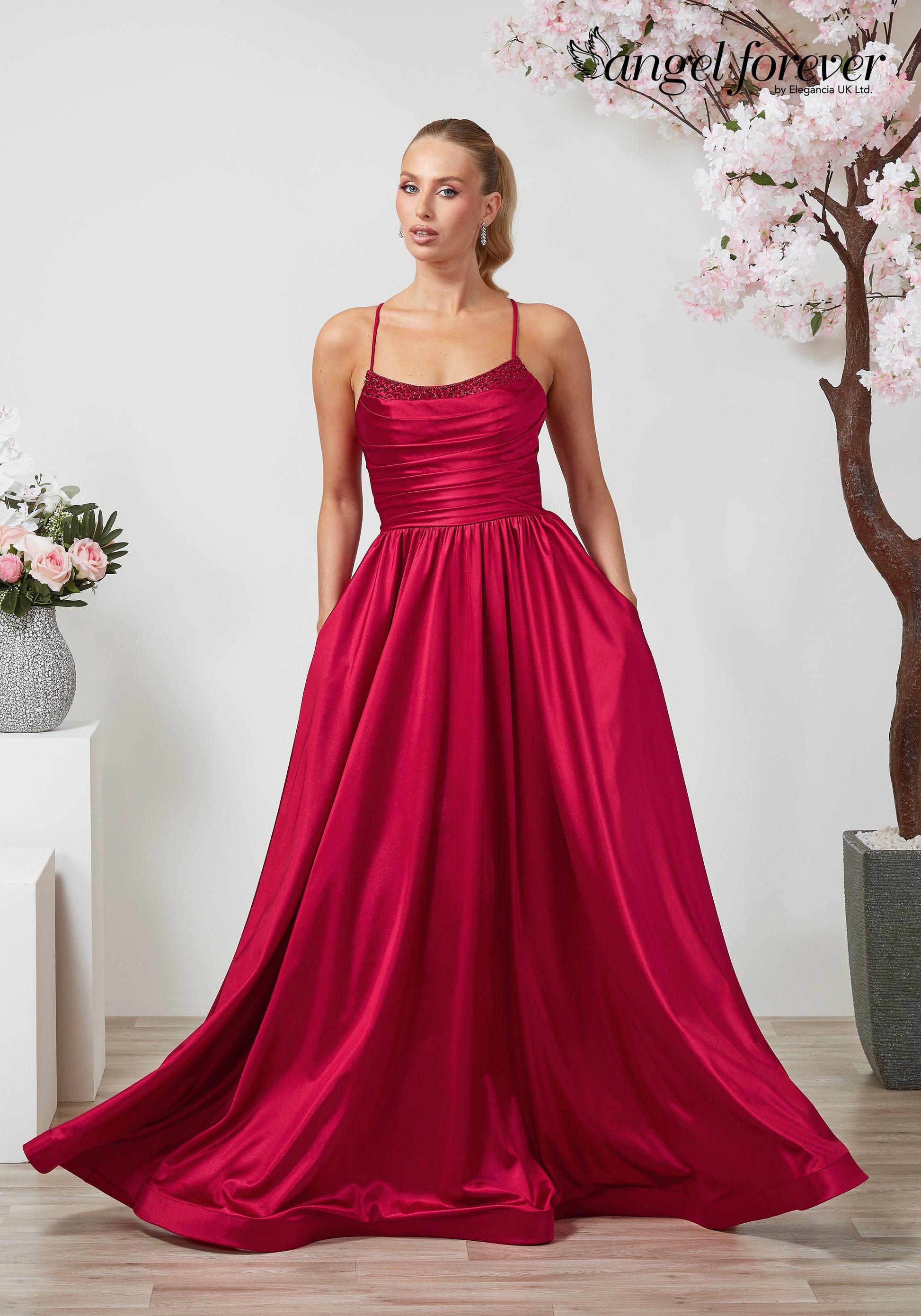 A satin A - line gown with a scoop neckline, ruched bodice, embellishments, and a lace up back.