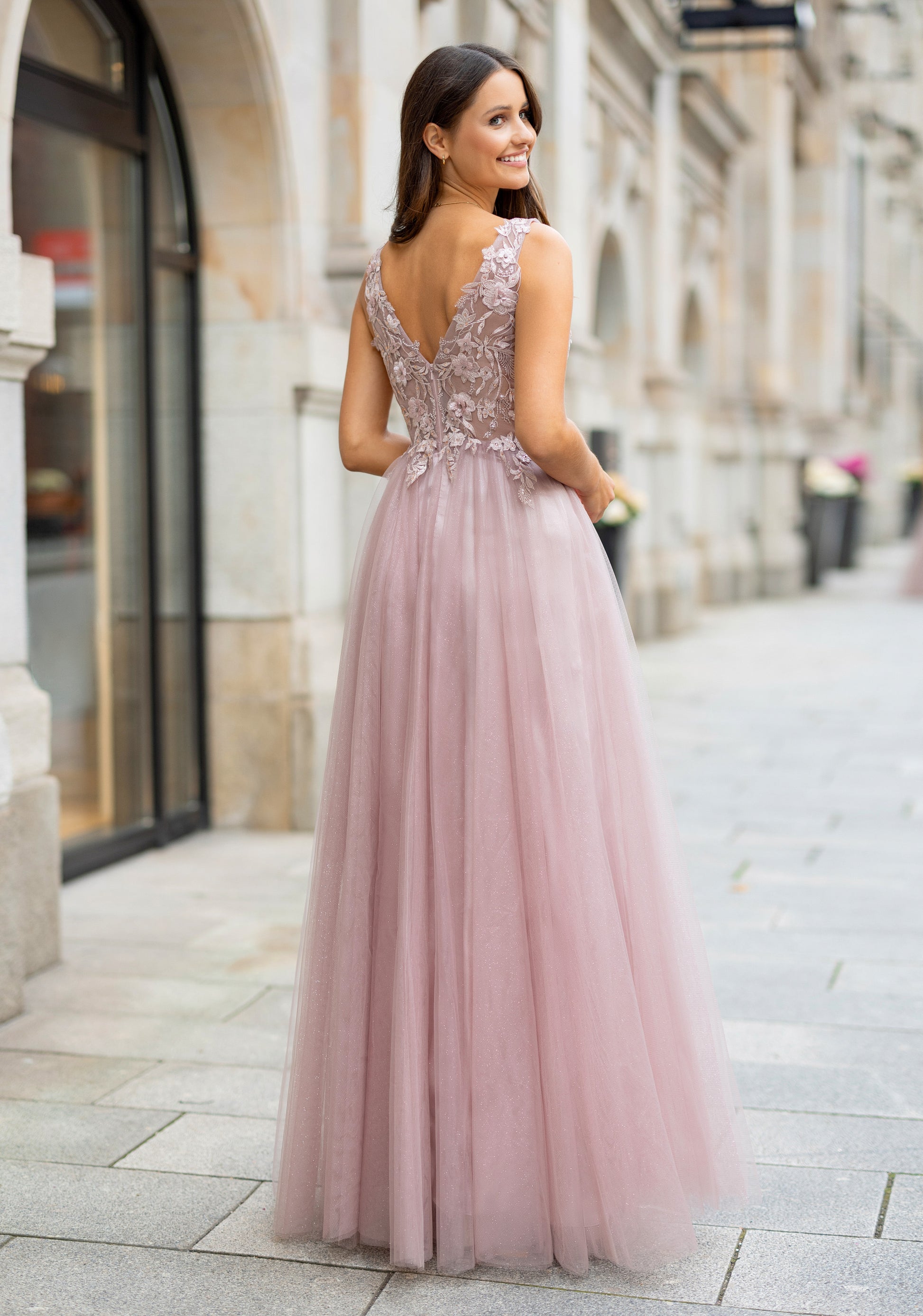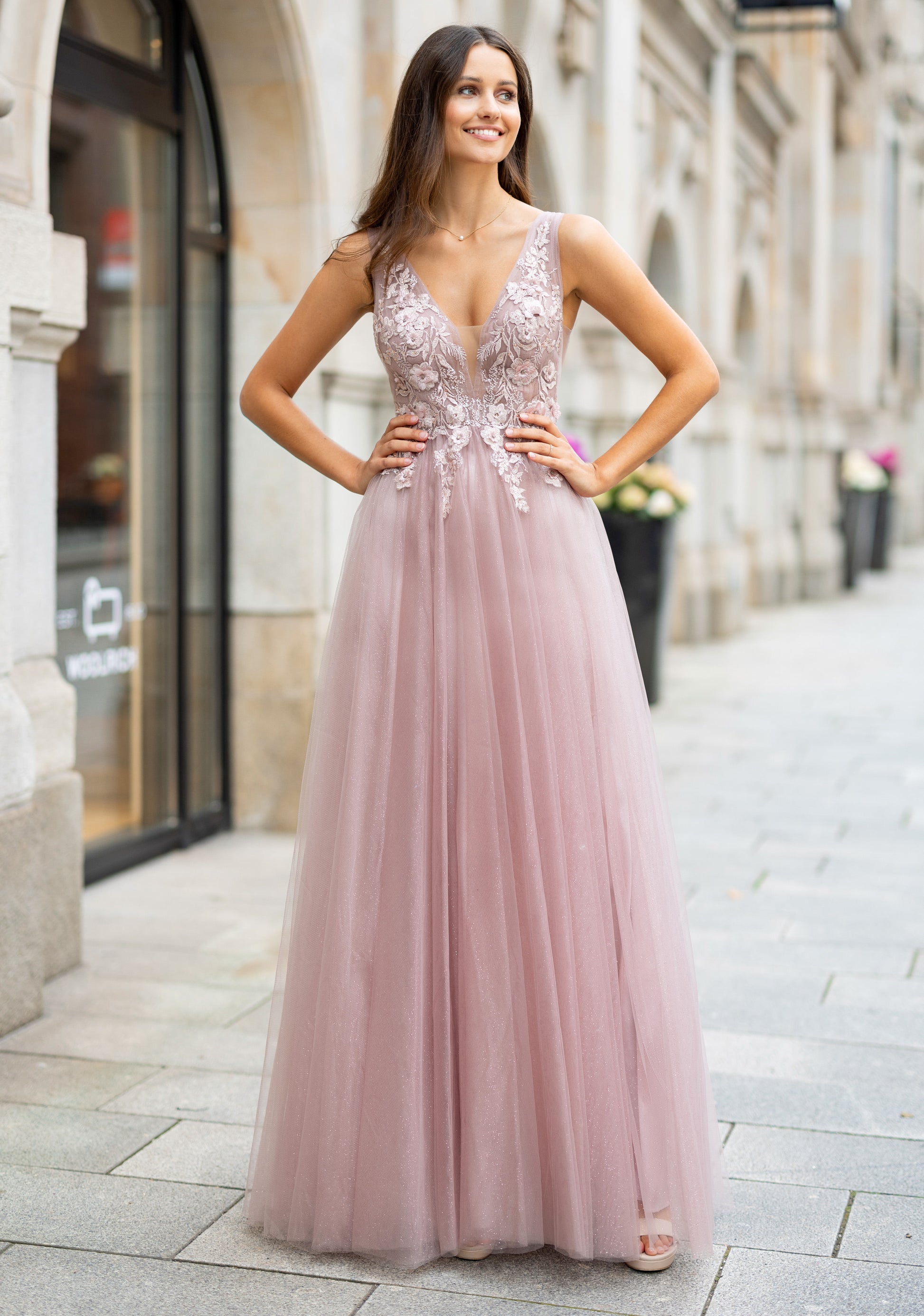 A beautiful A - line gown with a deep plunge bodice, side mesh panels, lace embroidered bodice and glitter tulle skirt.