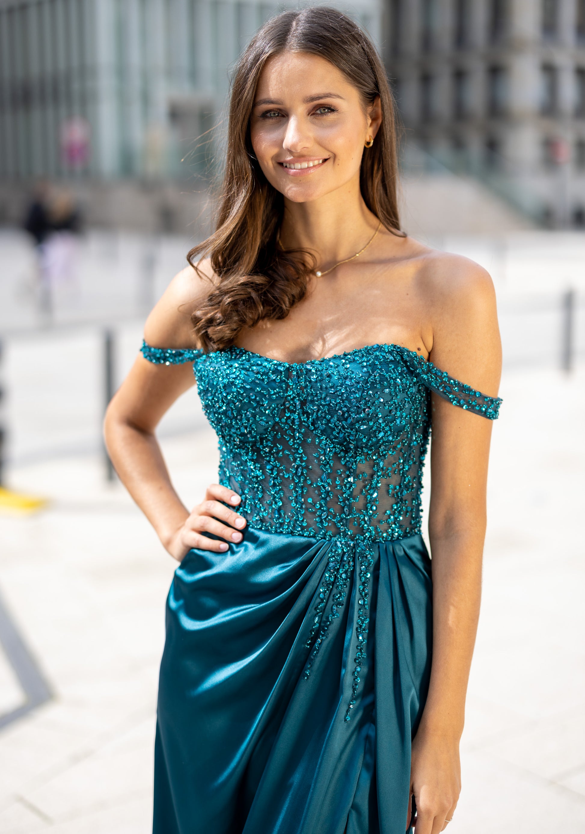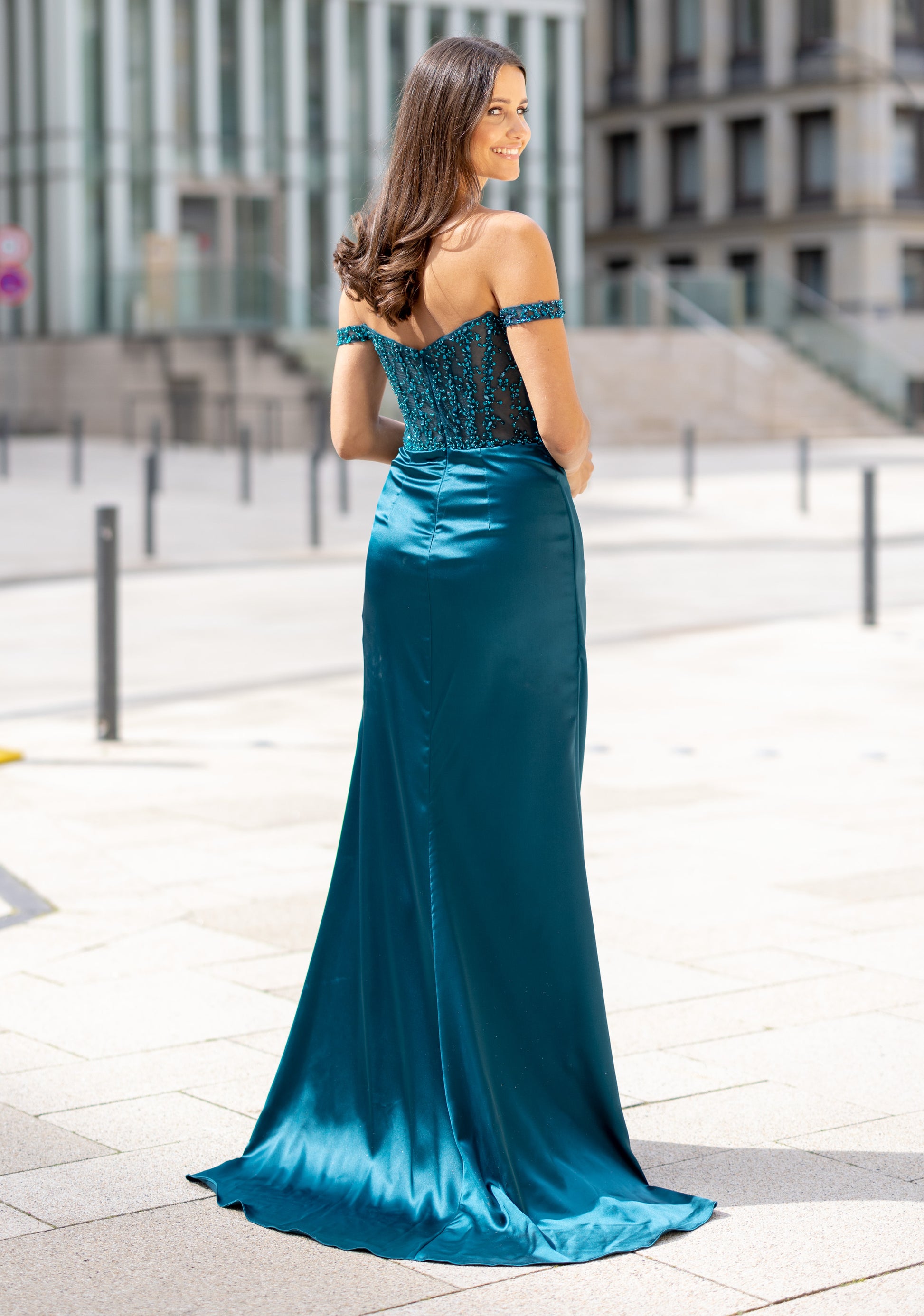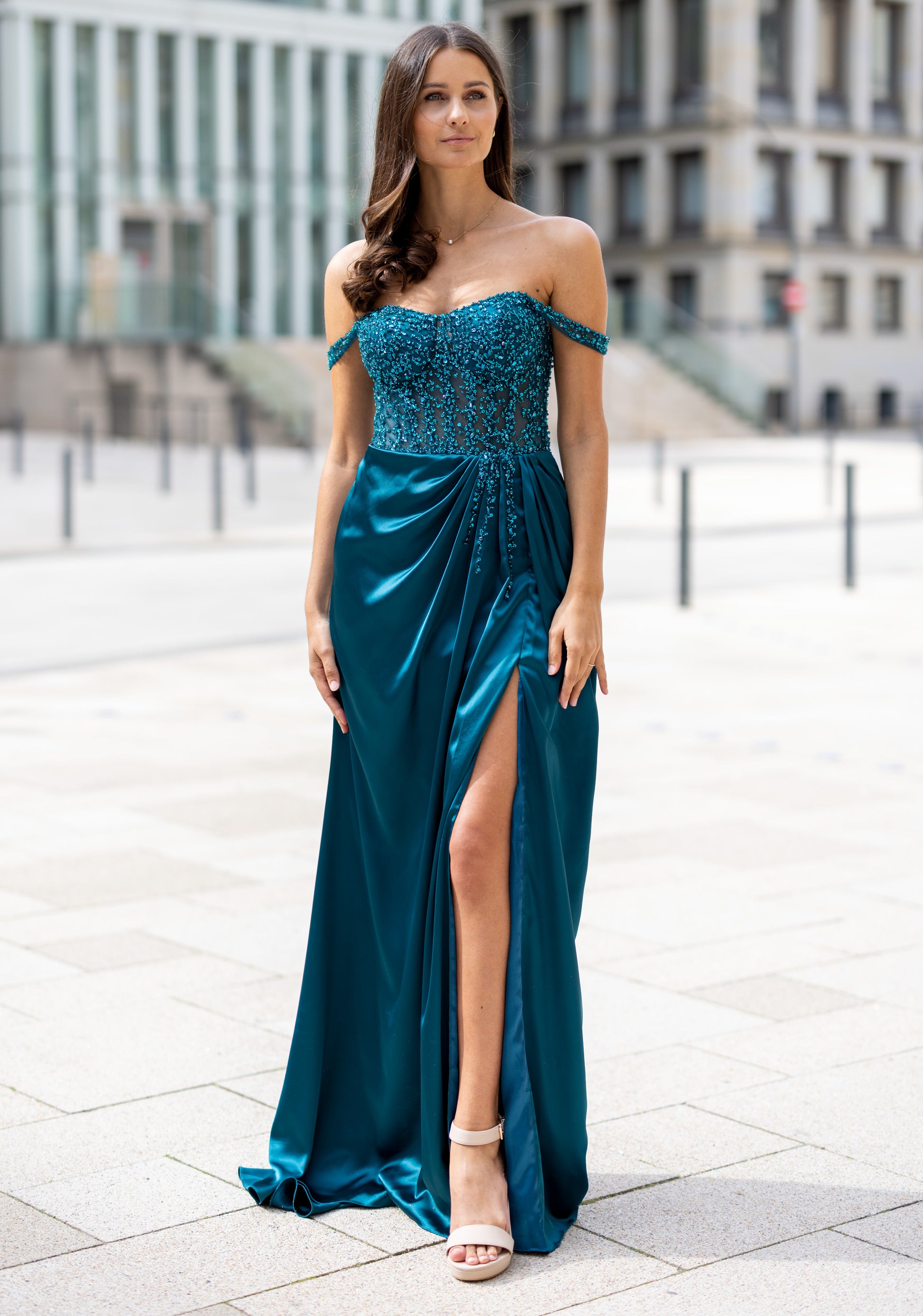A beautiful satin style featuring a full embellished mesh bodice, off the shoulder straps and a ruched thigh high leg split.