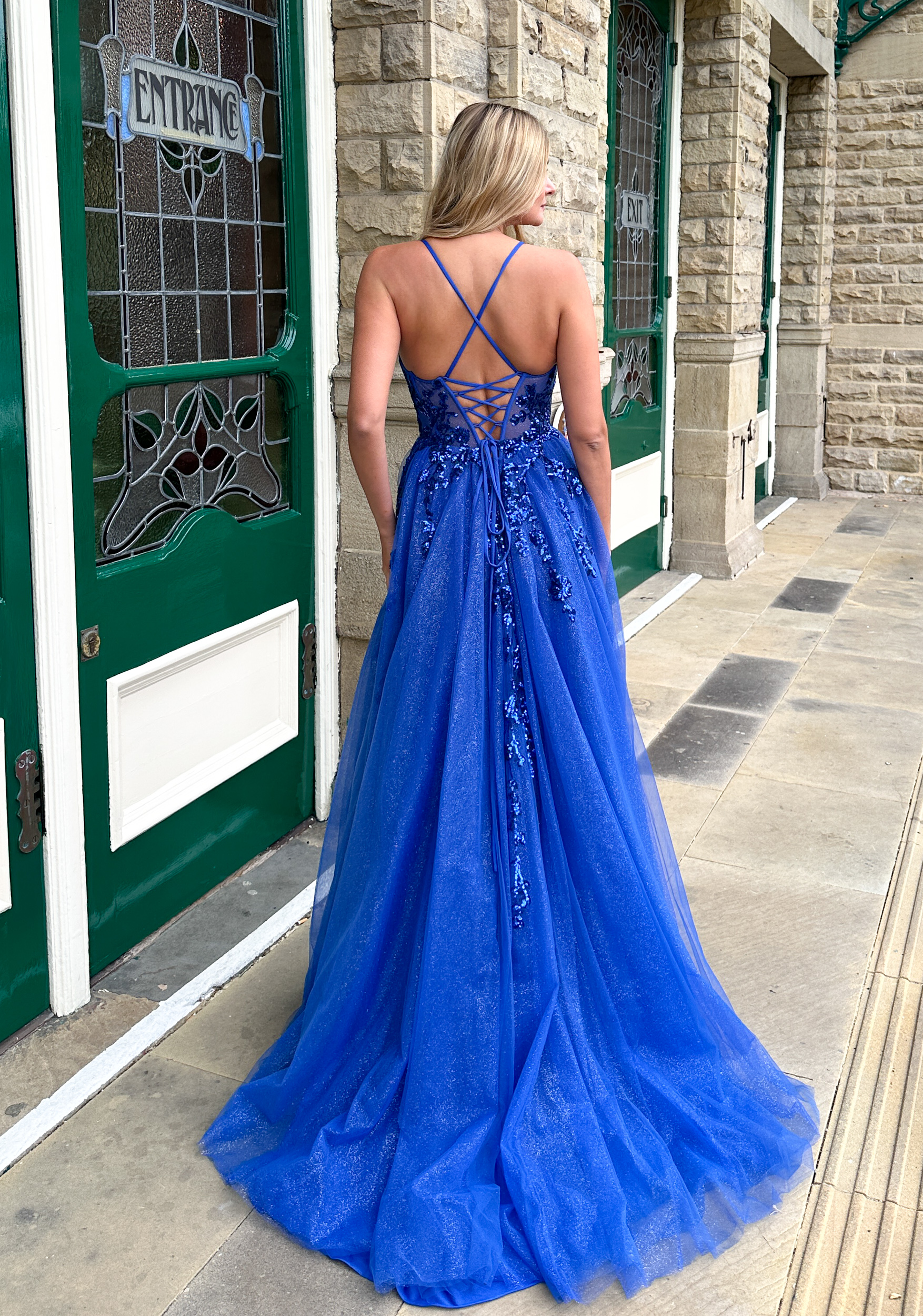 A stunning A - line gown featuring a corset style bodice with sequin lace appliques, a lace up back and a glitter tulle skirt.