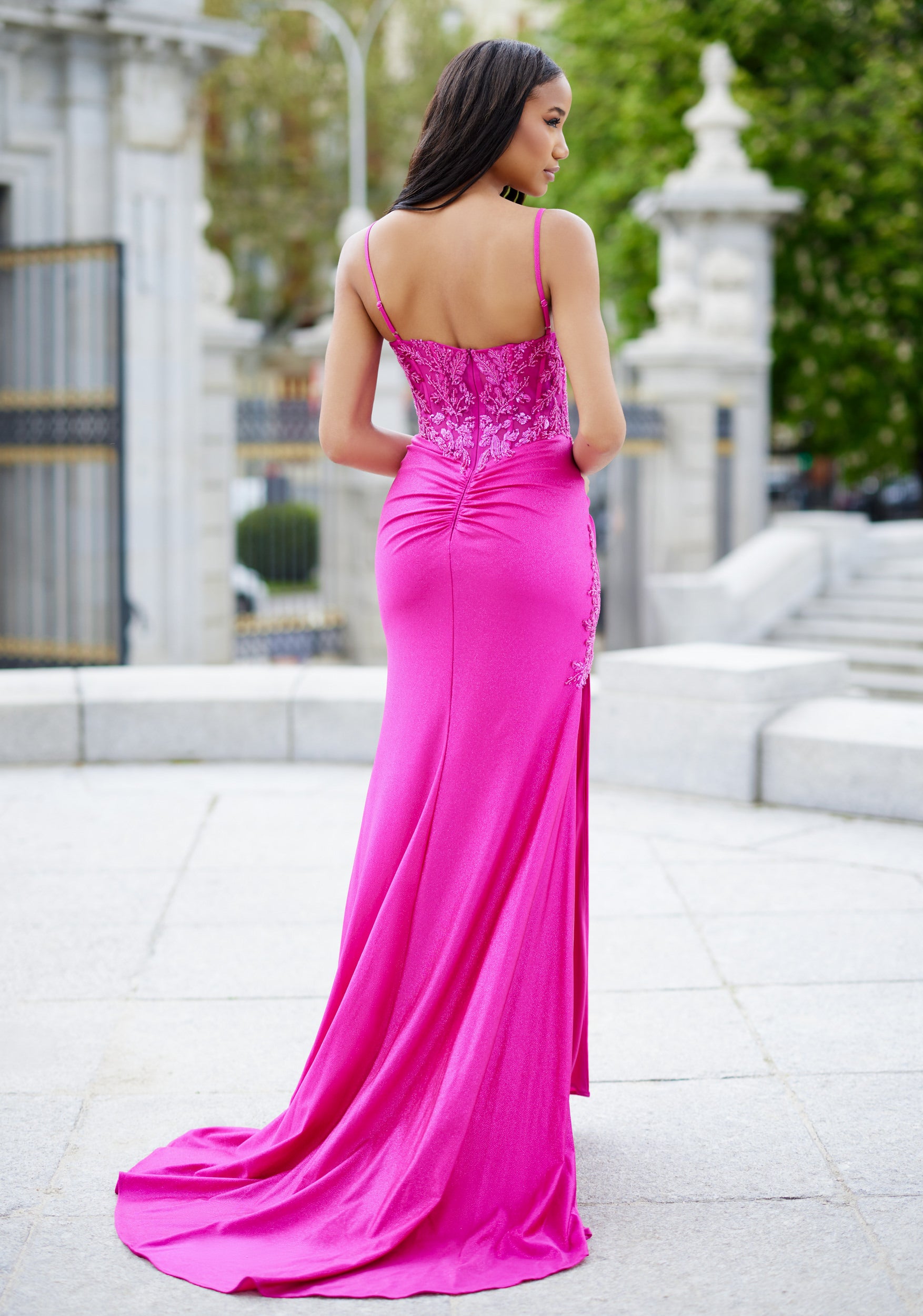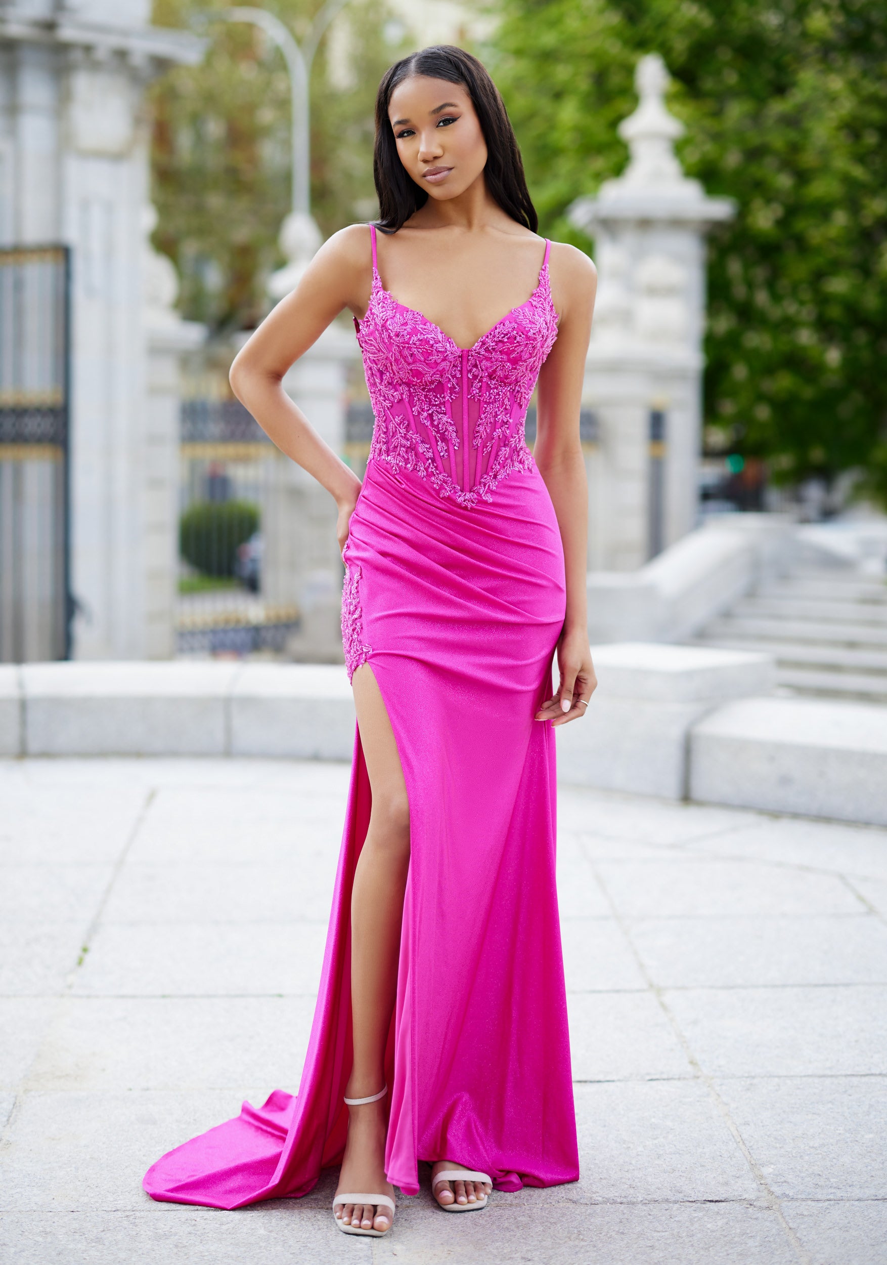 A jersey glitter gown, featuring feather a lace embroidered corset bodice, a thigh high split and a lace leg insert.