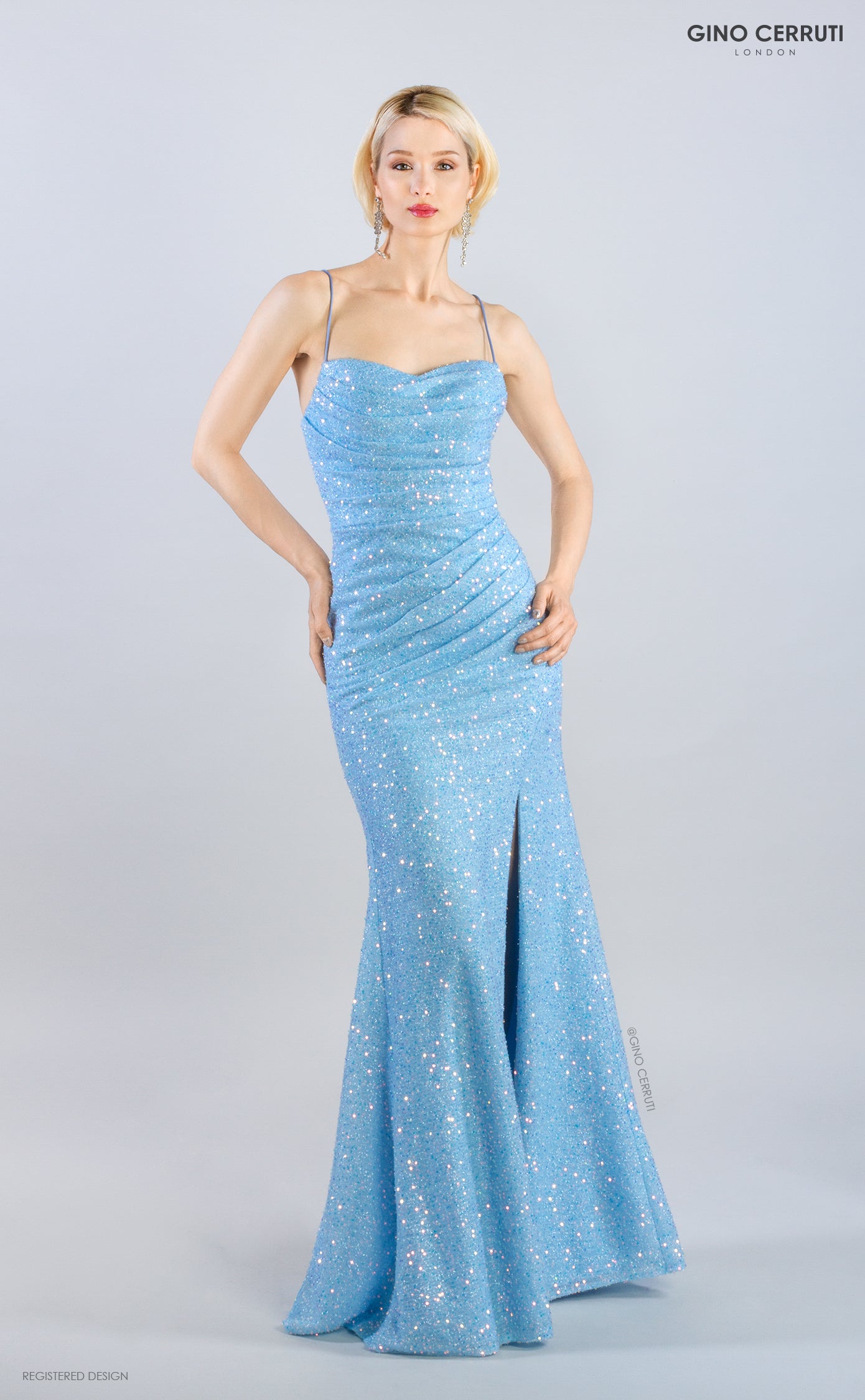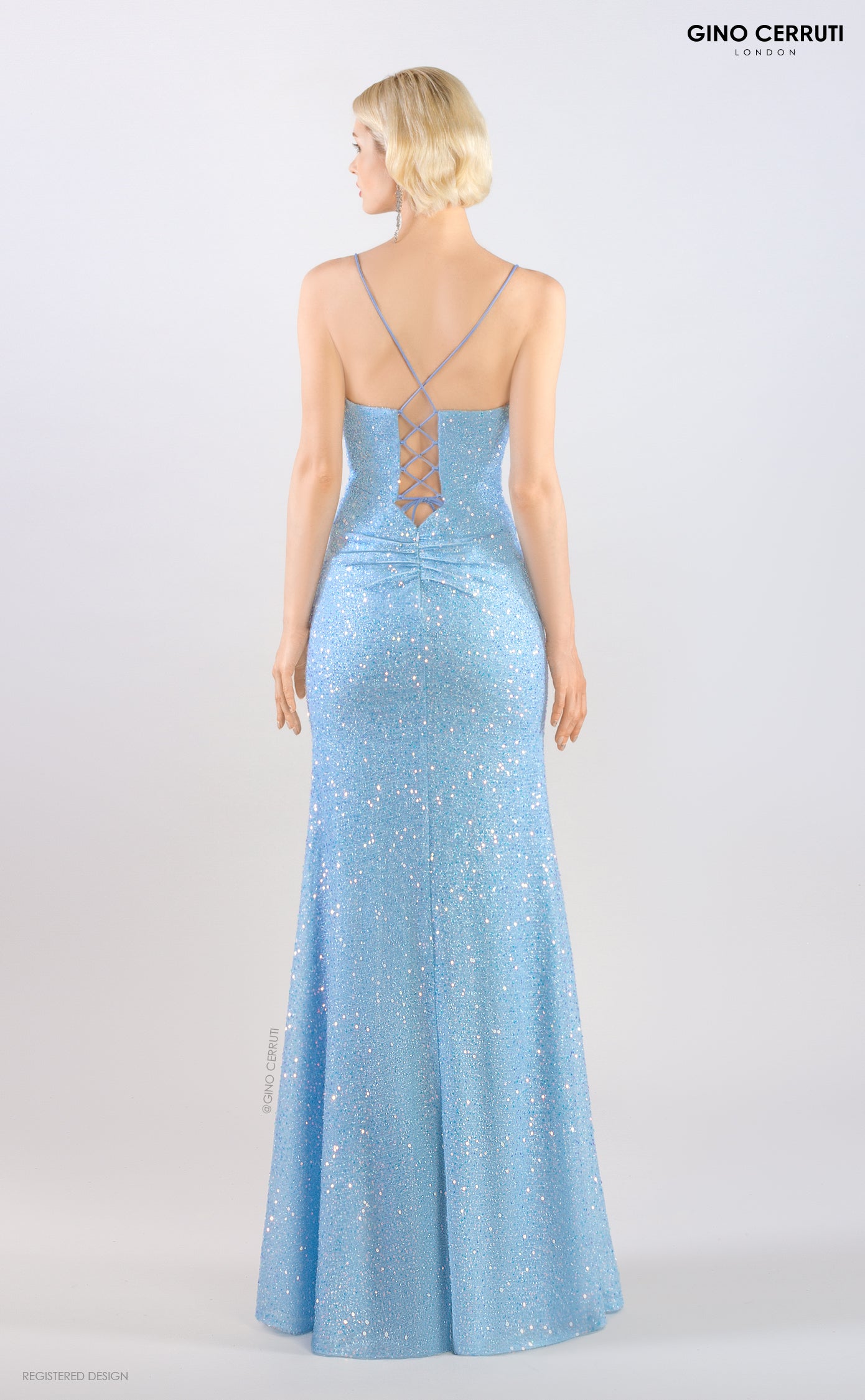 A fitted fully sequined gown with a lace up back and thigh high split.