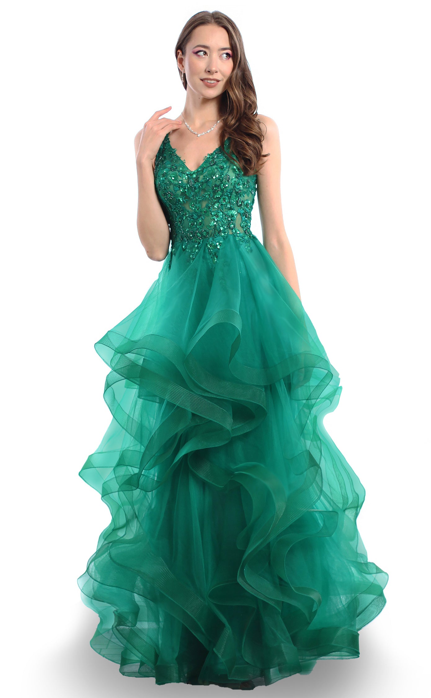 A beautiful ruffle ballgown featuring a full embellished corset bodice and a zip up back.