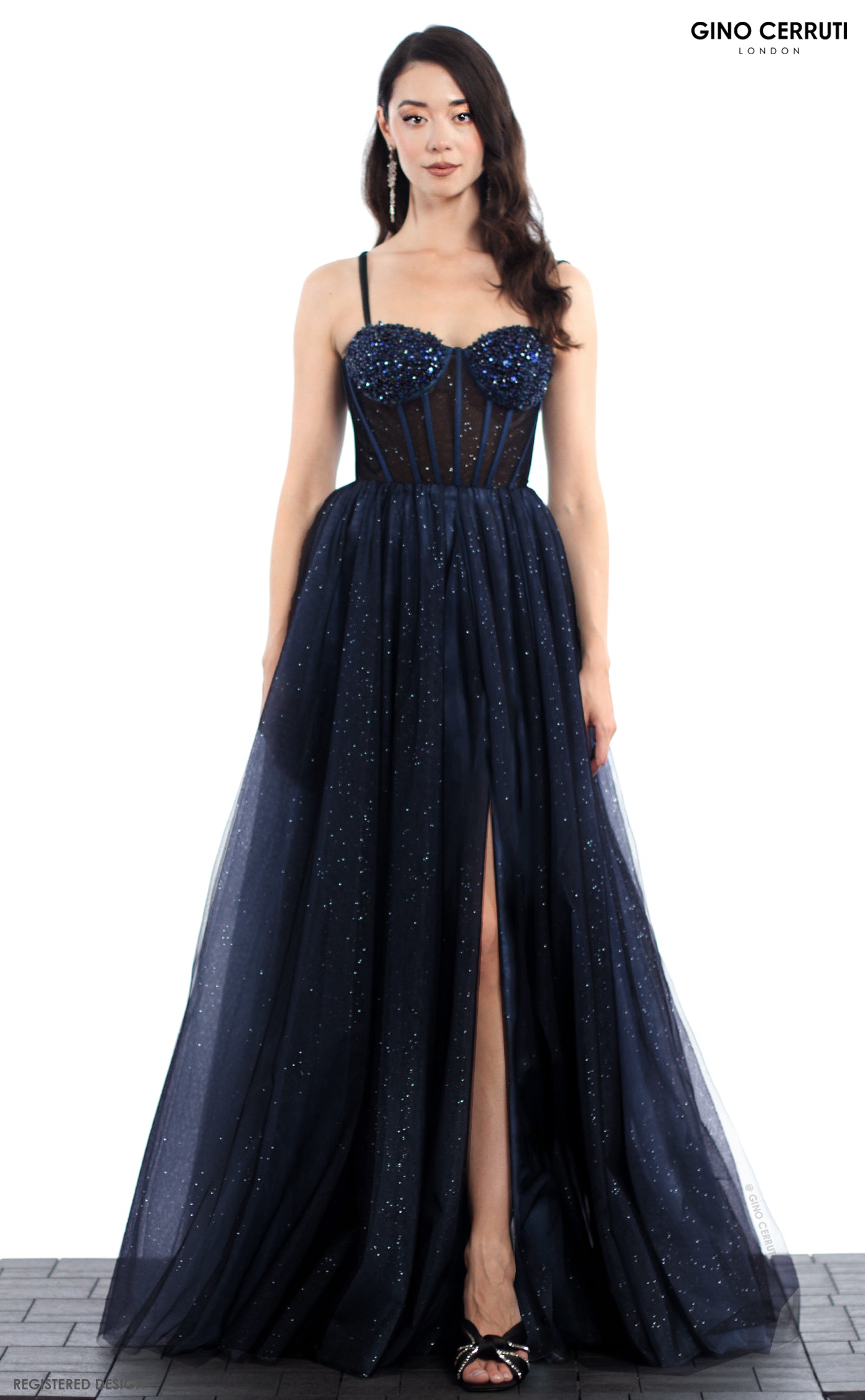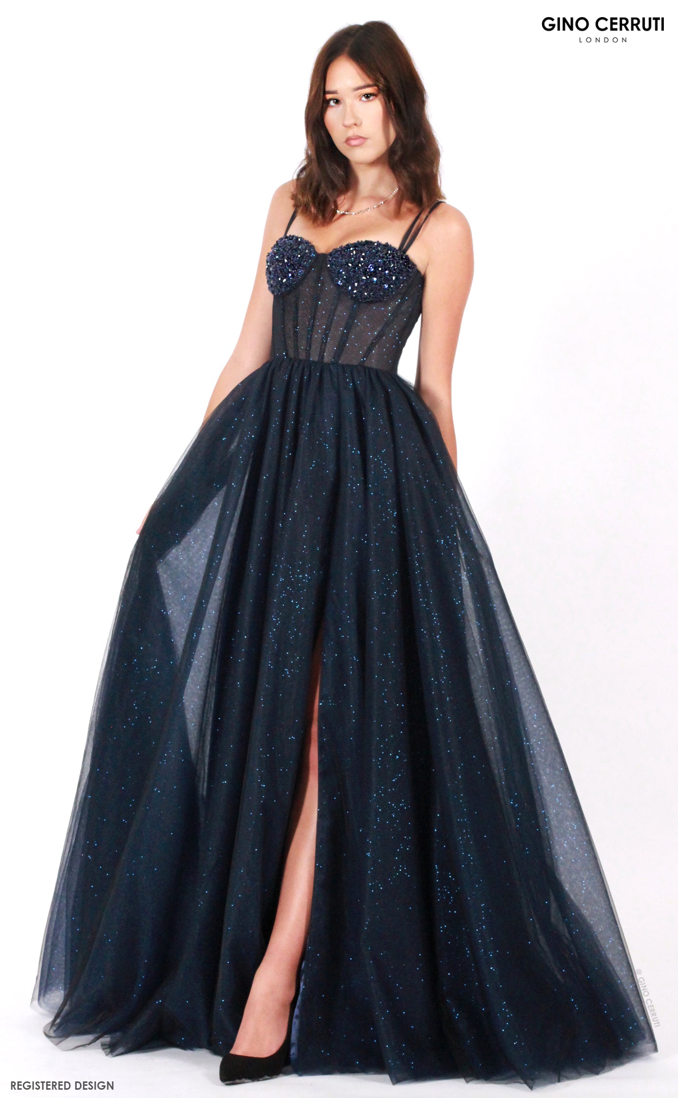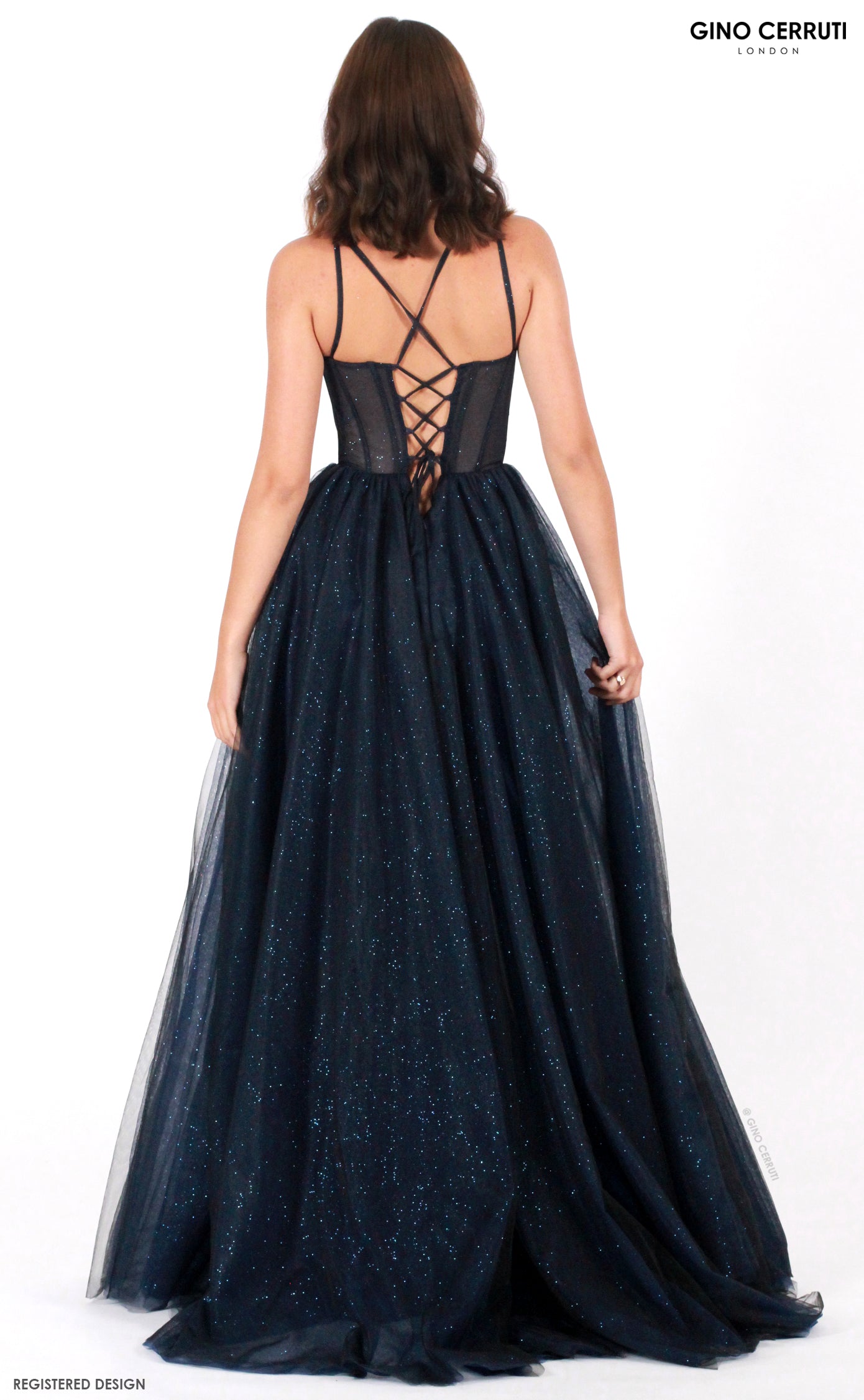 A beautiful A - line gown featuring a mesh corset style bodice, embellished cups, lace up back and a sparkly tulle skirt.