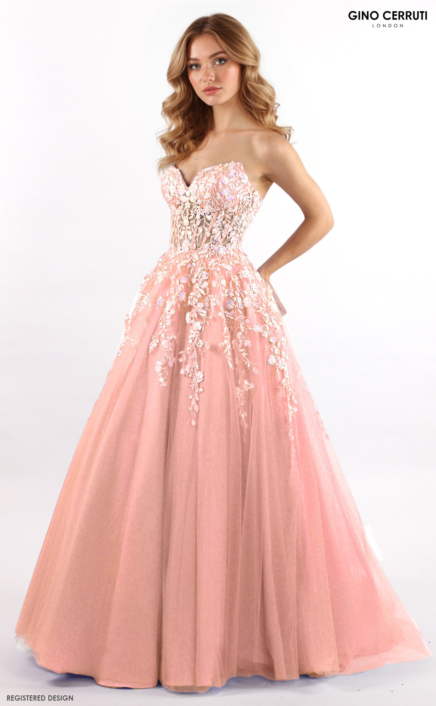 A gorgeous ballgown with a strapless bodice, floral details and a lace up back.
