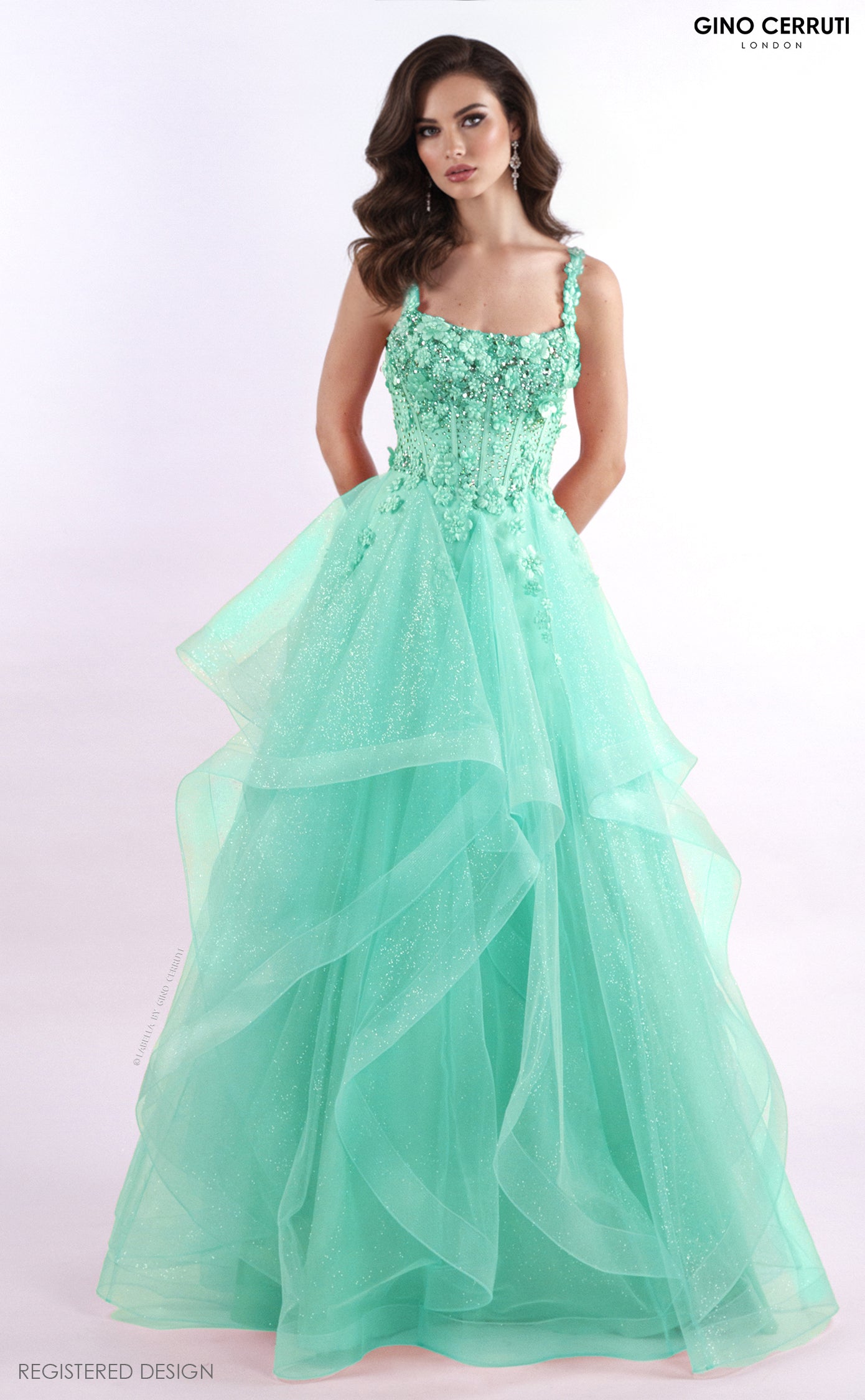 This stunning gown features a fully embellished bodice, floral straps, corset back and a tulle ruffle skirt.