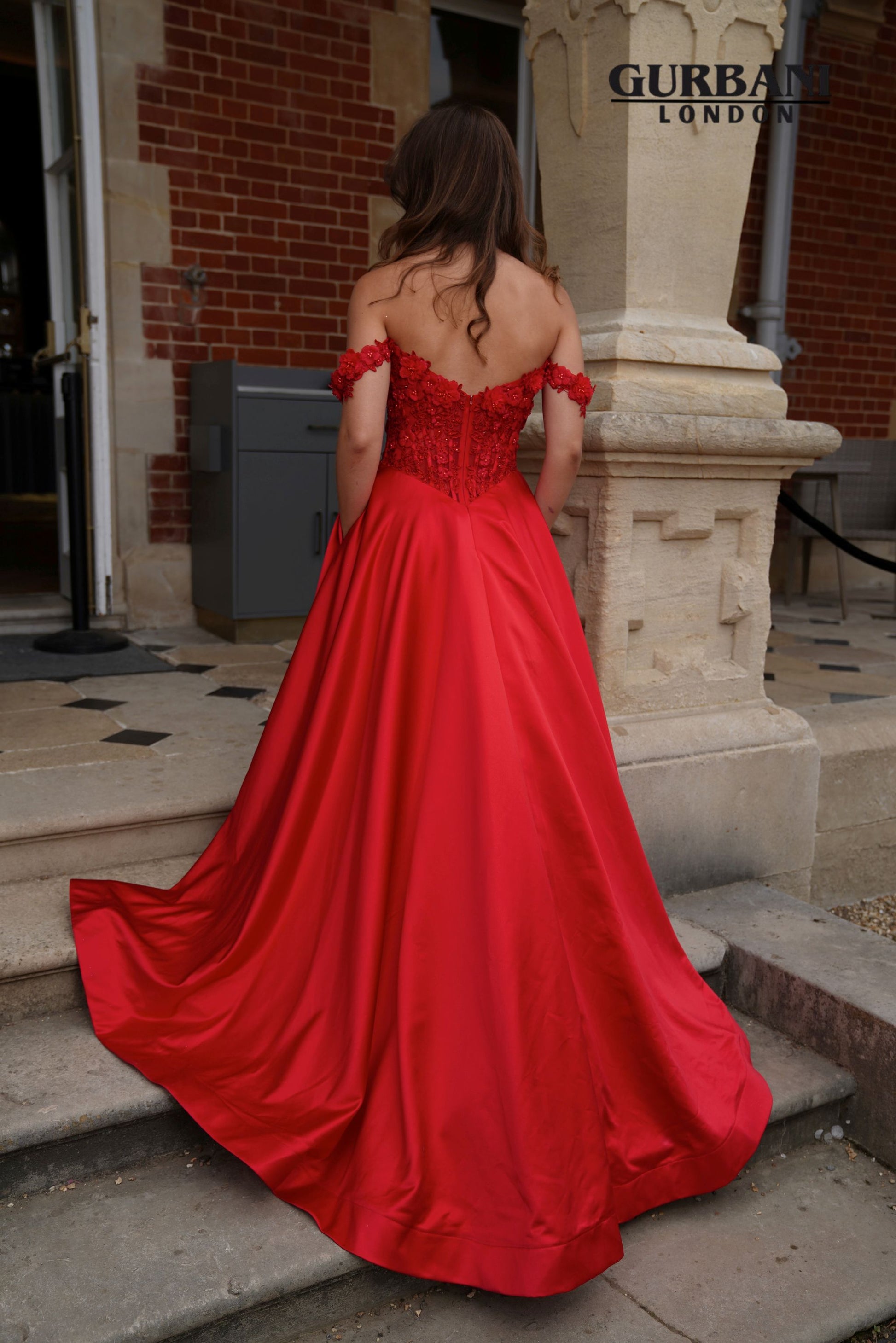 A striking satin ballgown with a floral embroidered bodice, off the shoulder straps and a full zip back.