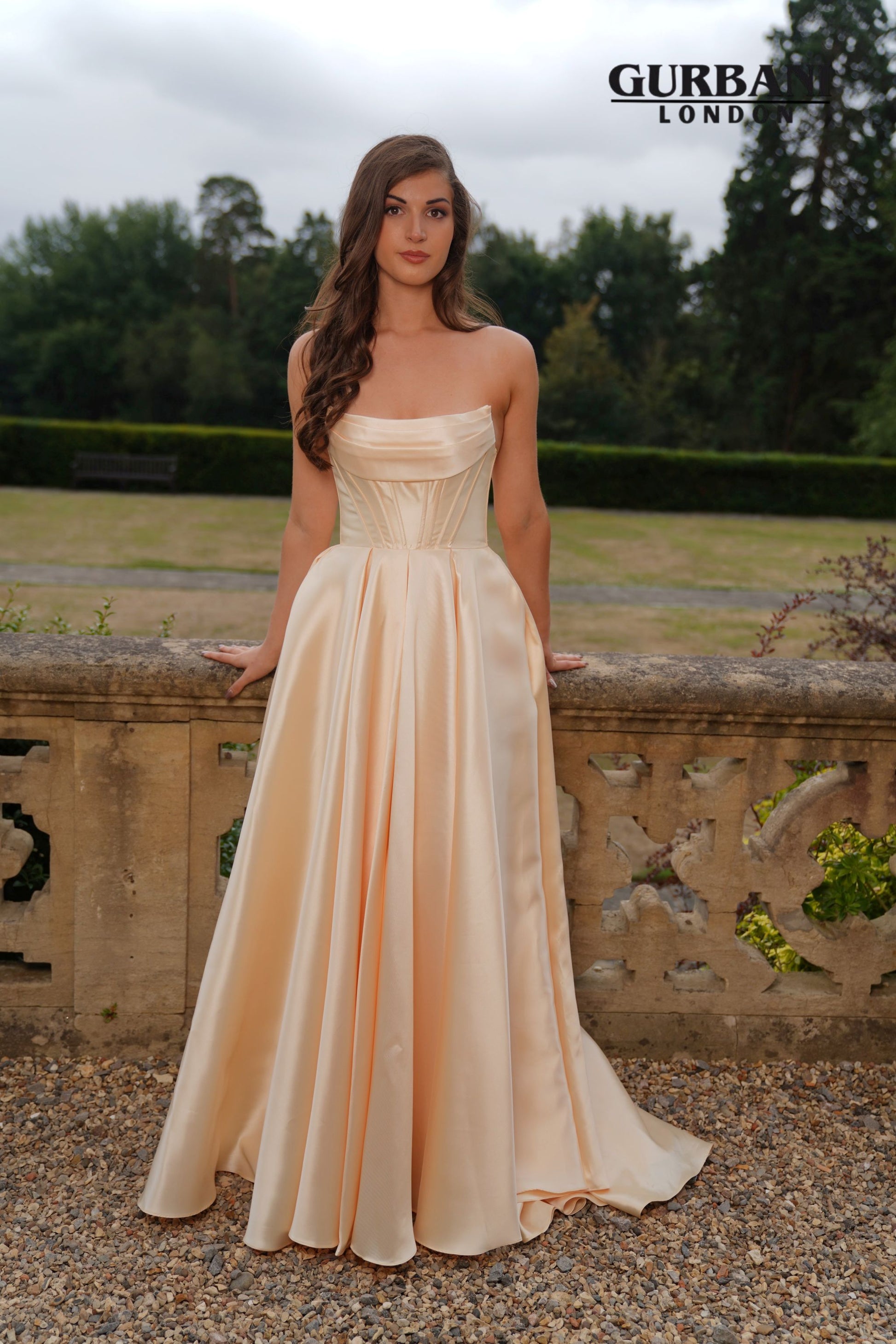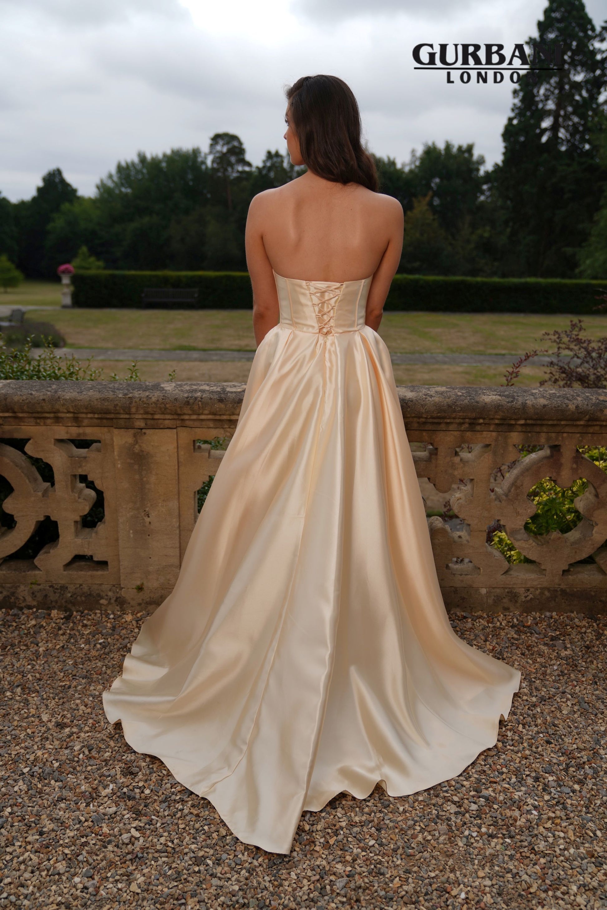 A satin A - line gown with a strapless corset bodice and lace up back.