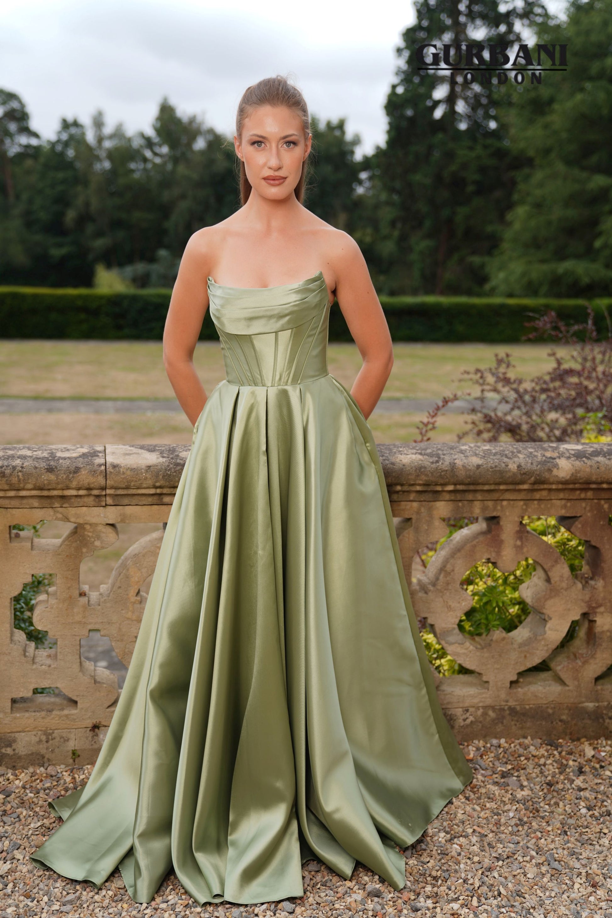 A satin A - line gown with a strapless corset bodice and lace up back.