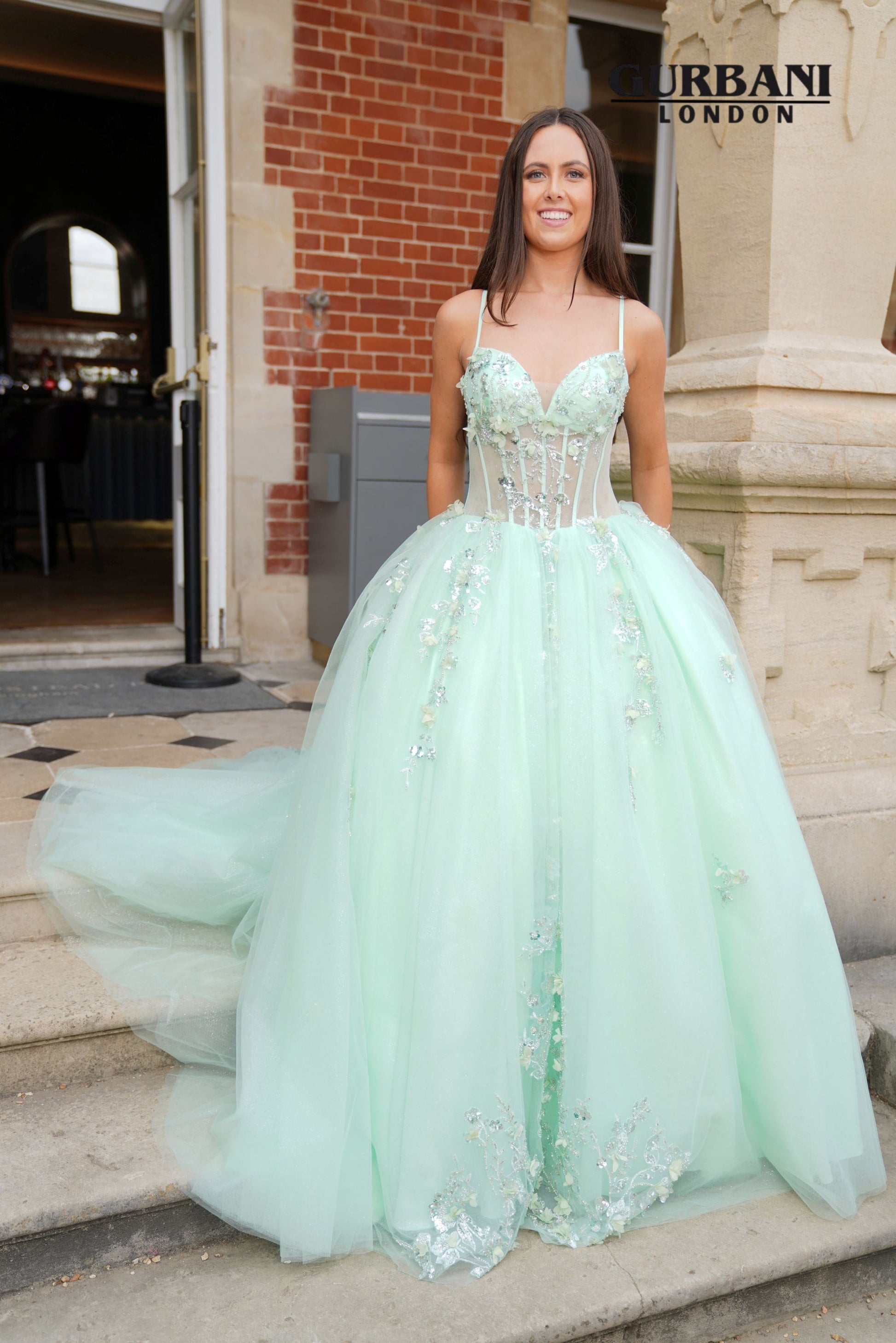 A stunning ballgown with a mesh corset bodice, floral appliques and a lace up back.
