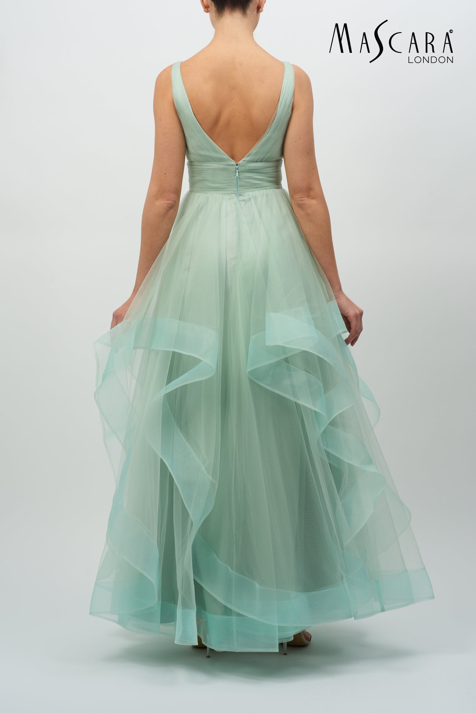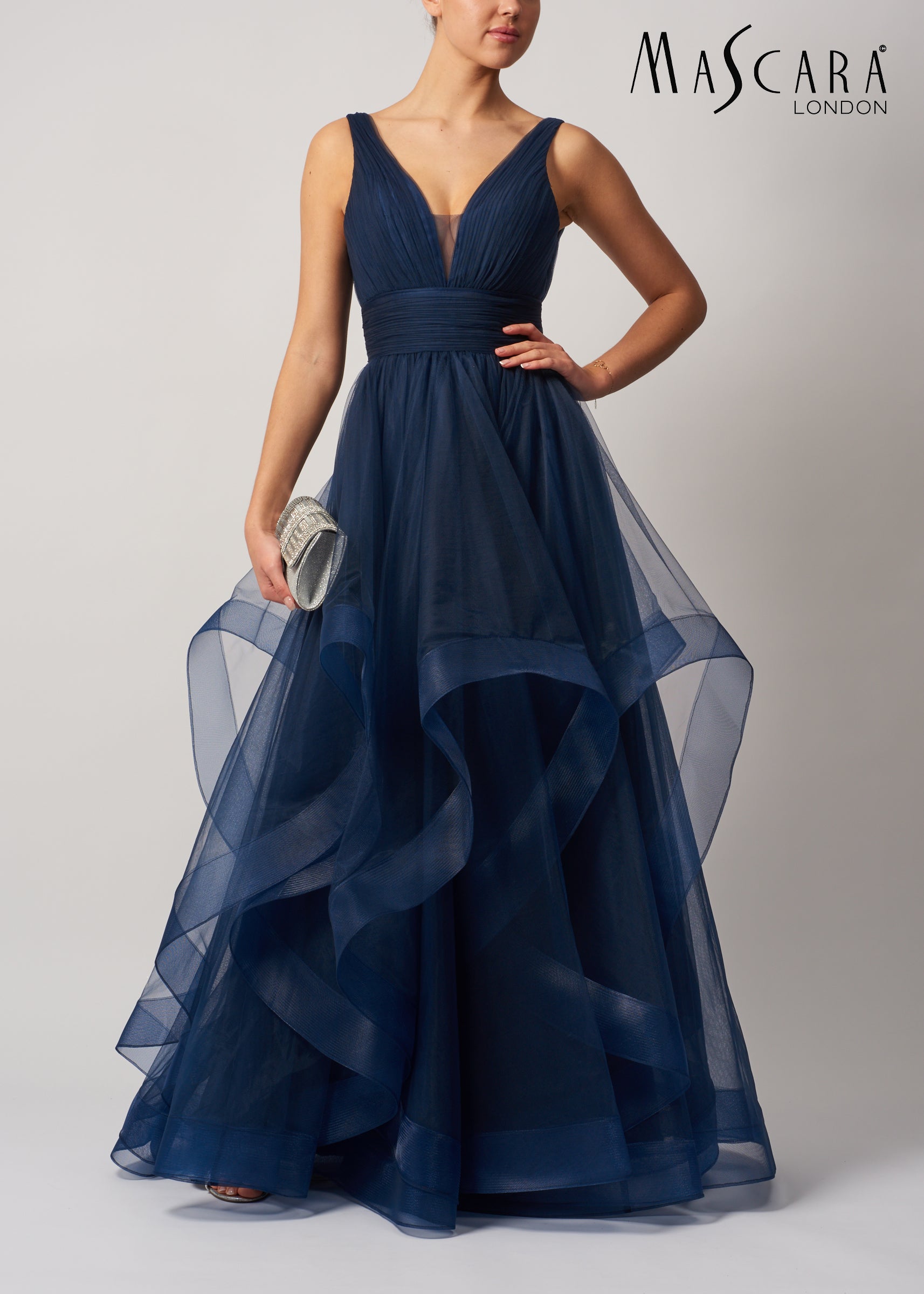 A beautiful A - line gown featuring a tulle pleated bodice, mesh plunge detail and a ruffle tulle skirt.