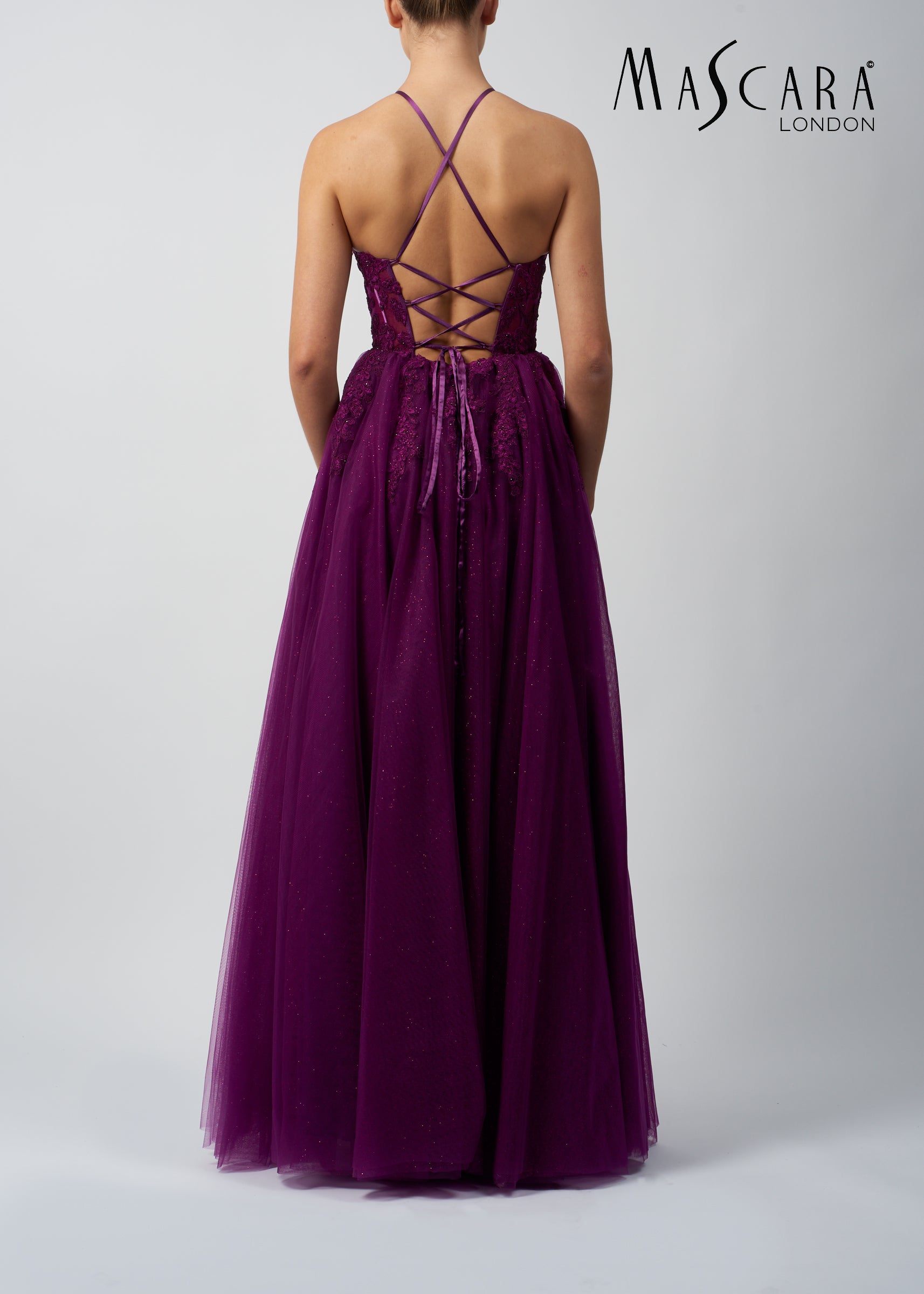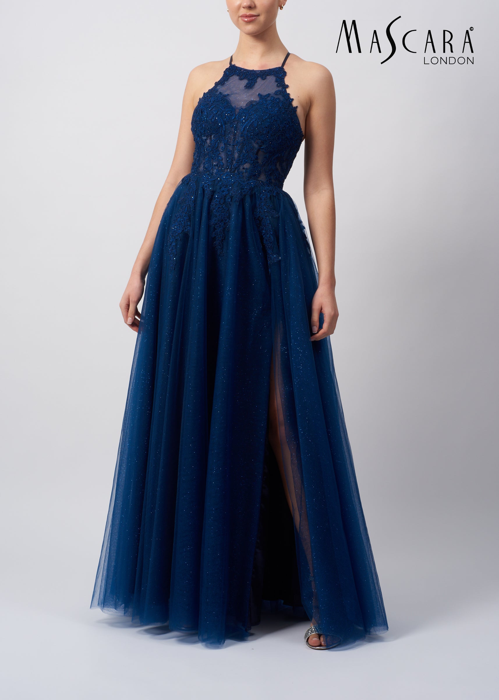 A beautiful glitter A - line gown featuring a halter neck mesh bodice, floral lace details and corset back.