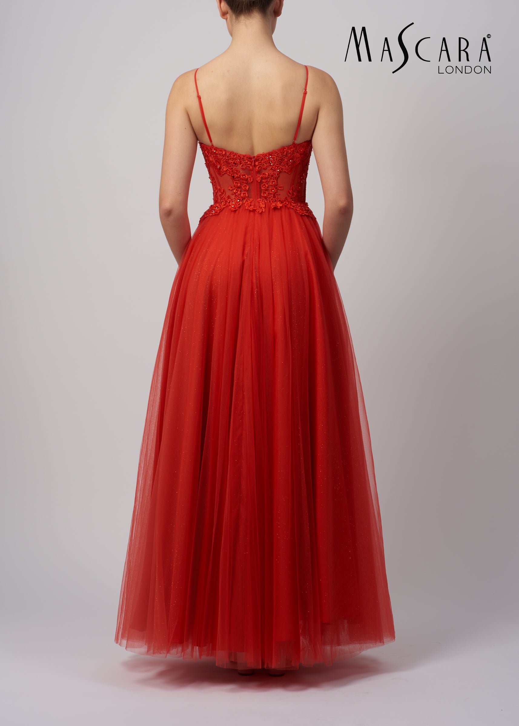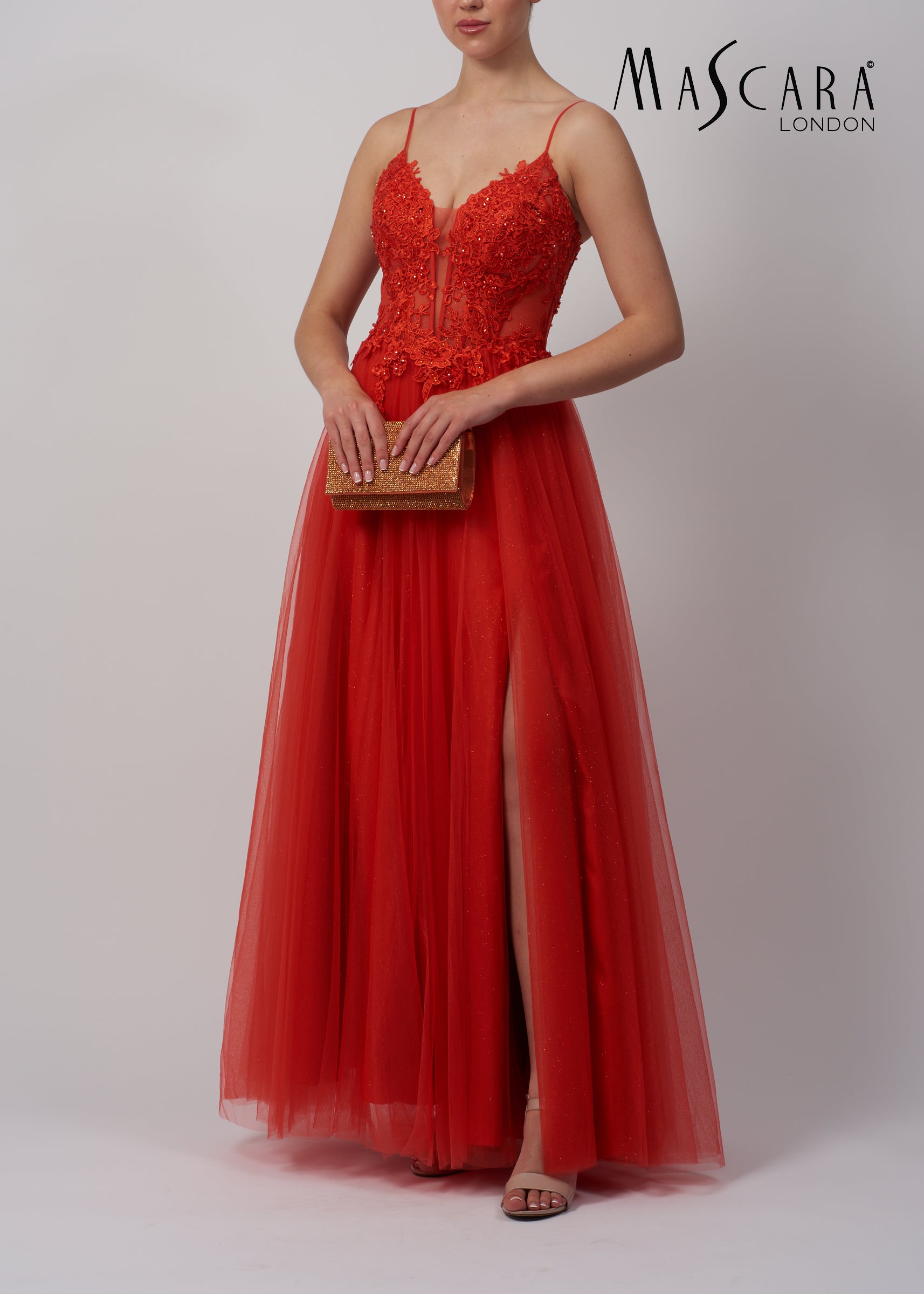 A striking A-line gown with a lace mesh bodice, deep plunge detail and a tulle skirt.