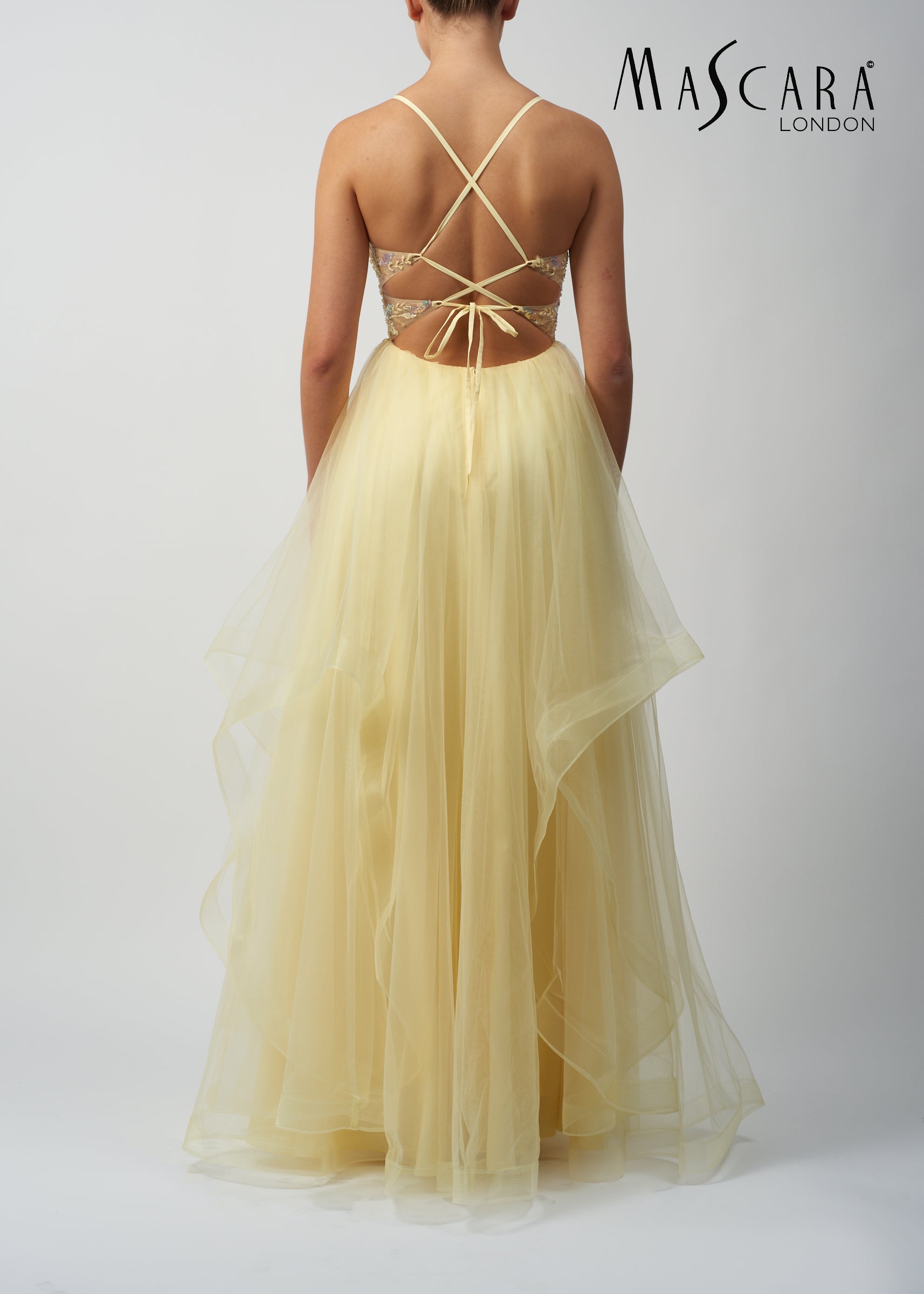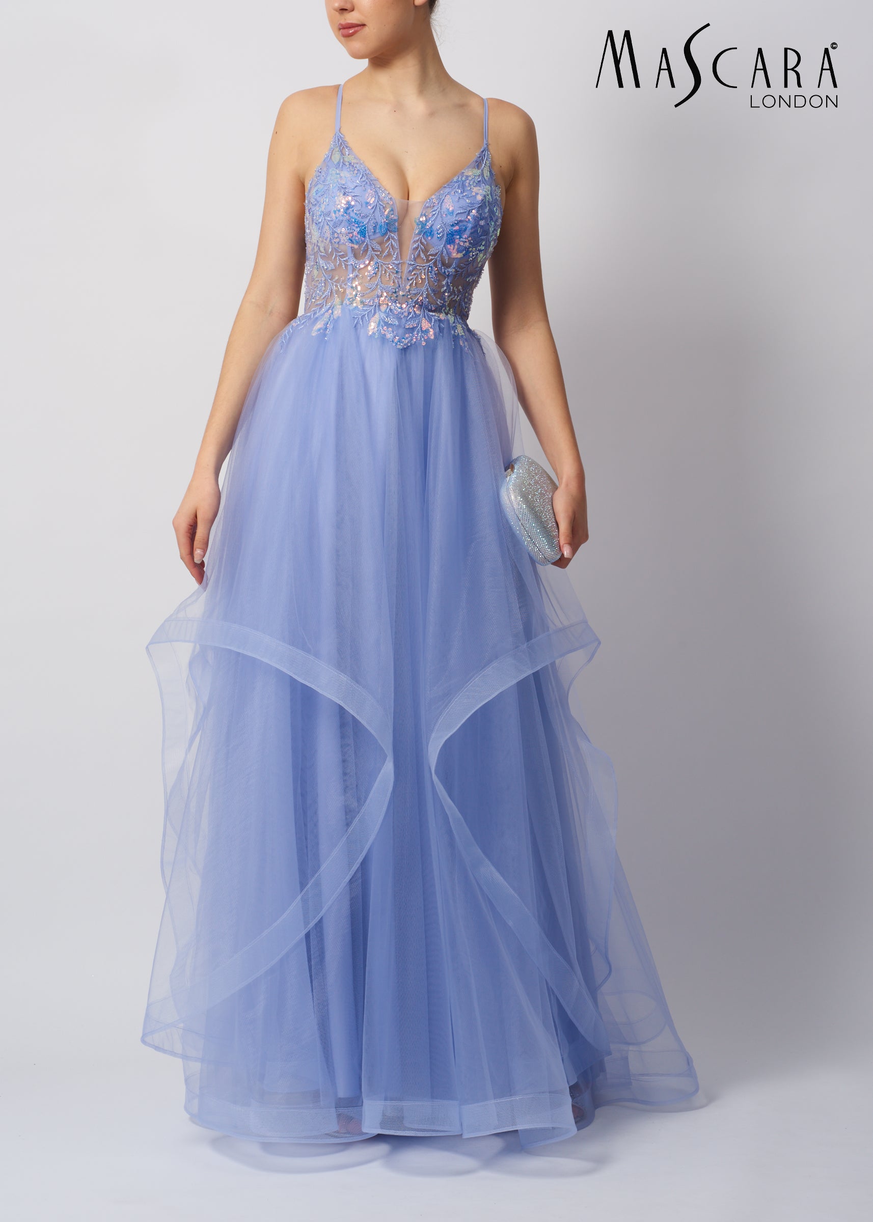 A beautiful ruffle A - line gown featuring a mesh embroidered bodice, deep mesh plunge, wide thin straps and a lace up back. The ultimate princess dress!