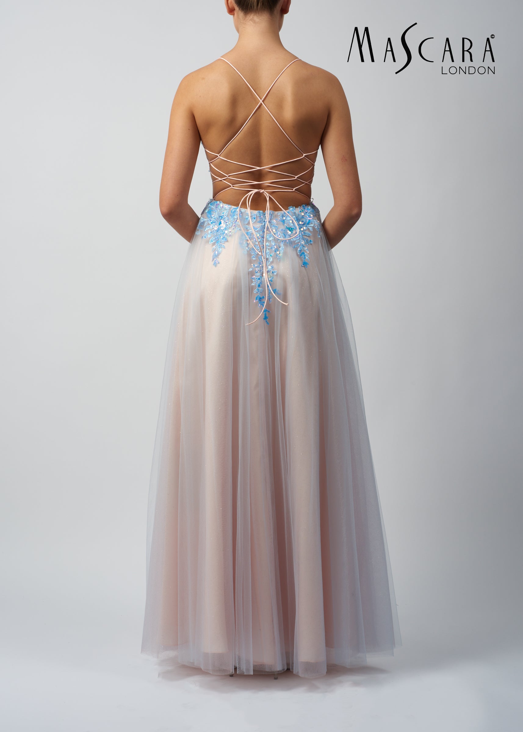 Gorgeous two toned A - line gown with floral lace appliques, lace up back and a tulle skirt.