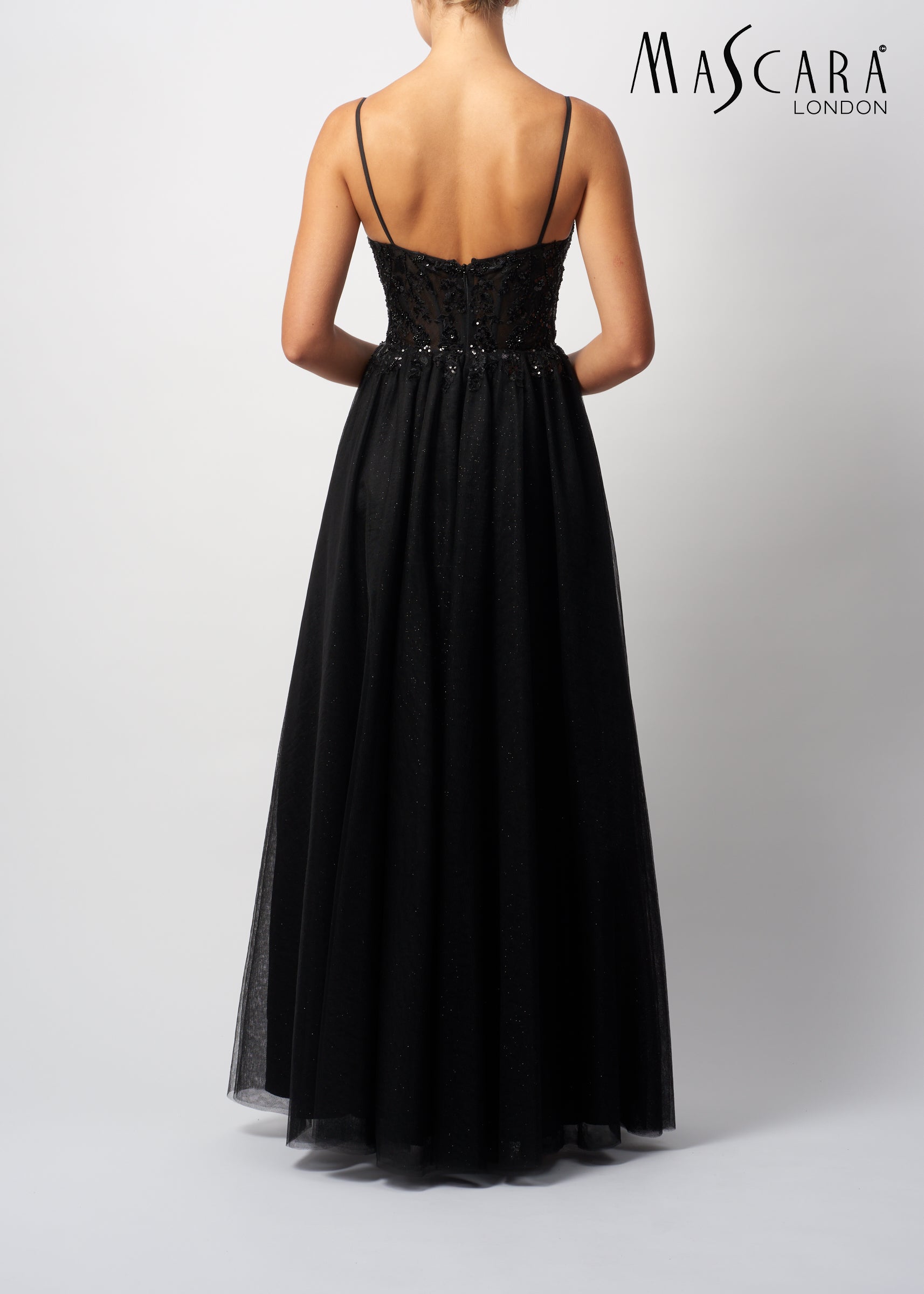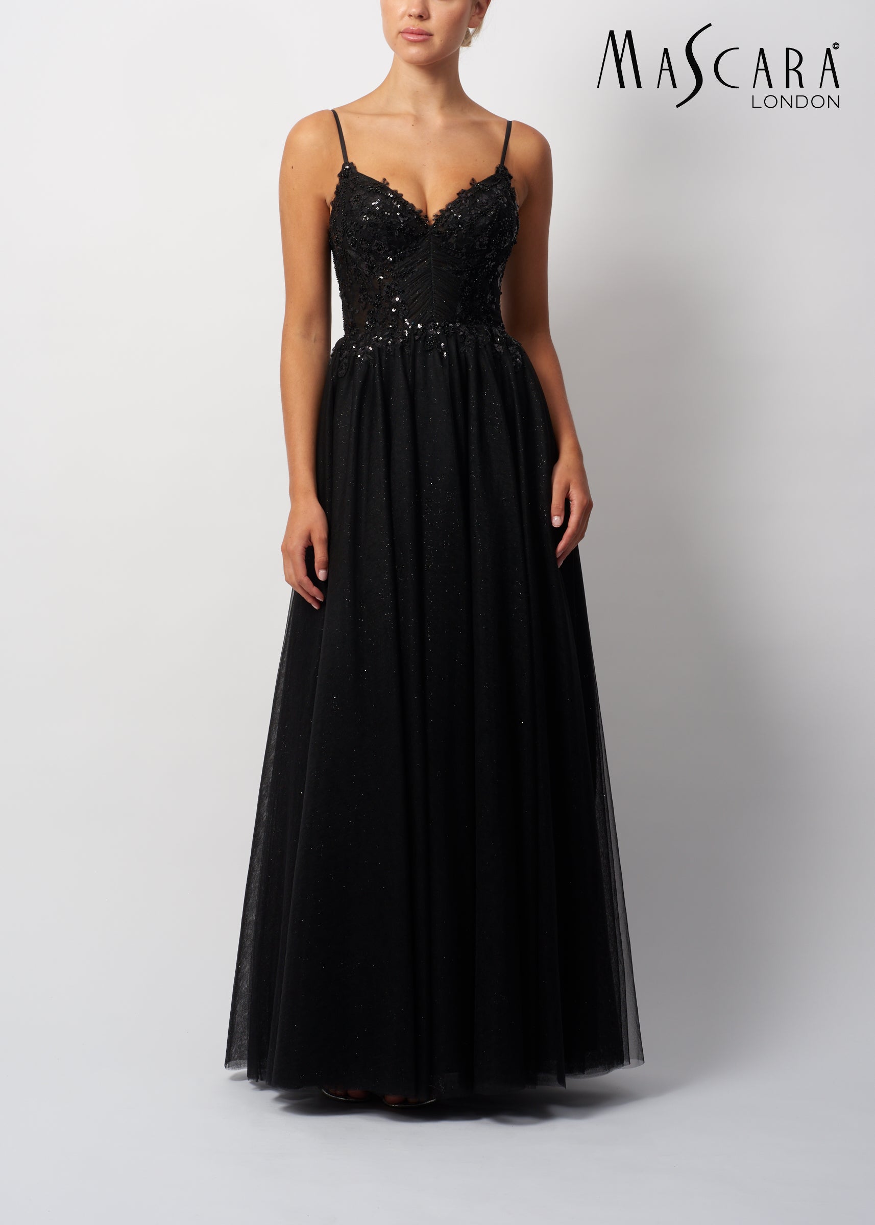 A stunning black A-line gown with a sequinned lace bodice, sweetheart neckline and a tulle skirt.