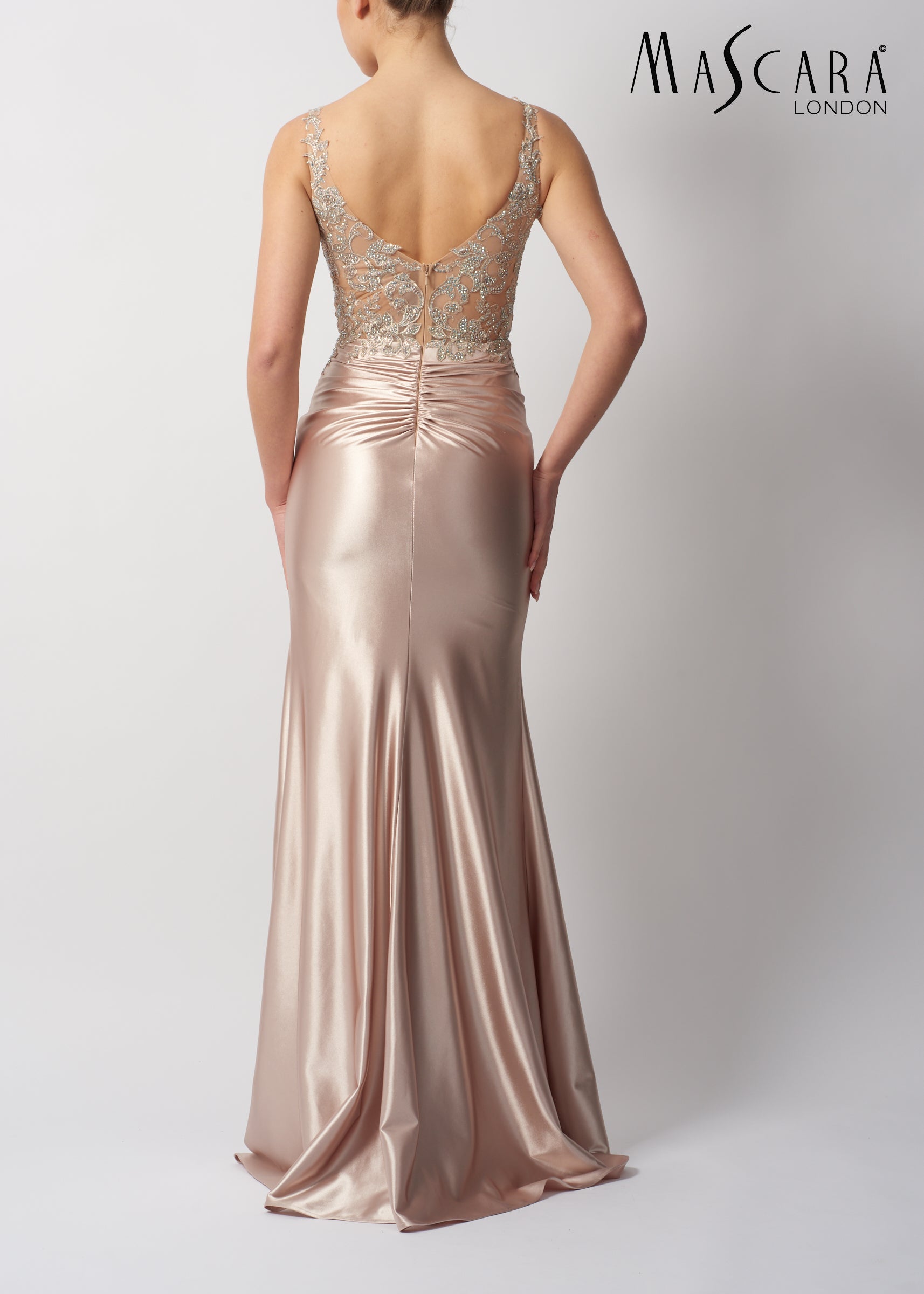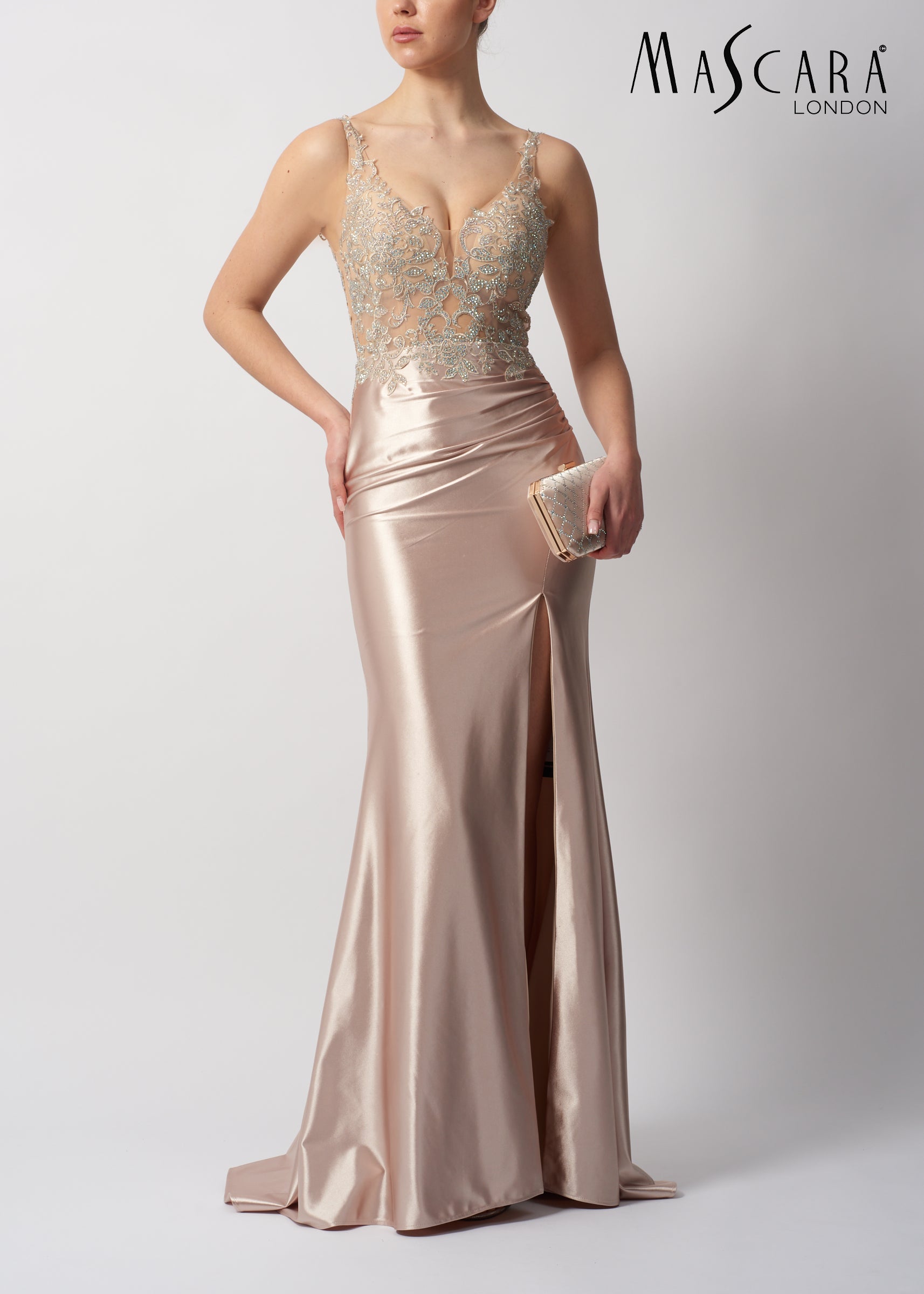 Stunning satin fitted gown with lace bodice and thigh high slit.