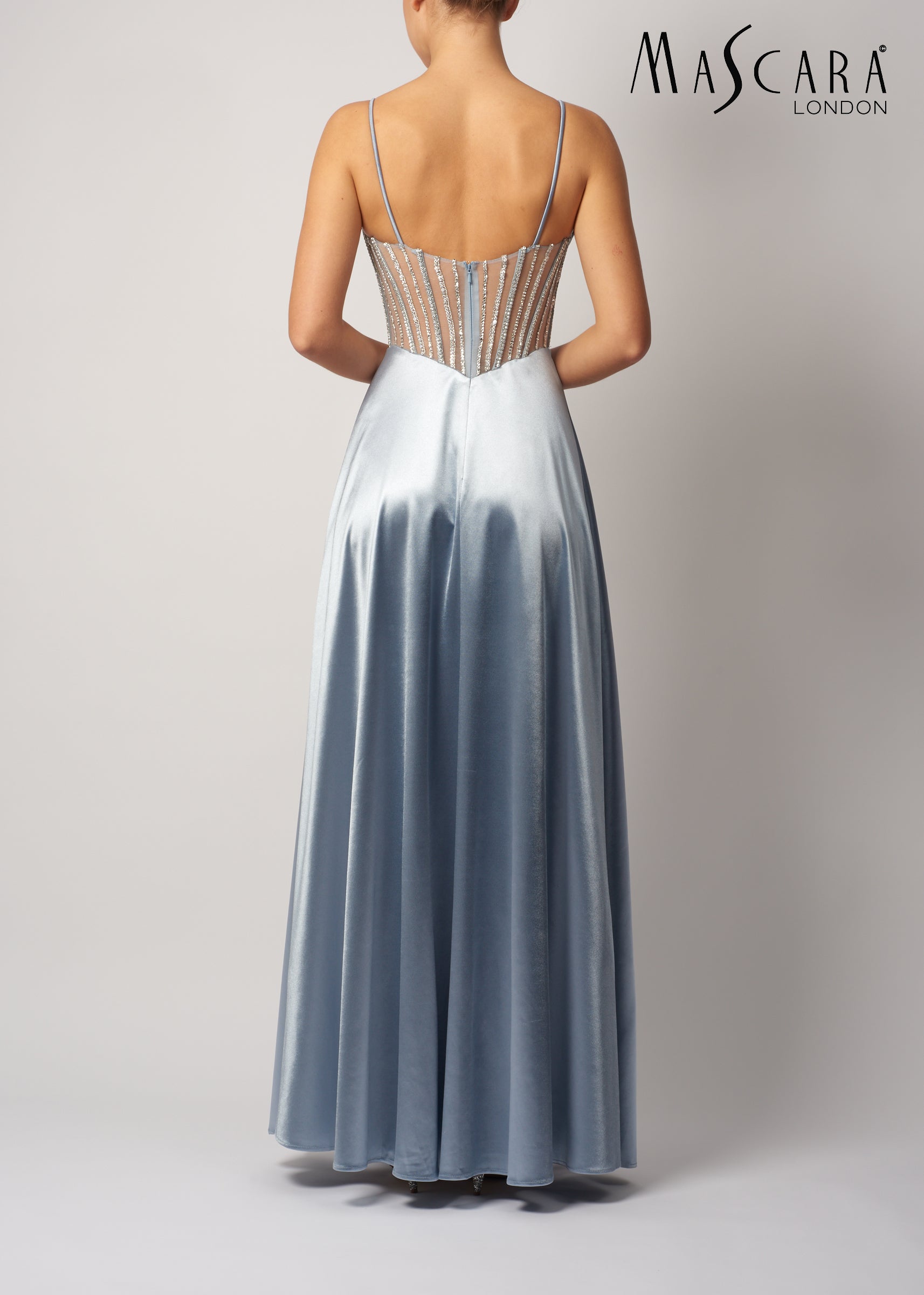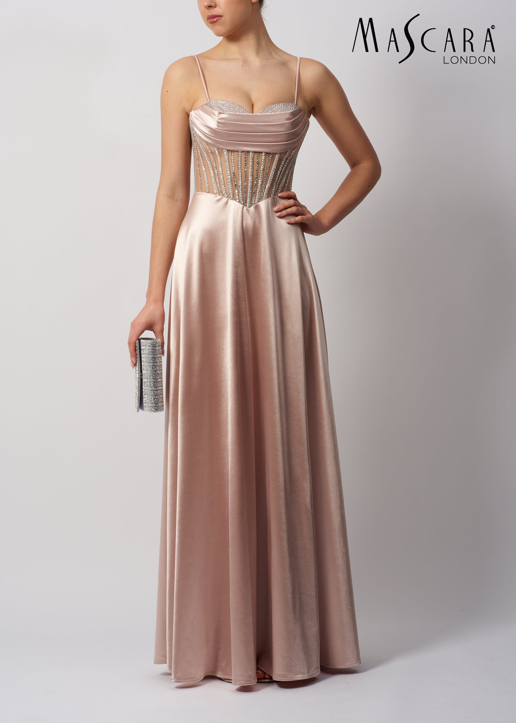 A stunning satin A - line gown featuring a mesh corset bodice with diamante details, thin straps and a full zip back.