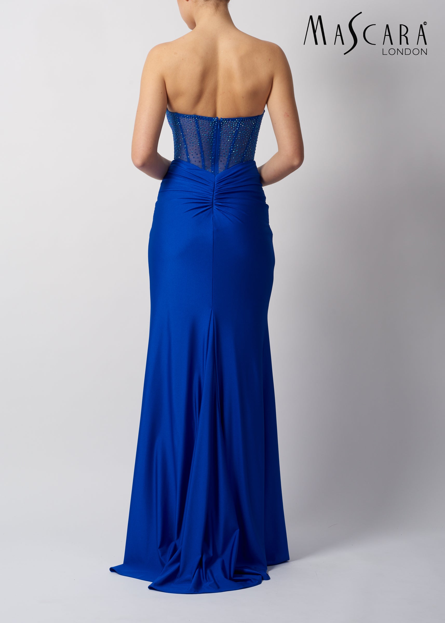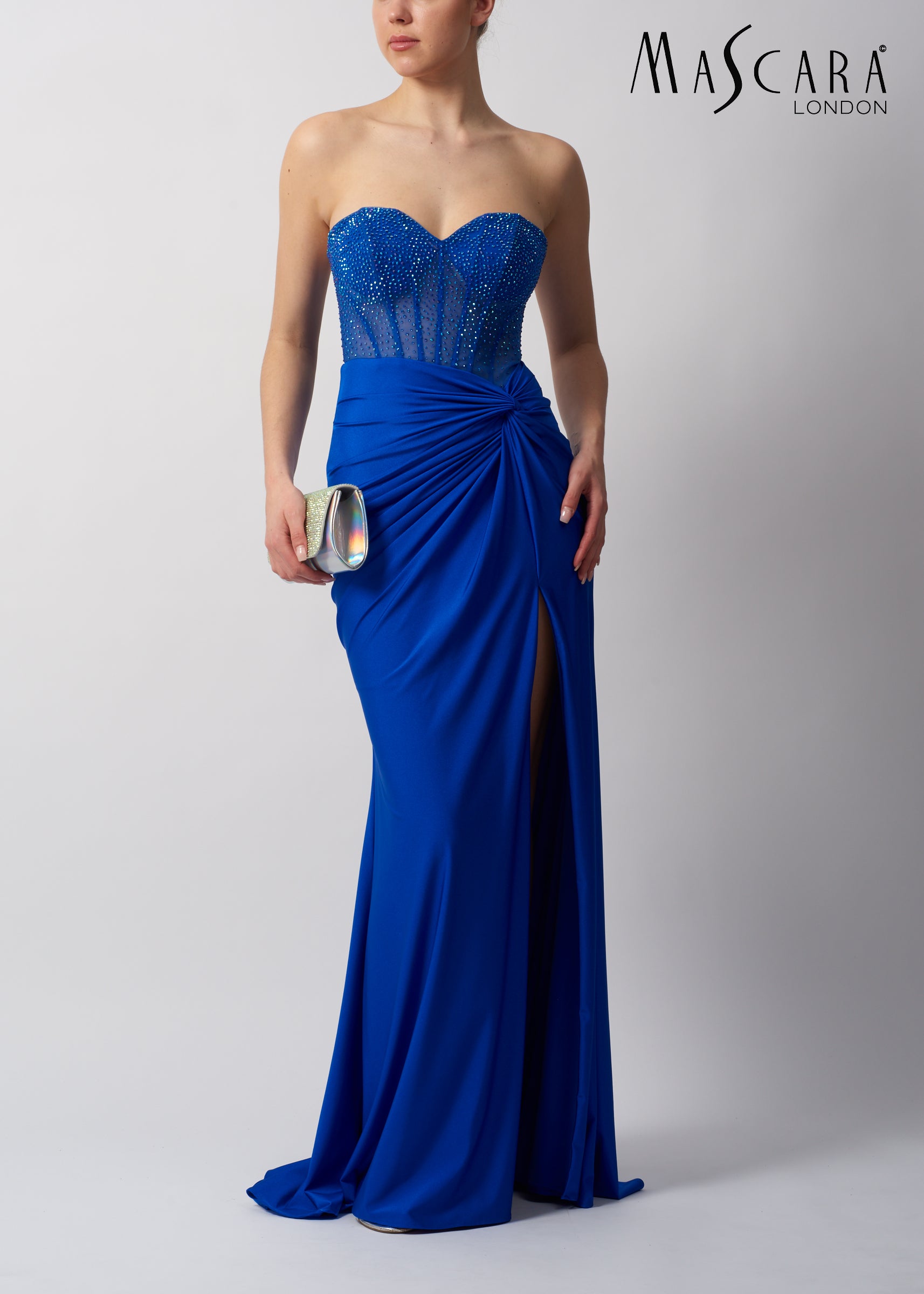 A jersey fitted dress with a diamante embellished bodice, side ruching and a thigh high leg split.