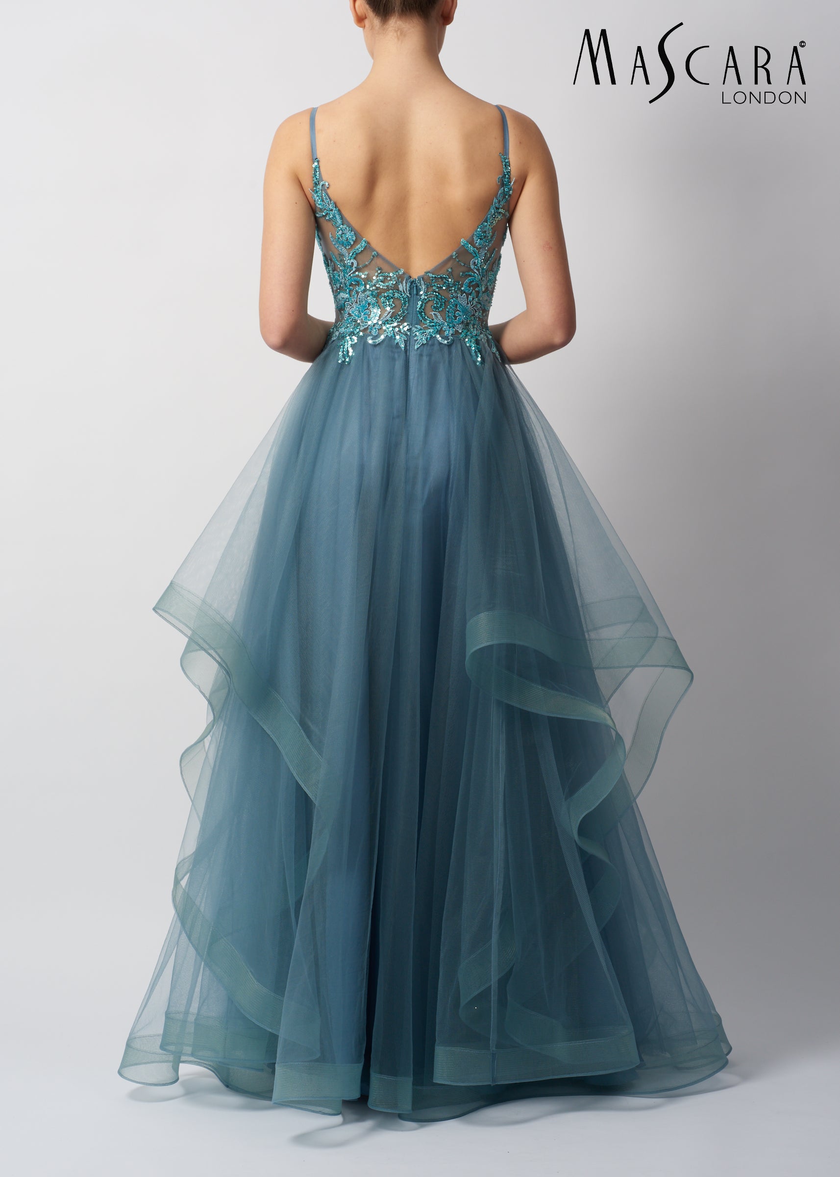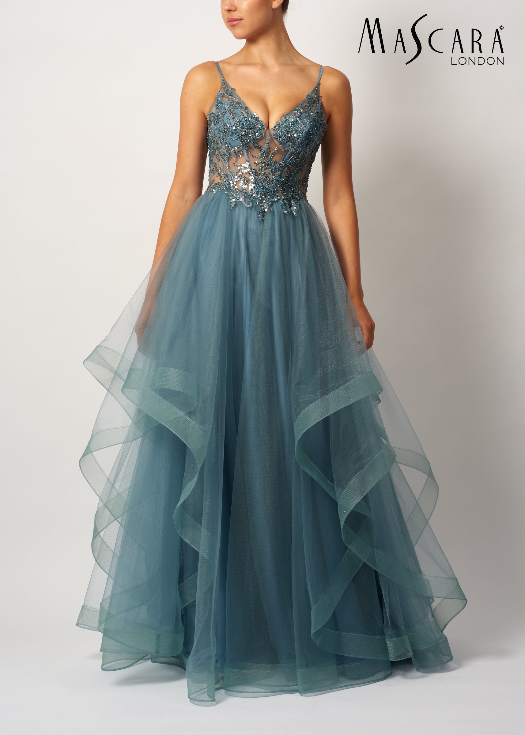 Stunning ruffle A-line gown with embellished bodice and a dreamy tulle skirt.
