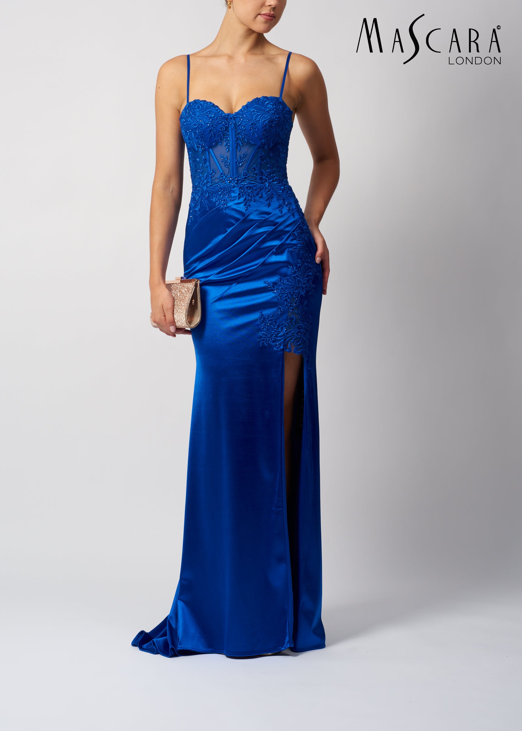 This satin fitted gown features a lace corset bodice, lace up back and a thigh high leg split.