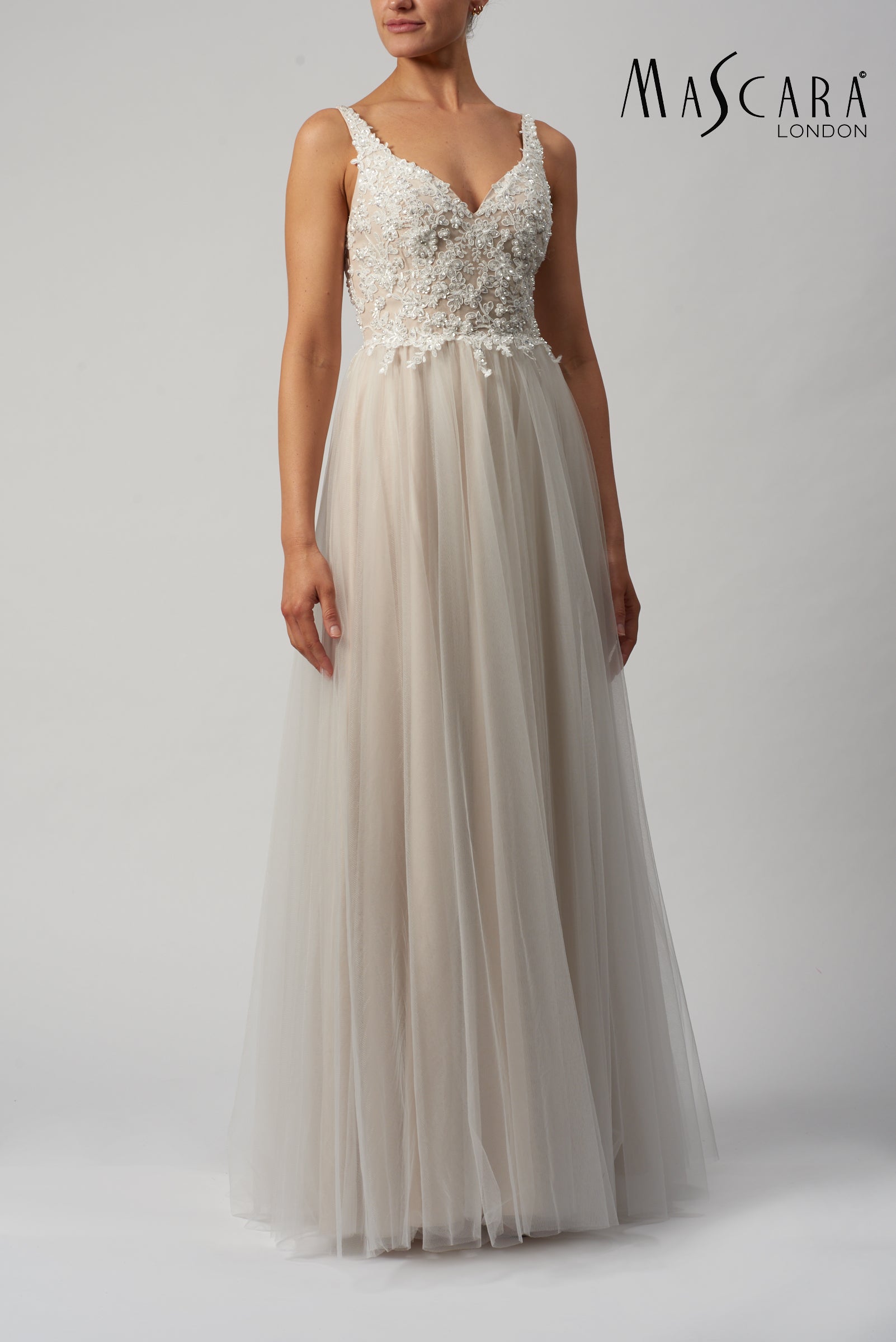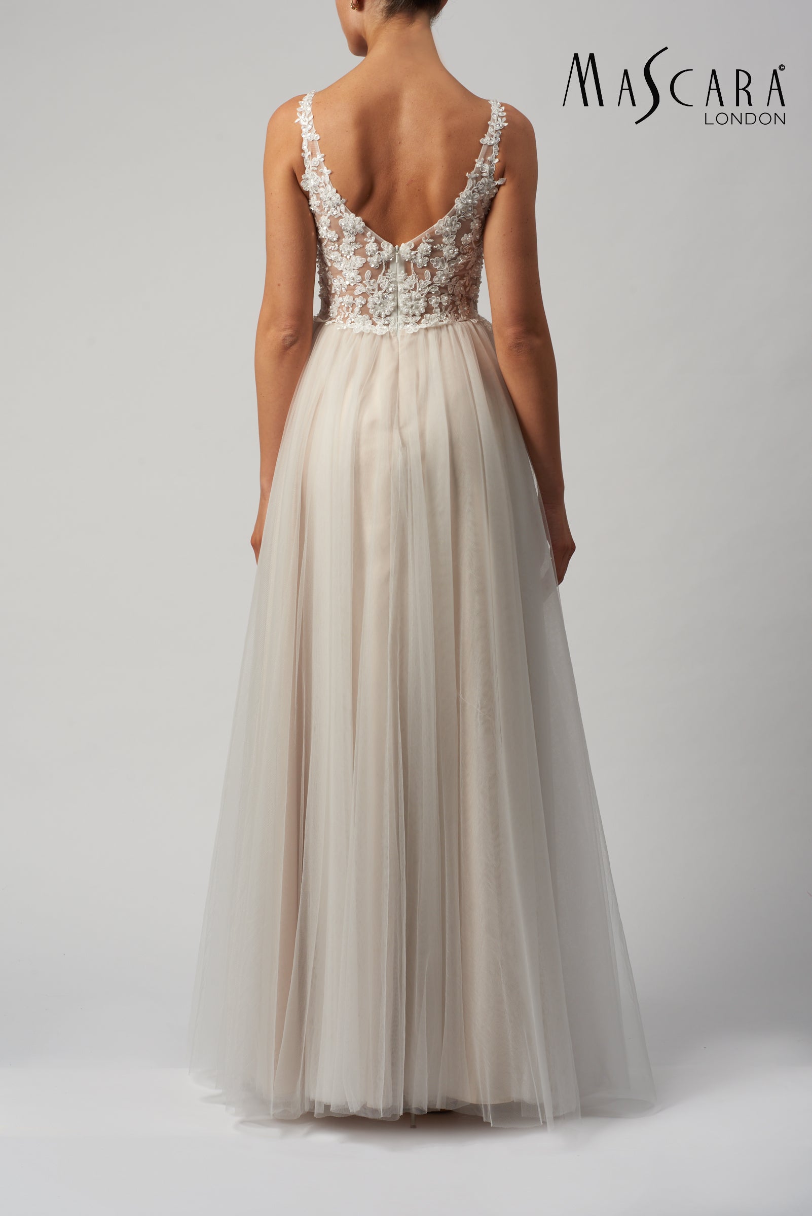 This A - line gown features a lace and pearl embroidered bodice, a low scoop back and a tulle skirt.