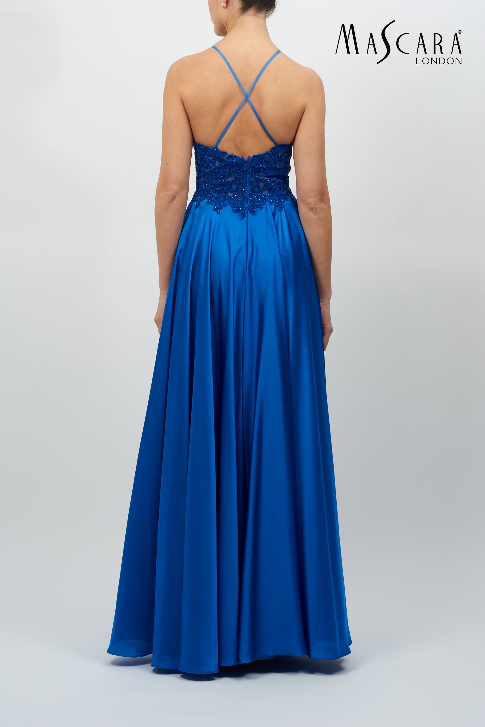 A beautiful high neck lace bodice, cross back design and a silky satin A - line skirt.