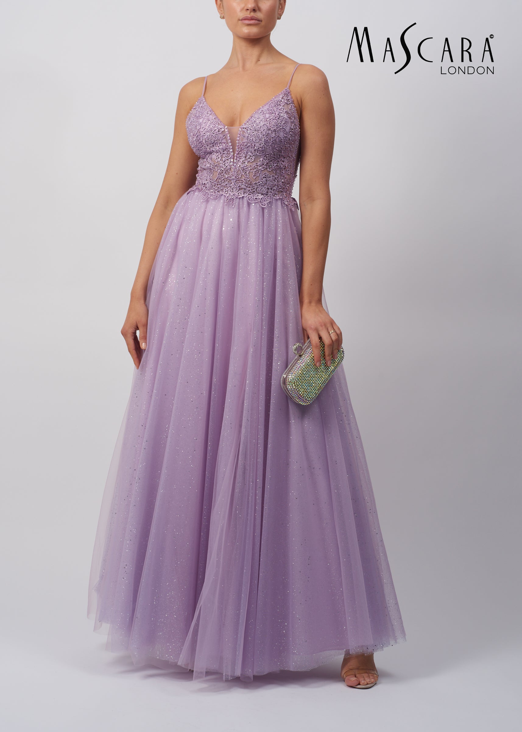 A stunning A-line gown with a lace embroidered bodice, v- neck back and a glitter tulle skirt.