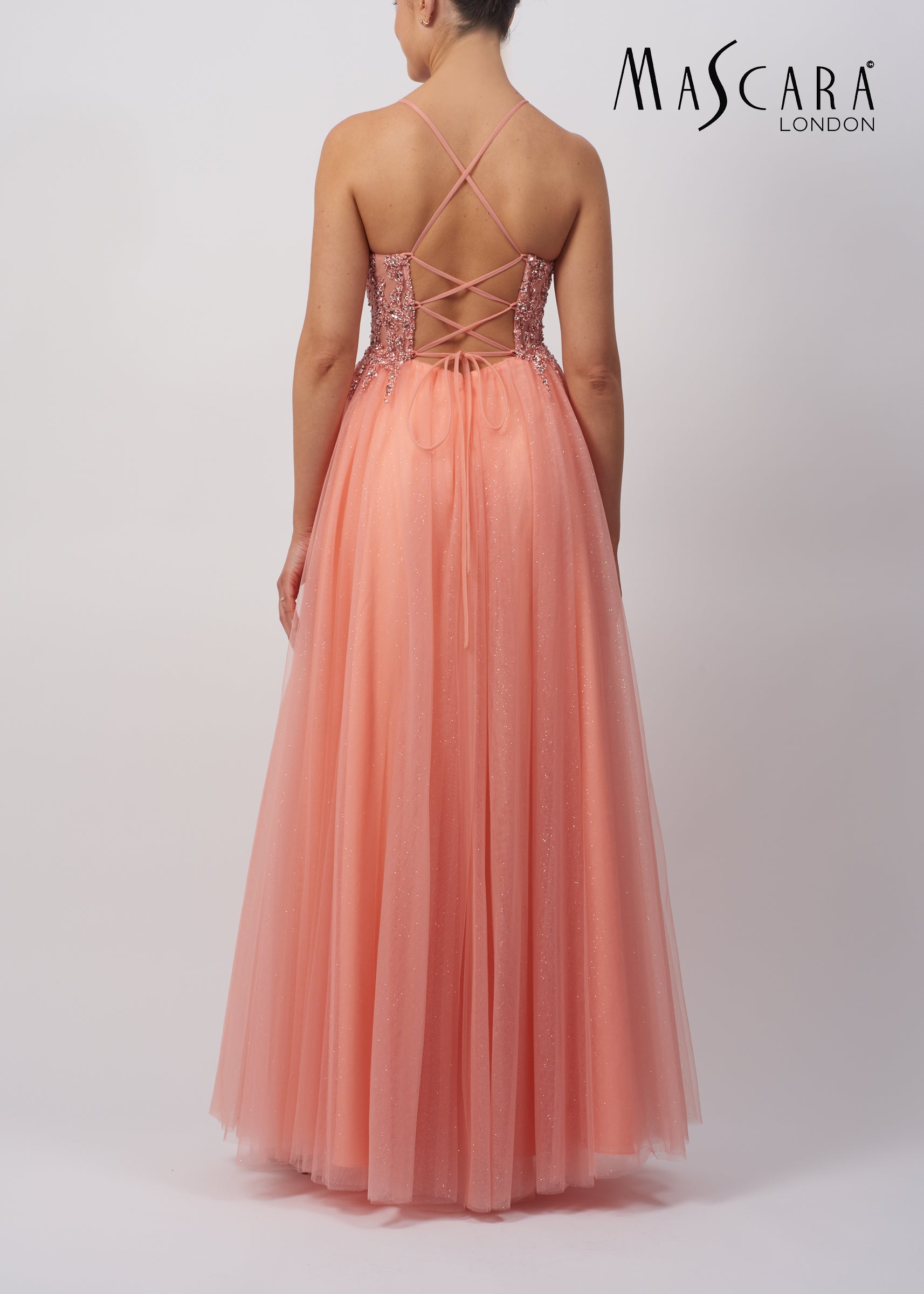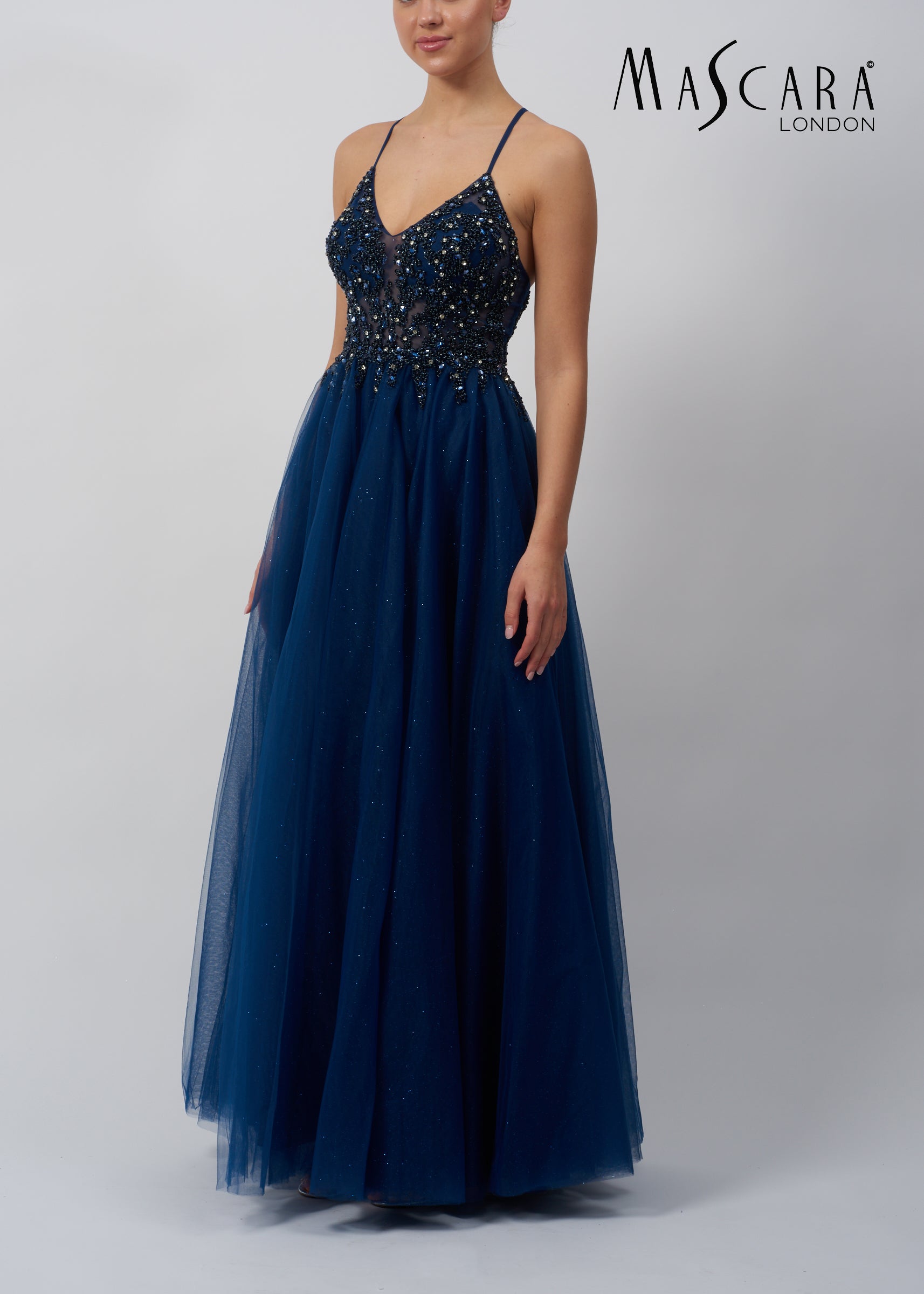 This gorgeous gown features a fully embellished bodice, lace up back and a tulle skirt.