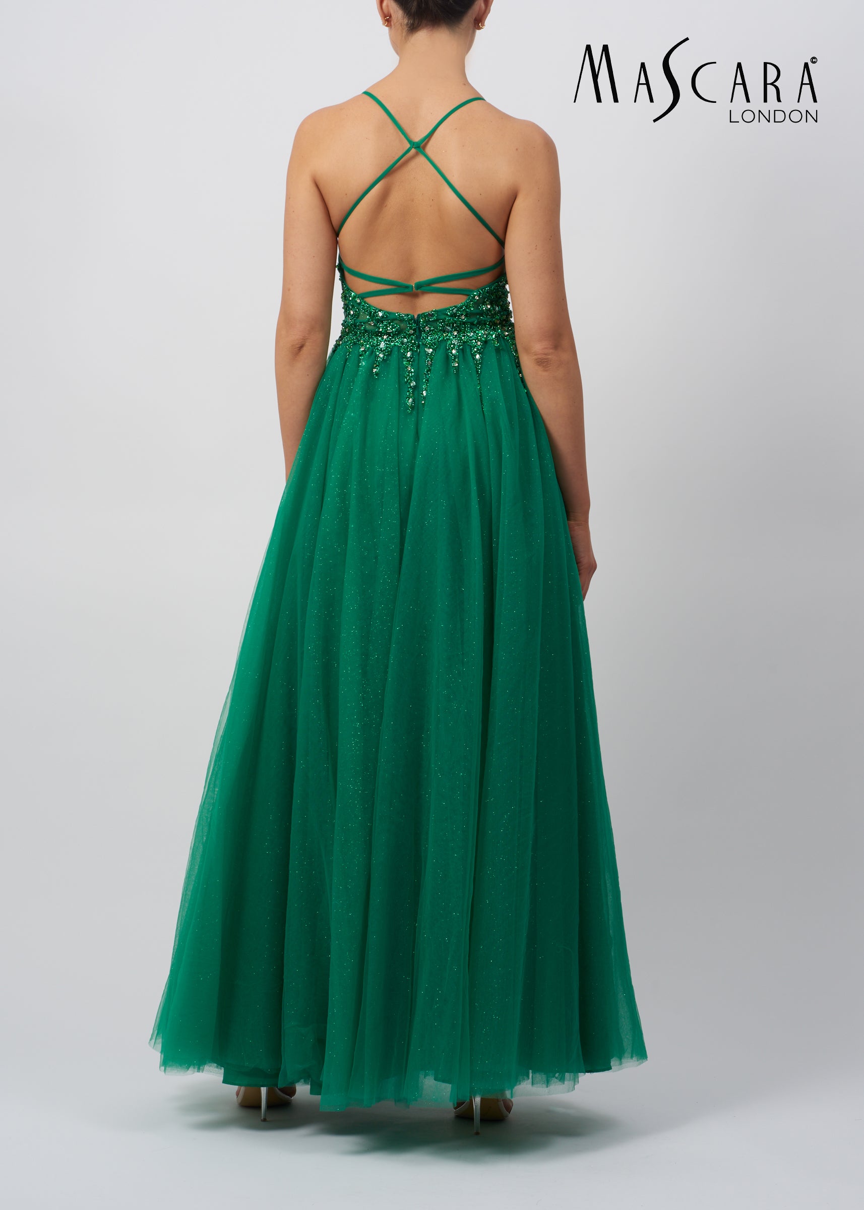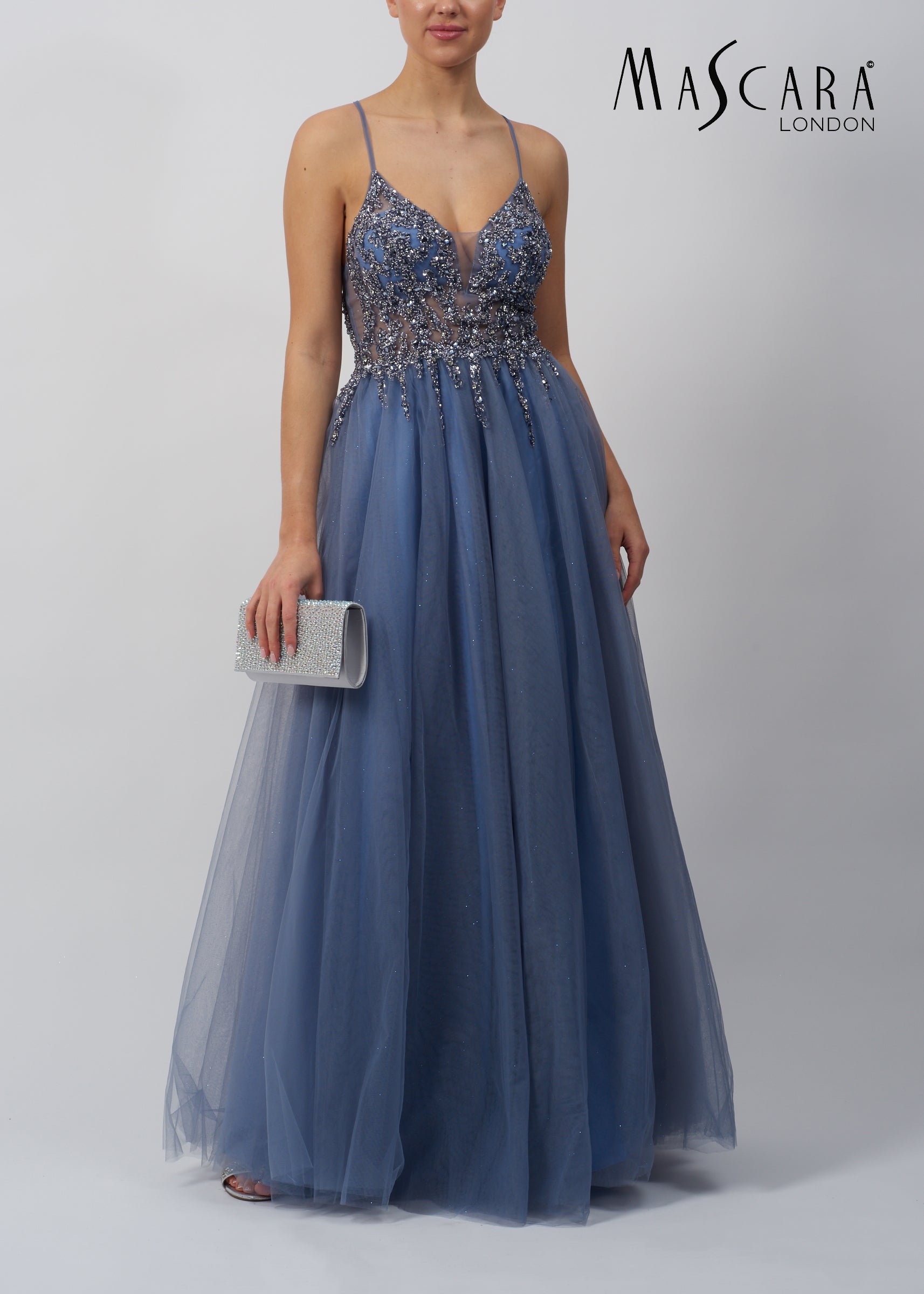 This gorgeous gown features a fully embellished bodice, strappy back design and a tulle skirt.
