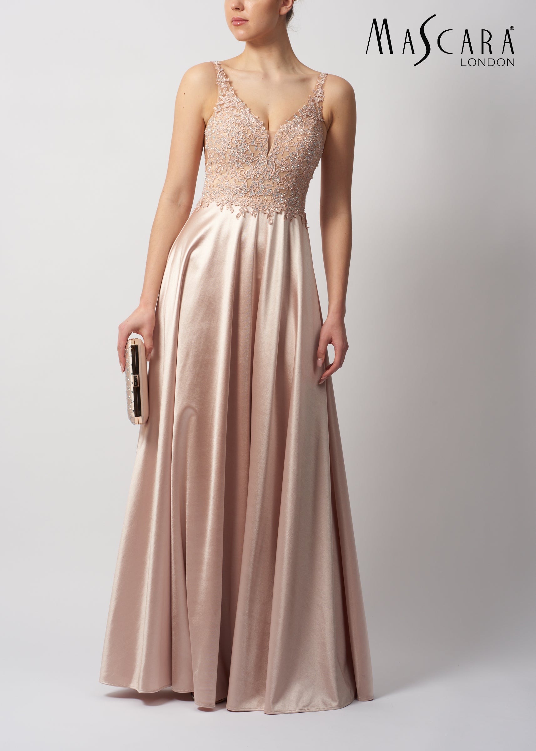 A stunning satin A - line gown featuring a lace embroidered bodice, wide straps and a low scoop back.