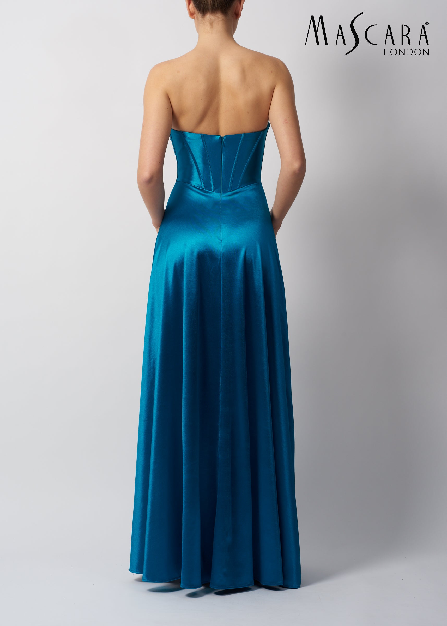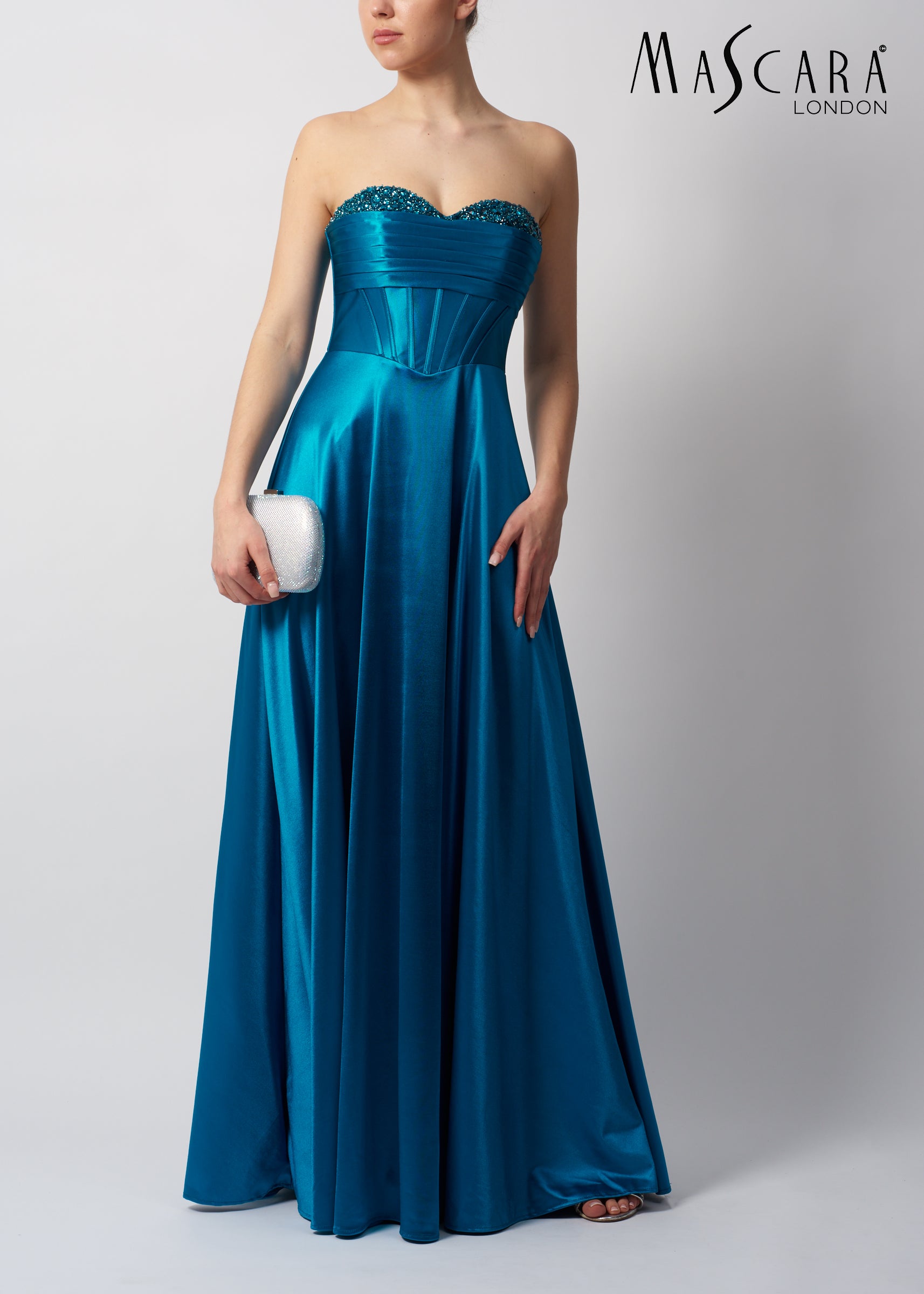 A satin A-line gown with a strapless embellished bodice and a full zip back.