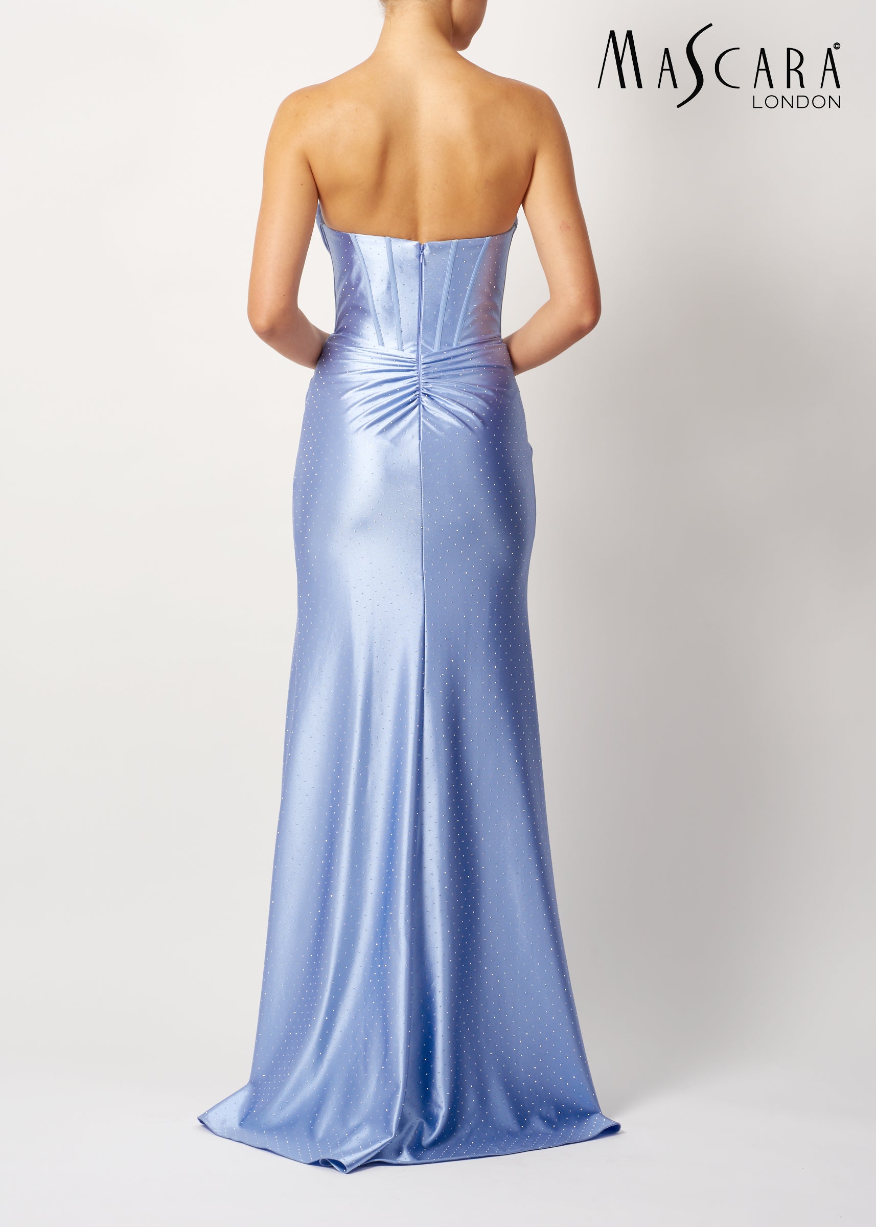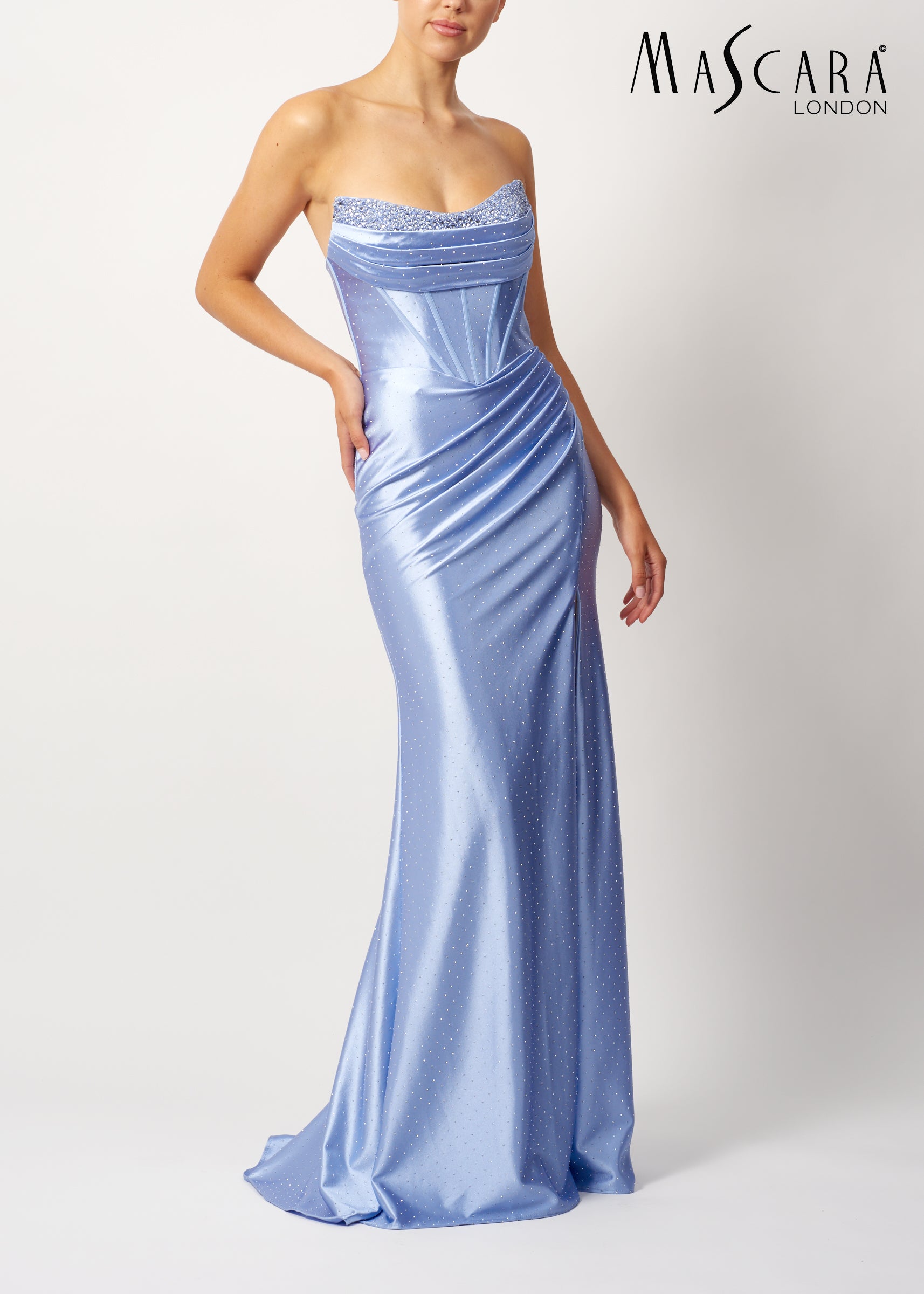 A stunning fitted satin gown with a corset style bodice, diamantes throughout and a leg split.