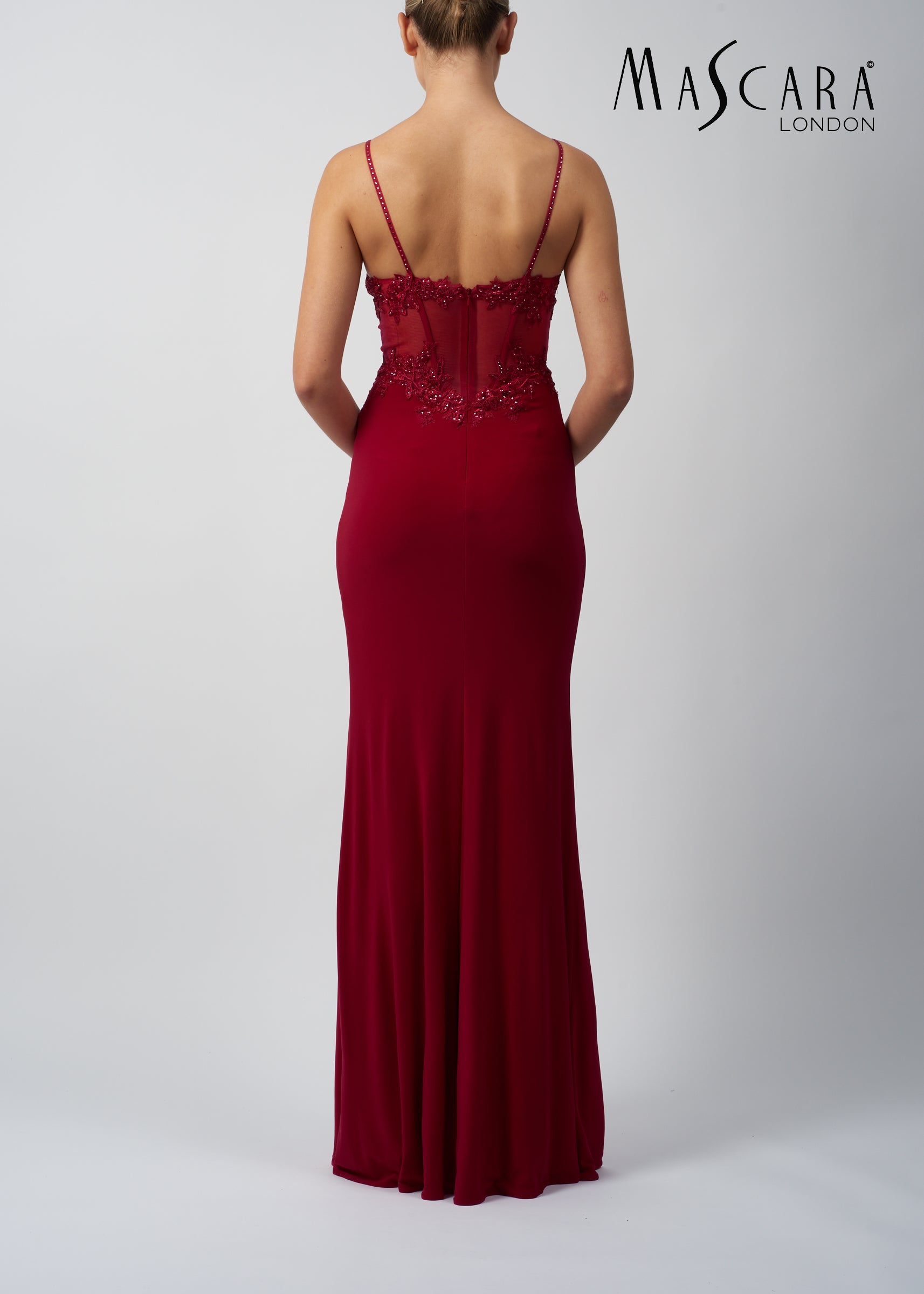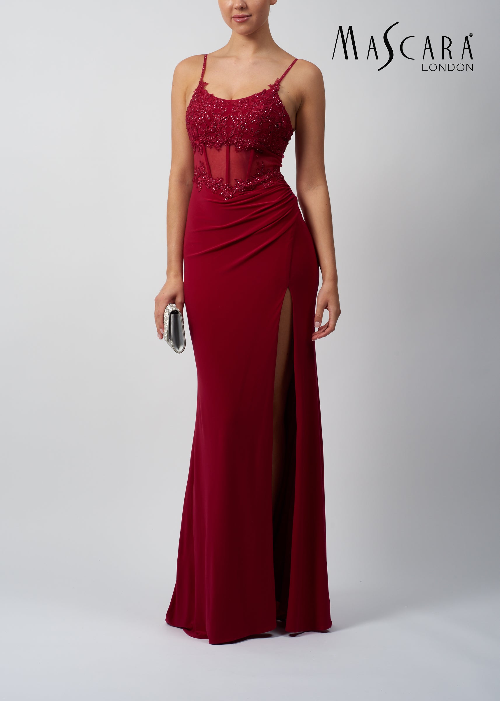 A fitted jersey gown with a mesh corset bodice, lace details and a thigh high split.