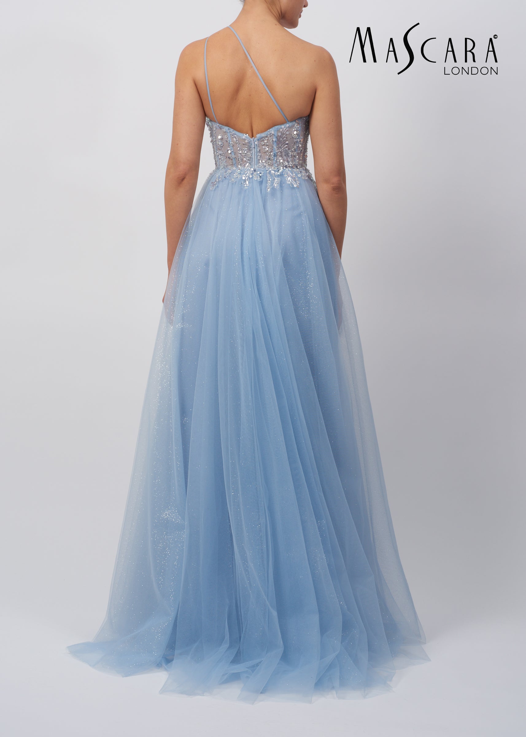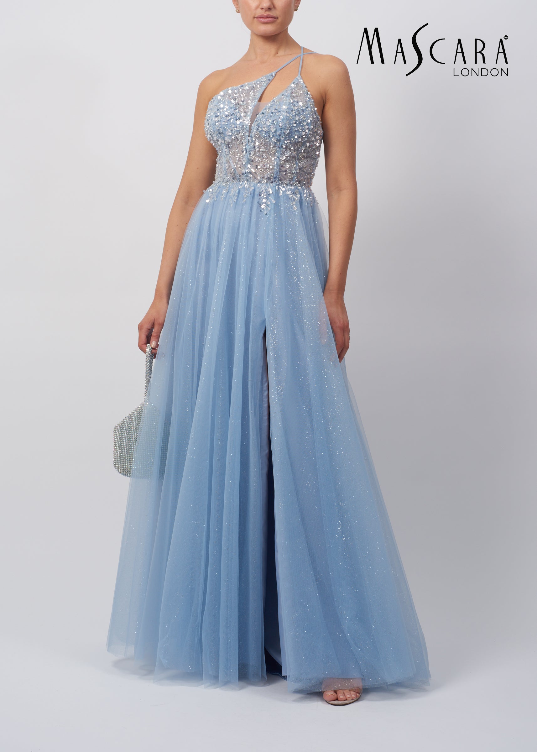 Sparkly A - line gown with asymmetric sequinned bodice, thigh high split and a tulle skirt.