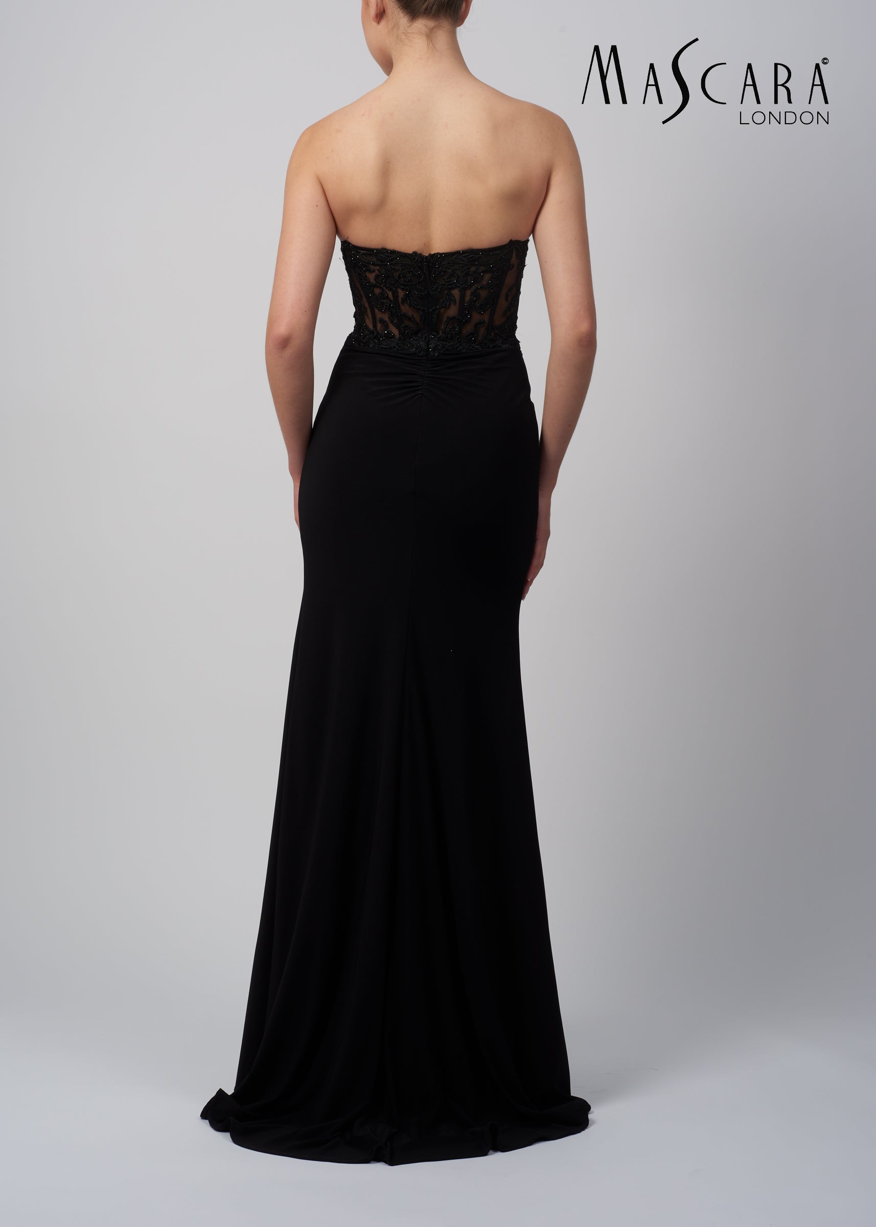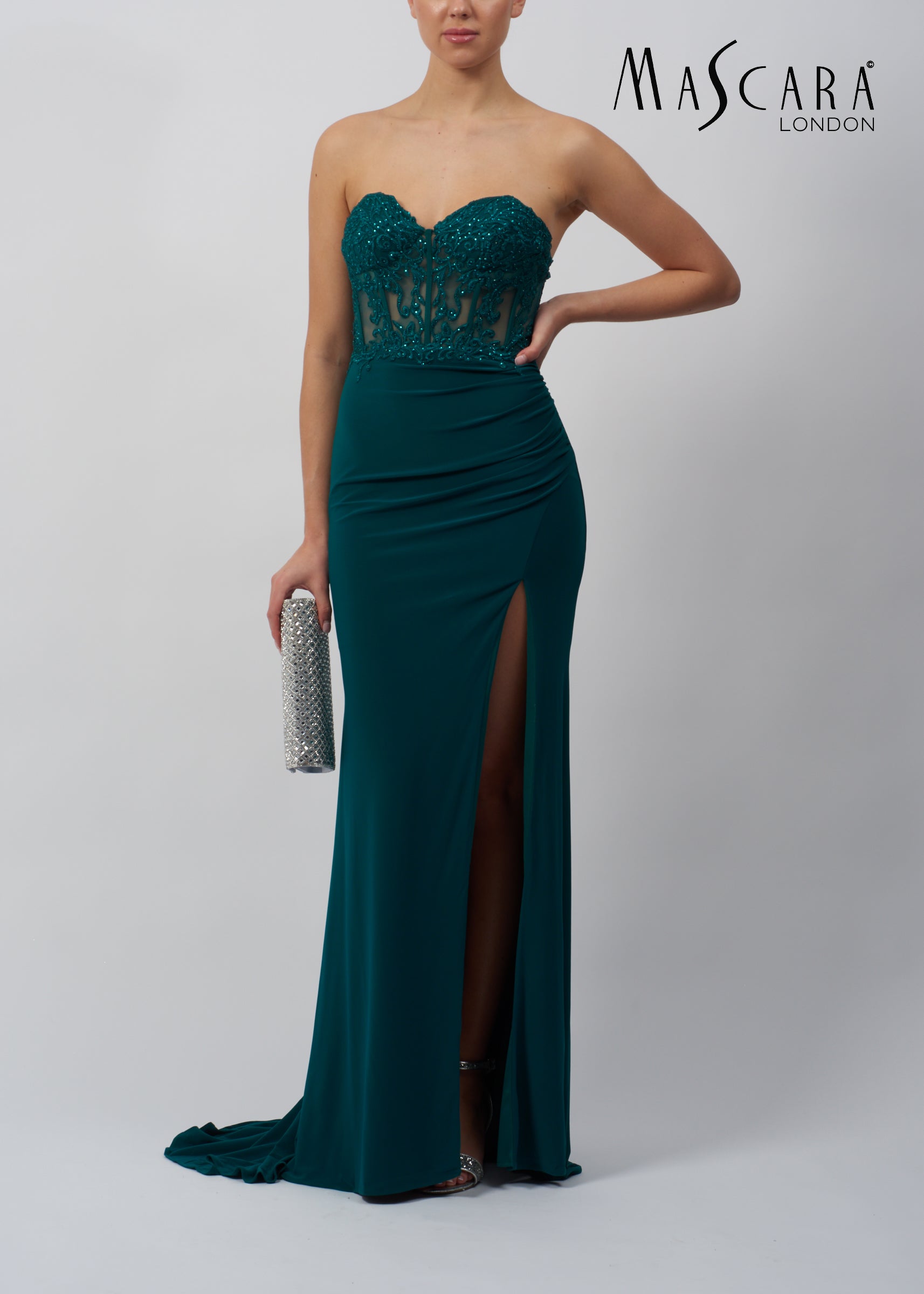 A fitted jersey gown with a lace strapless bodice, front ruching and a thigh high split.