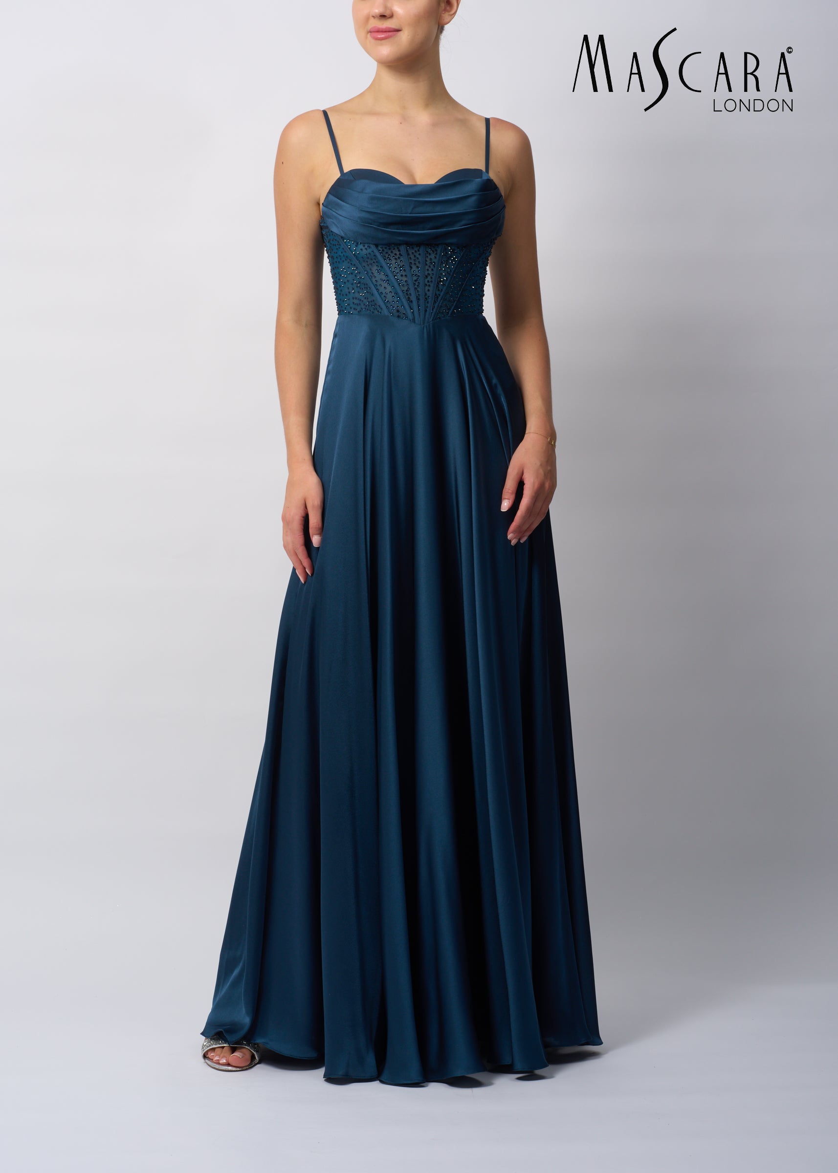 A beautiful satin A - line gown with a corset style bodice, diamantes and a lace up back.