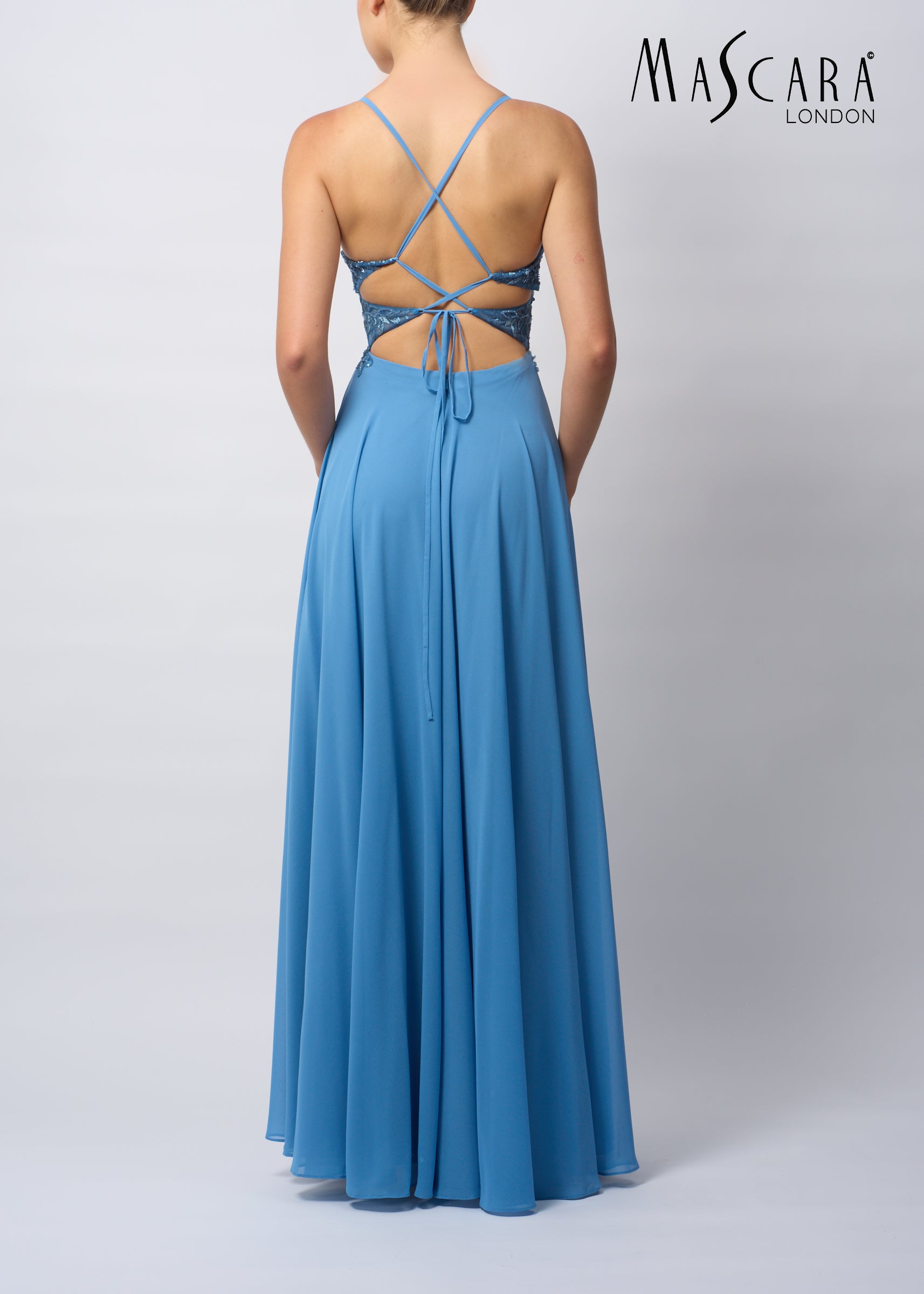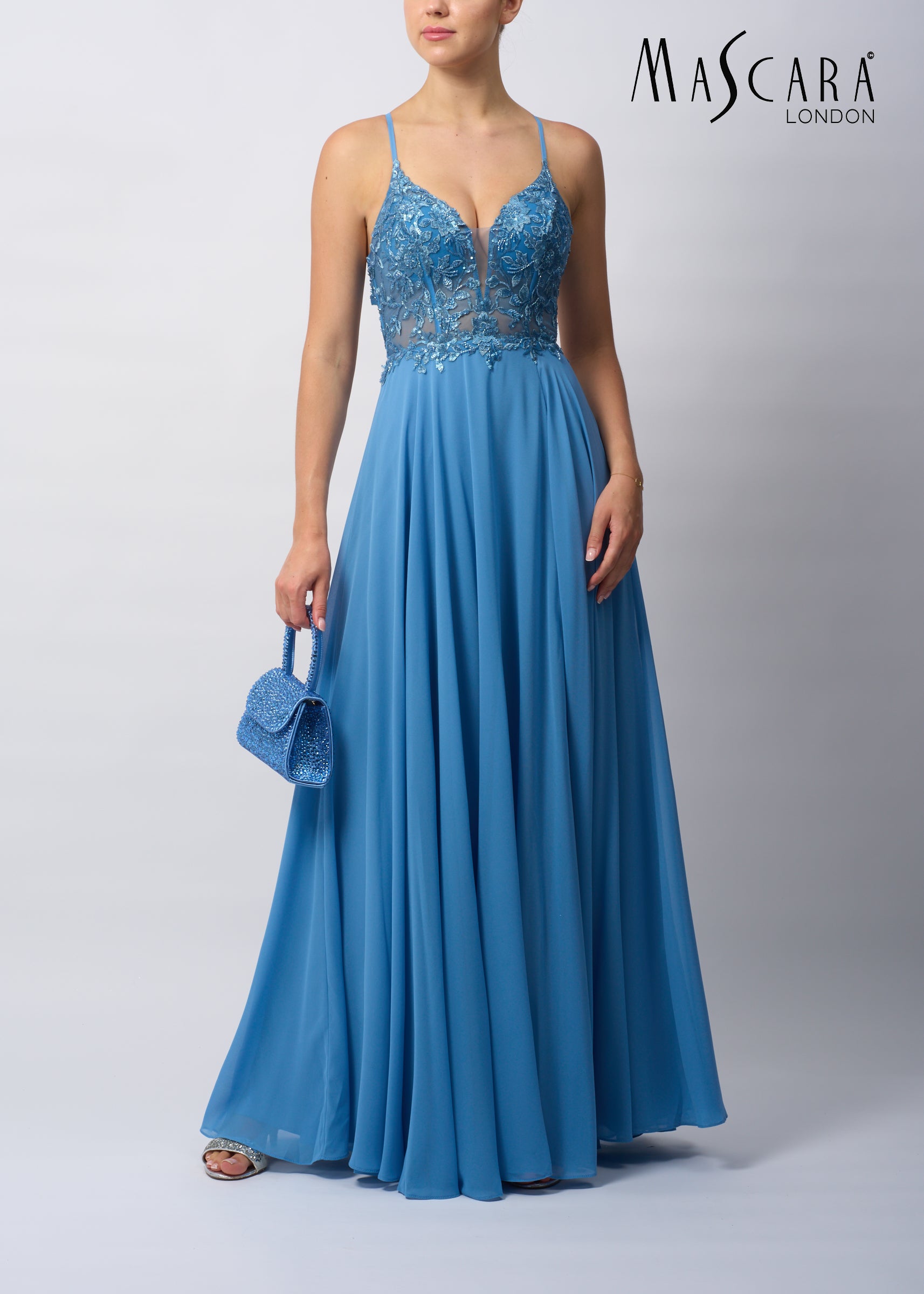 This A-line gown features a lace mesh bodice, strappy back and a floaty chiffon skirt.
