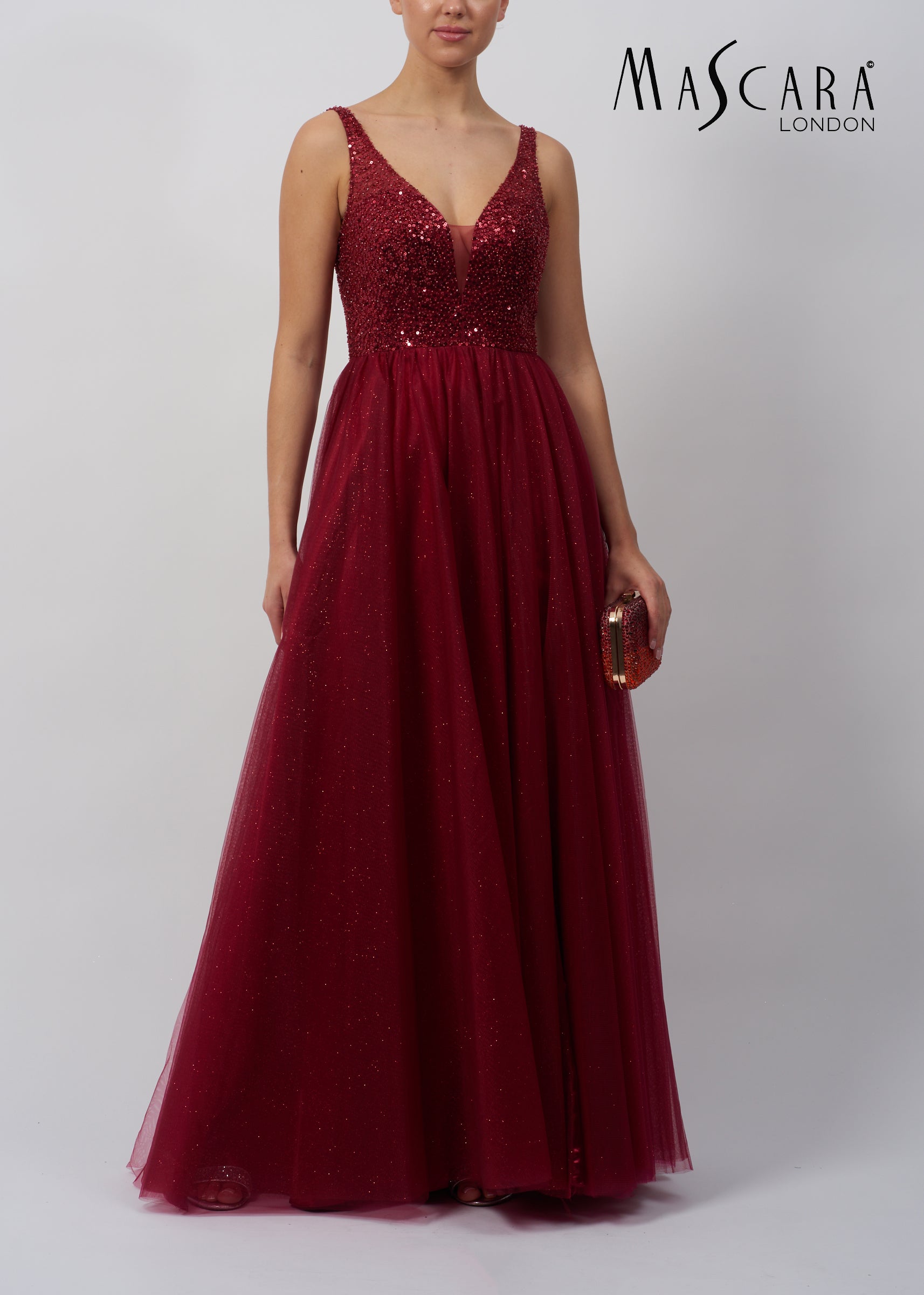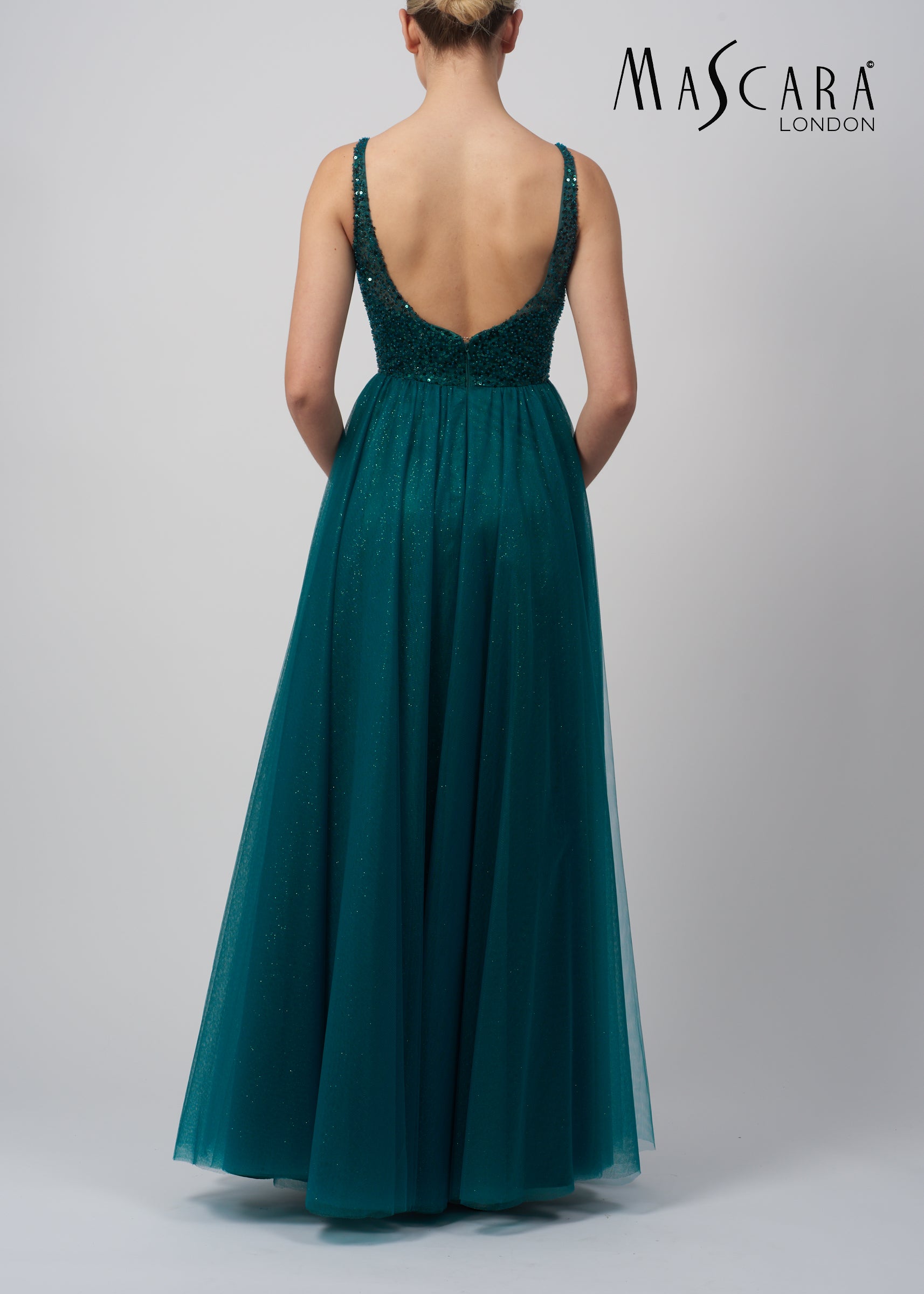 A gorgeous A-line gown with a sequinned bodice, low scoop back and a tulle skirt.
