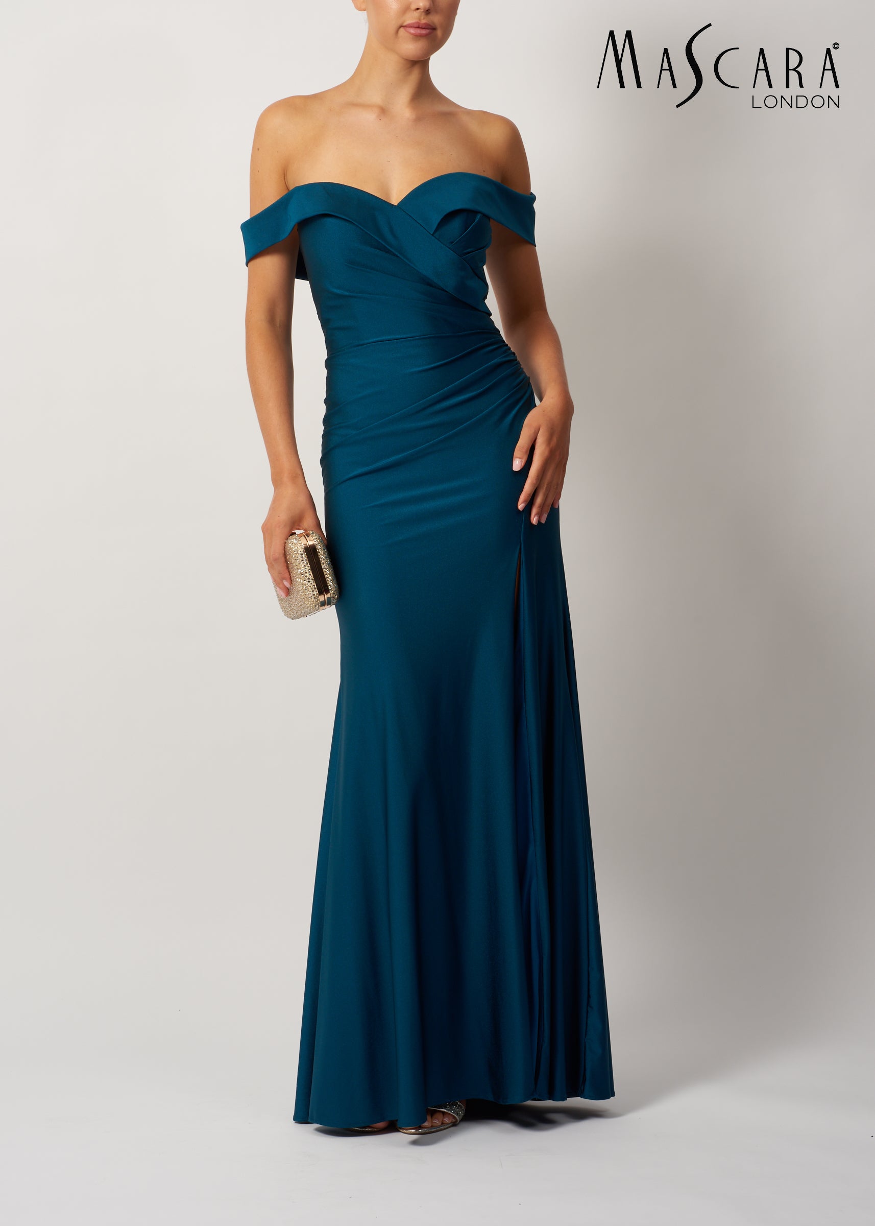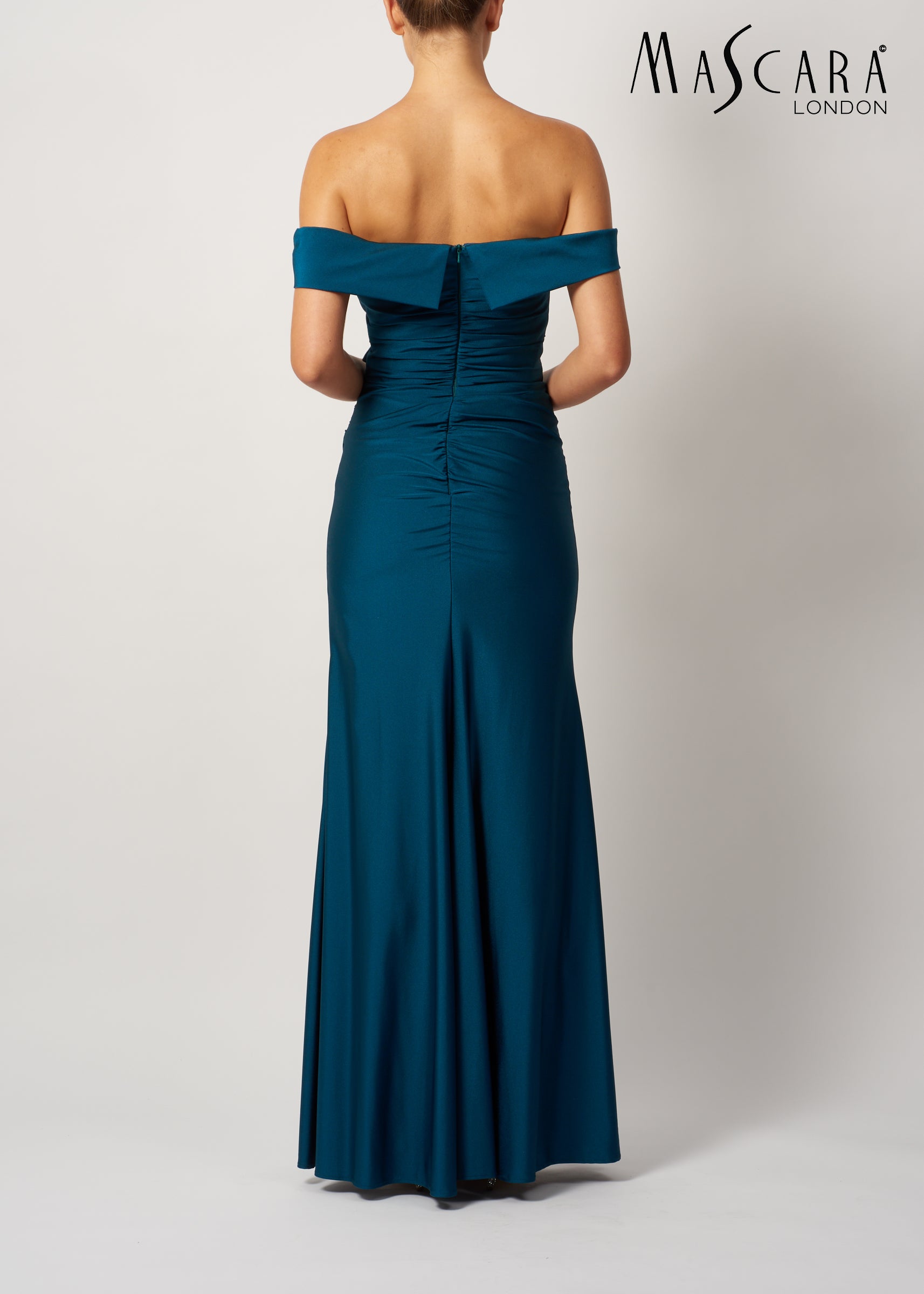 A fitted jersey gown with off the shoulder straps, ruching and a zip back.