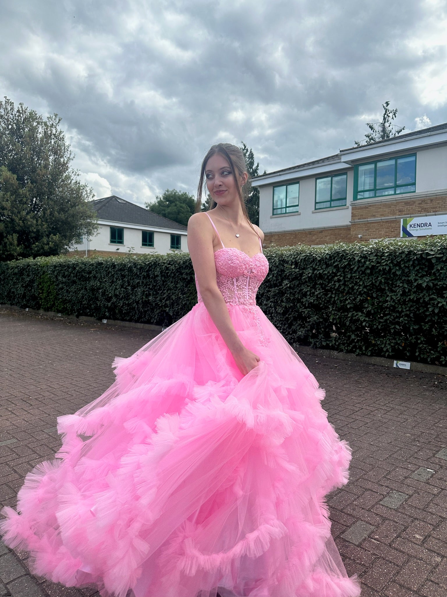 A show stopping tulle ruffle style ballgown with a lace embroidered corset bodice and a tie back.