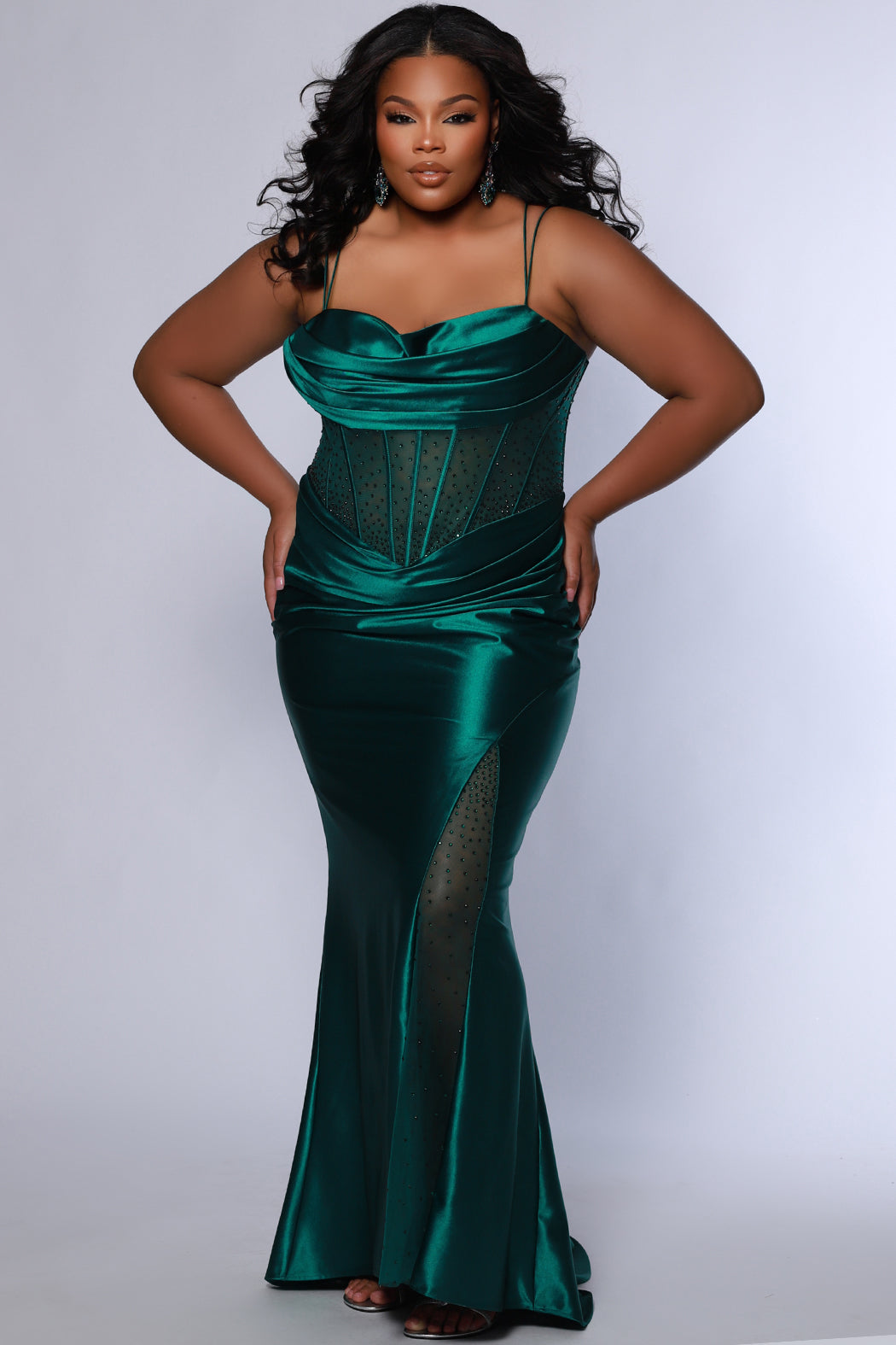 Satin fitted gown with corset style bodice, diamante details throughout and a mesh leg split.